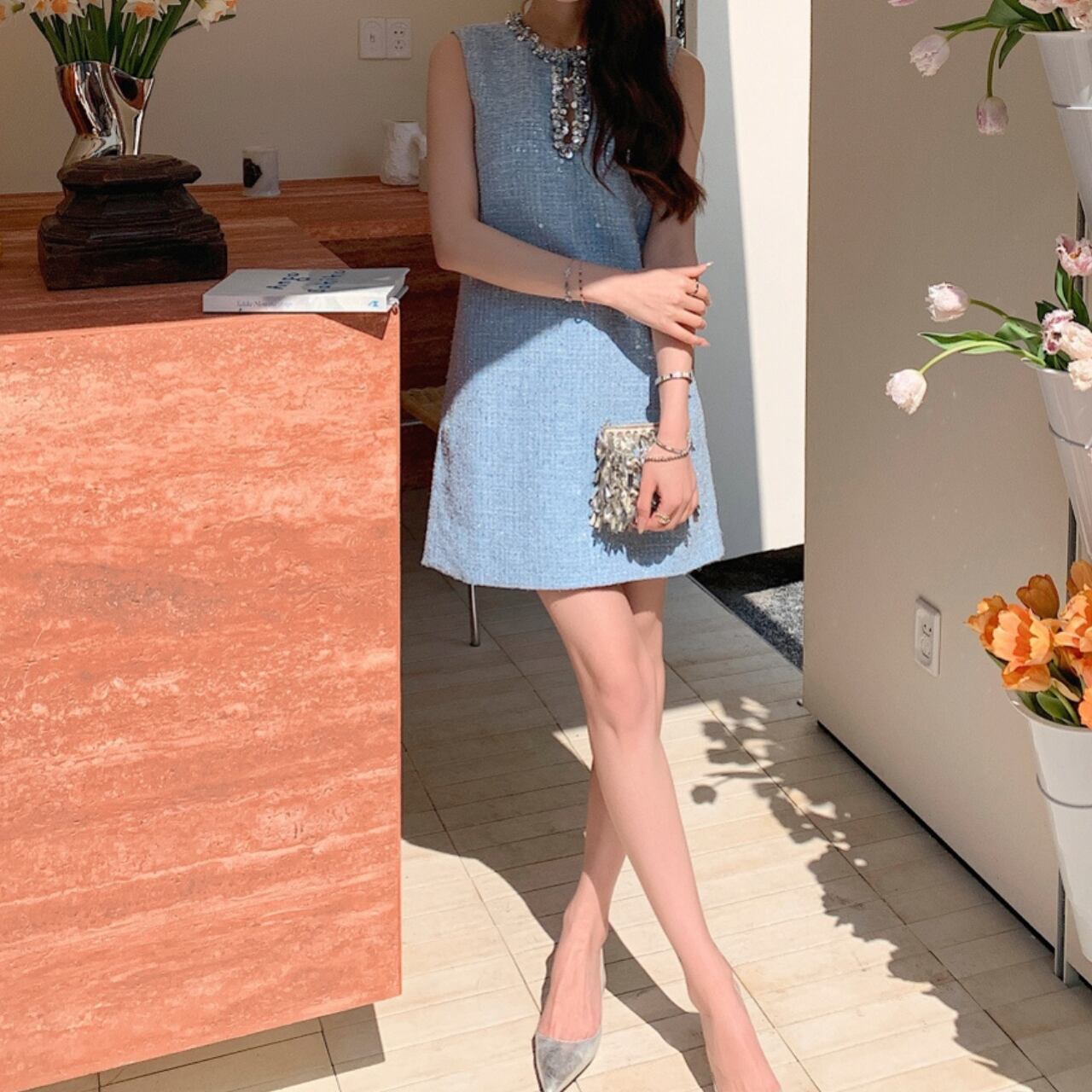 光を受けて輝くスパンコールが施されており、シンプルながらも、コーディネート次第で様々なスタイルを楽しむことができます。