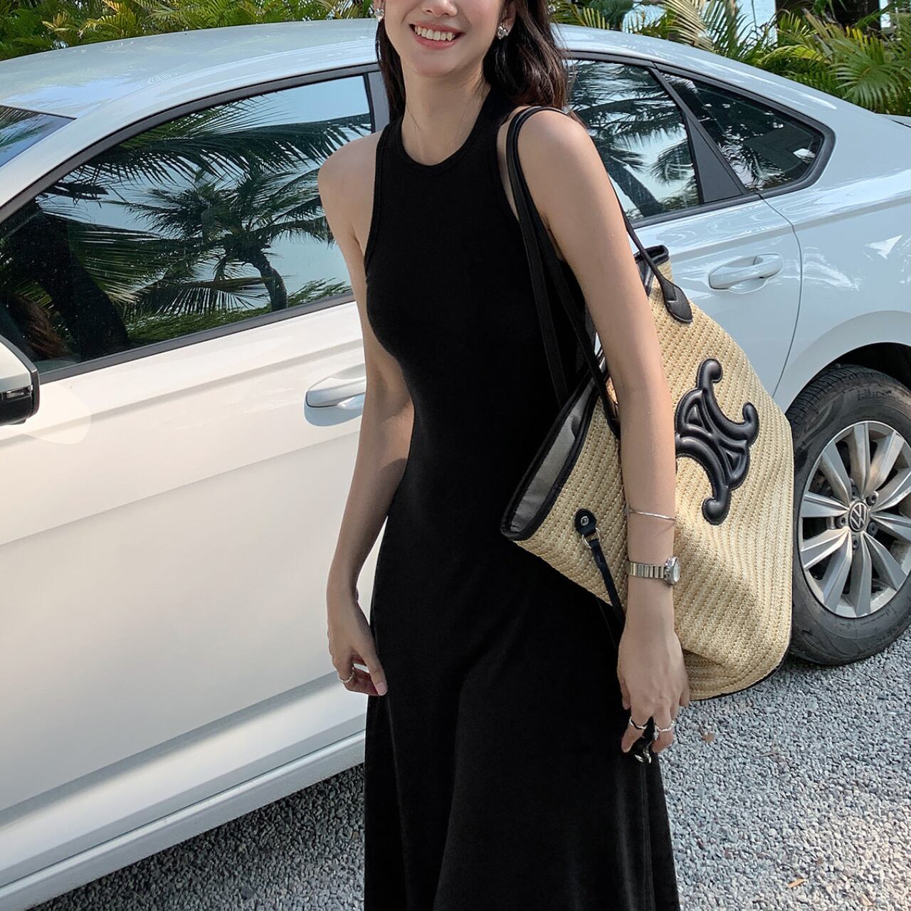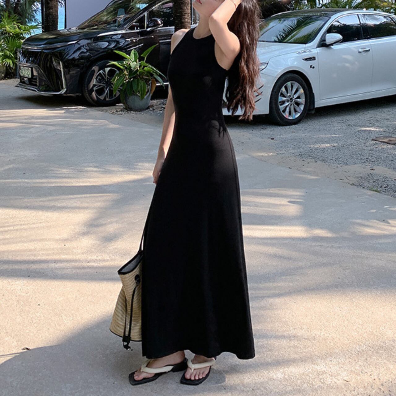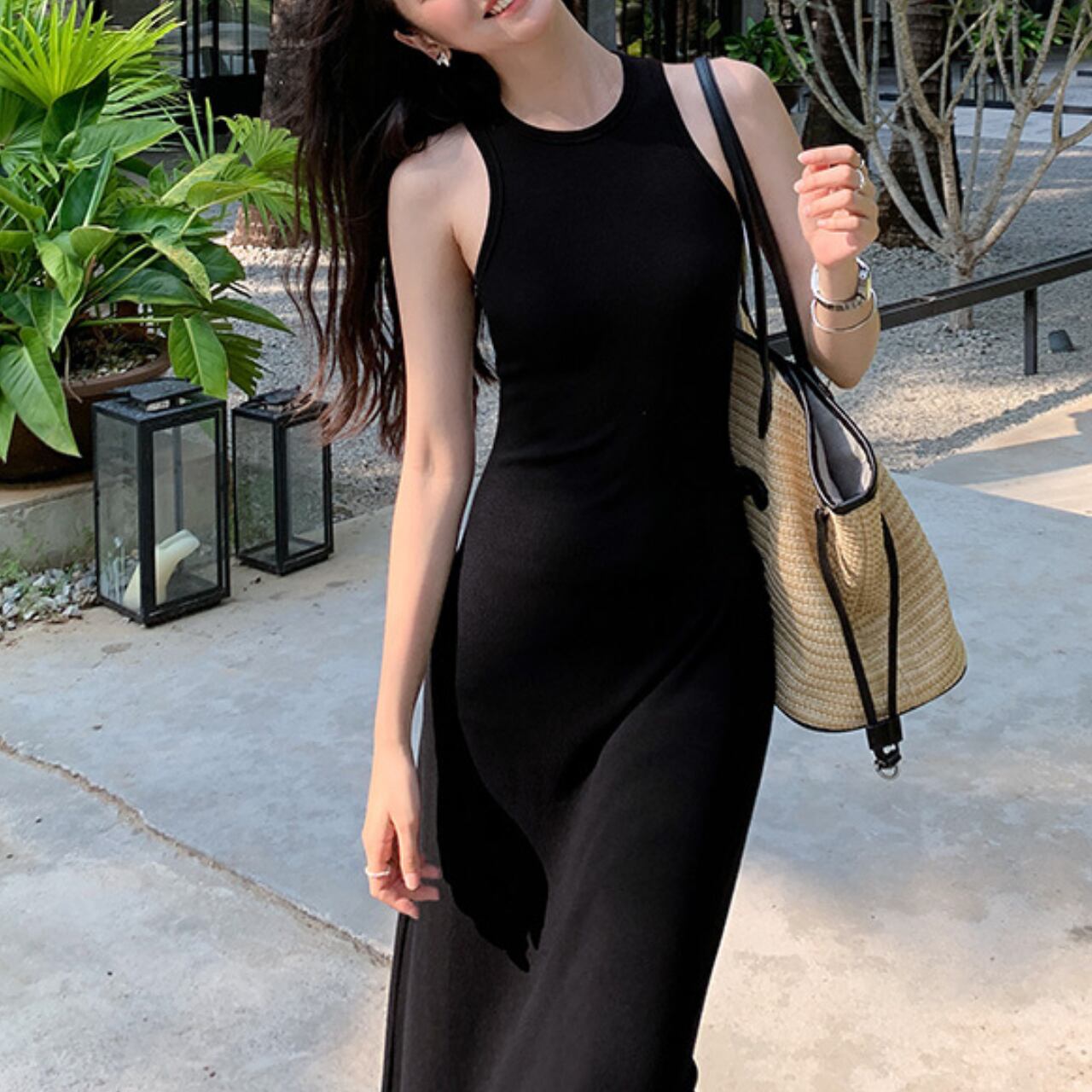 ノースリーブデザインと、柔らかなリブニット素材が魅力のAラインワンピースです。女性らしいシルエットを引き立てます。