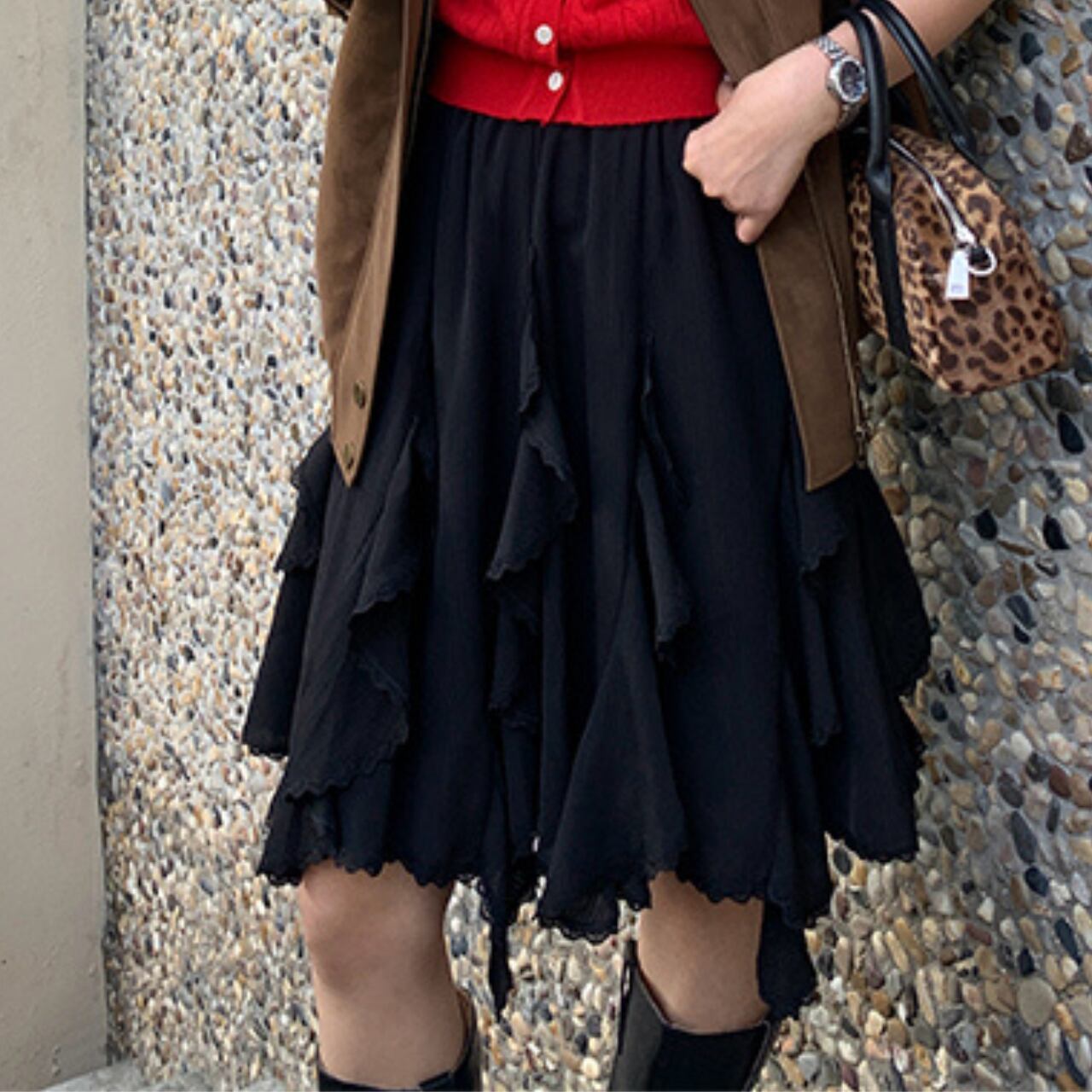 華やかなフリルレースとパッチワークデザインが特徴的なひざ丈スカートです。ウエストはゴム仕様で、快適な着心地を実現。さらに、パッチワークのデザインが独特の魅力を引き立ててくれます。