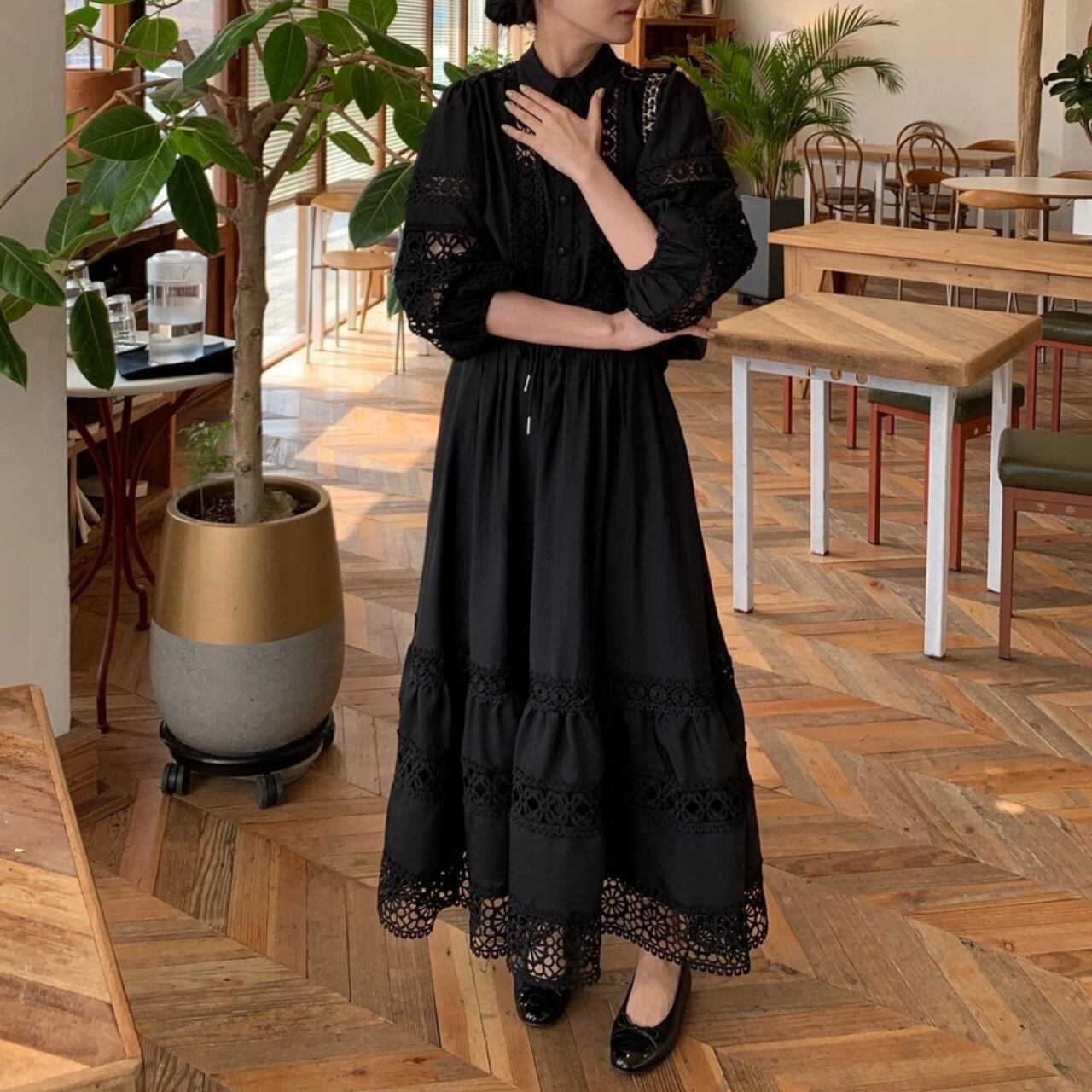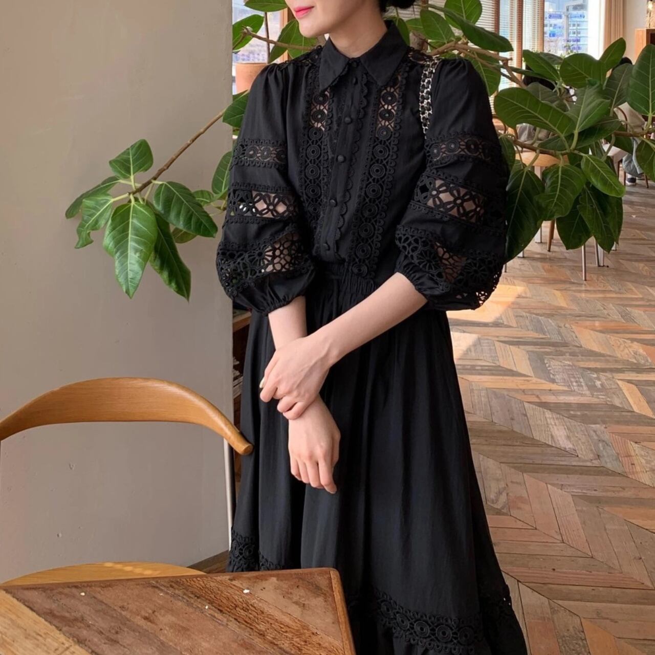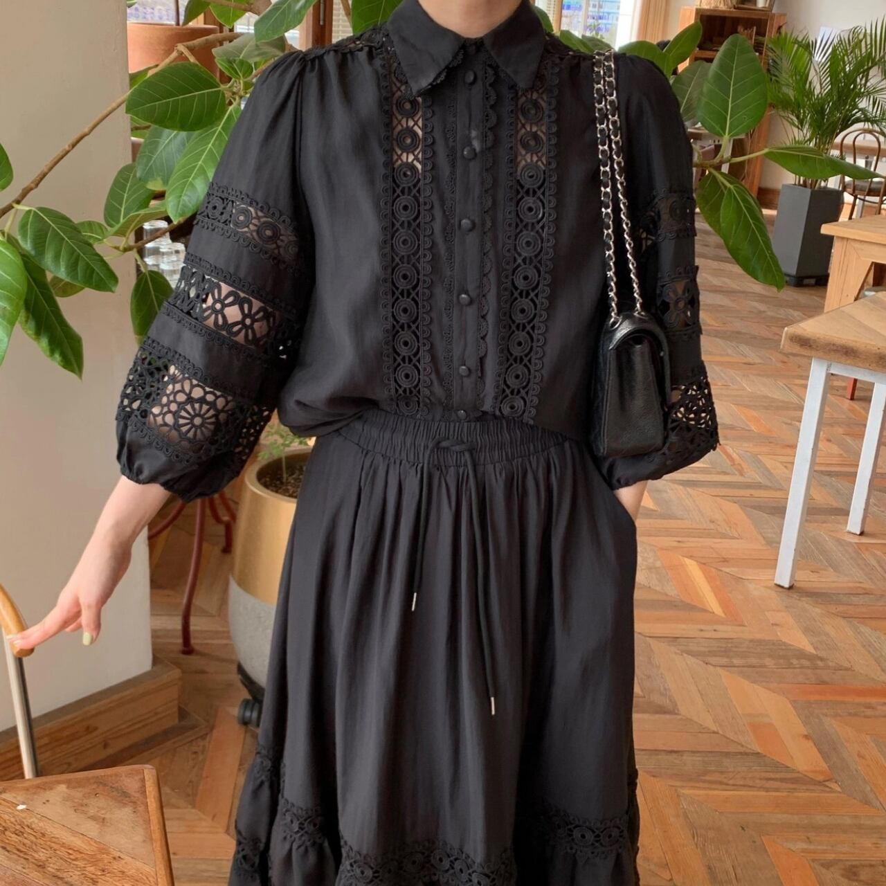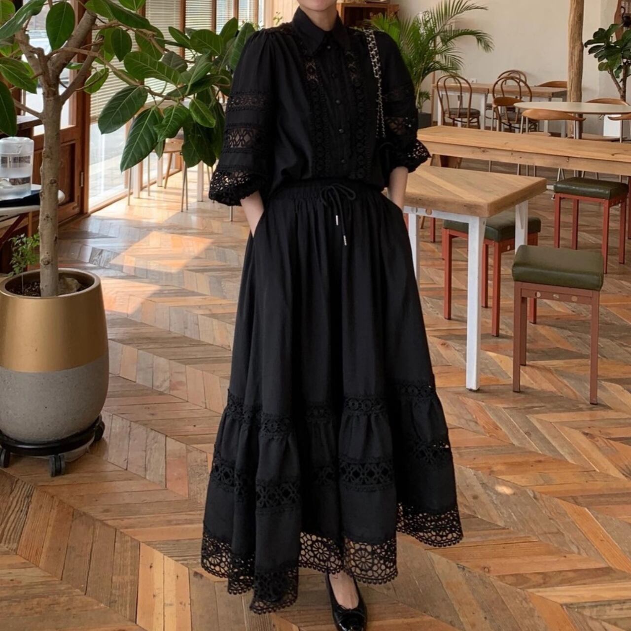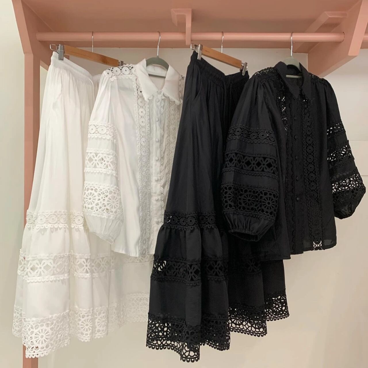 華やかなフレンチレトロな雰囲気のレースブラウスとスカートのセットアップです。セットでも単品としてもご着用頂けるのでコーディネートの幅も広がります。