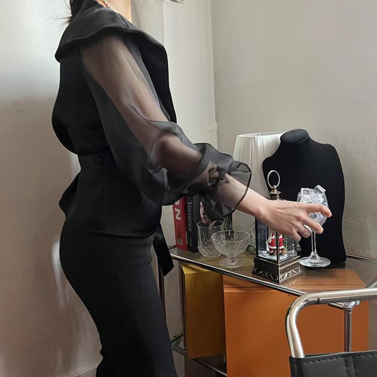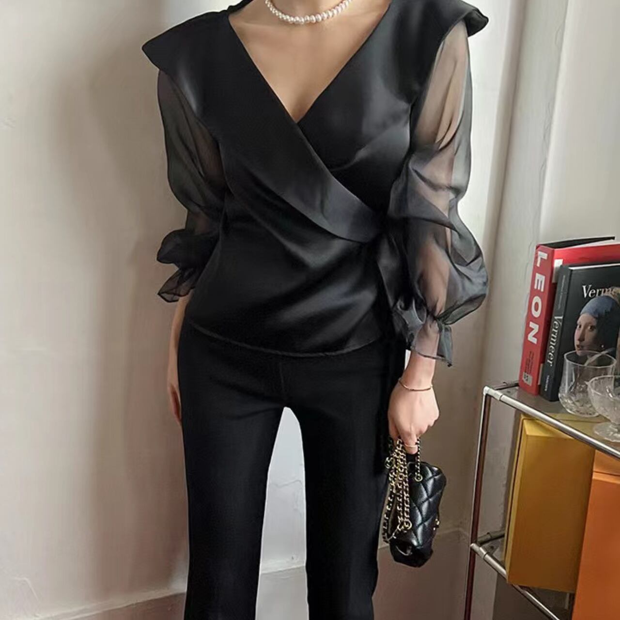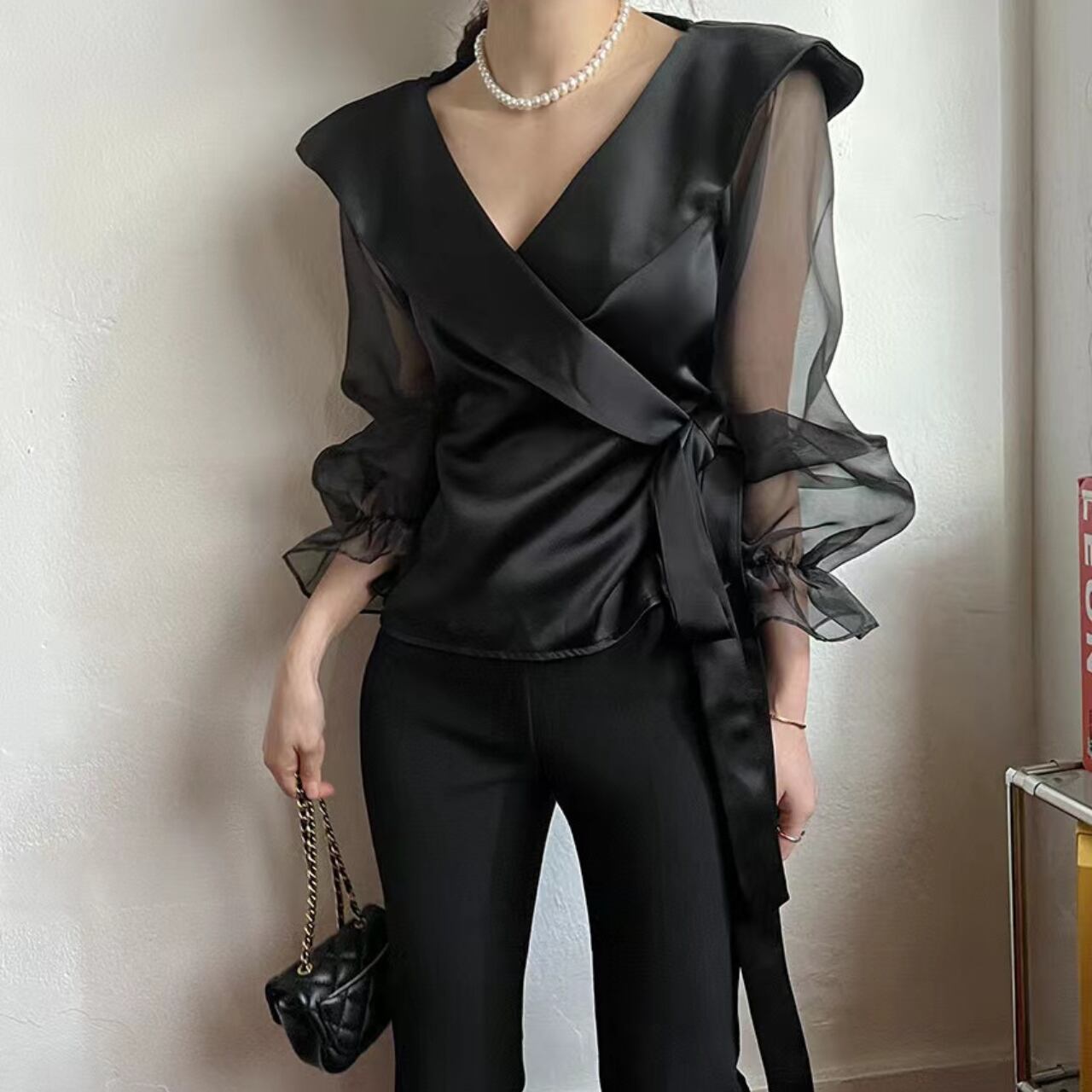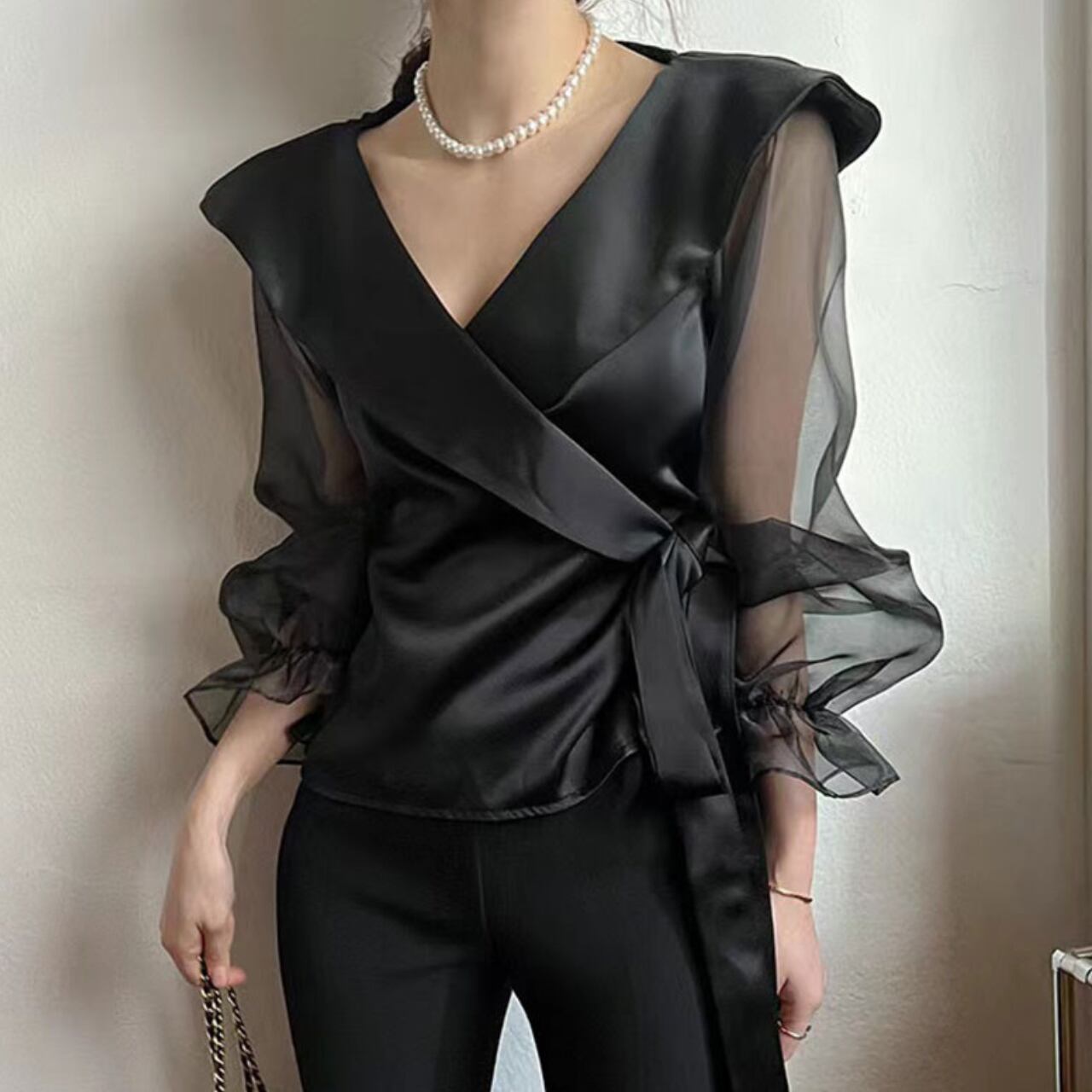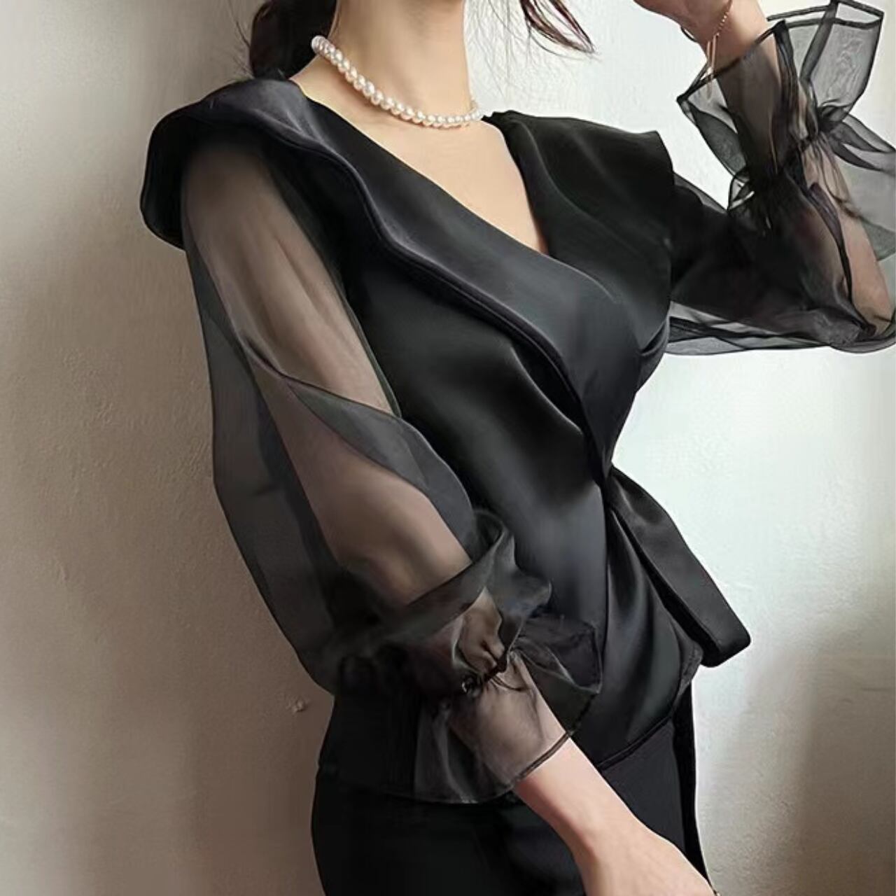 エレガントで洗練された印象を与えるブラウスです。軽やかなシアー素材が特徴で、透け感がありつつも上品さを保てる一着です。