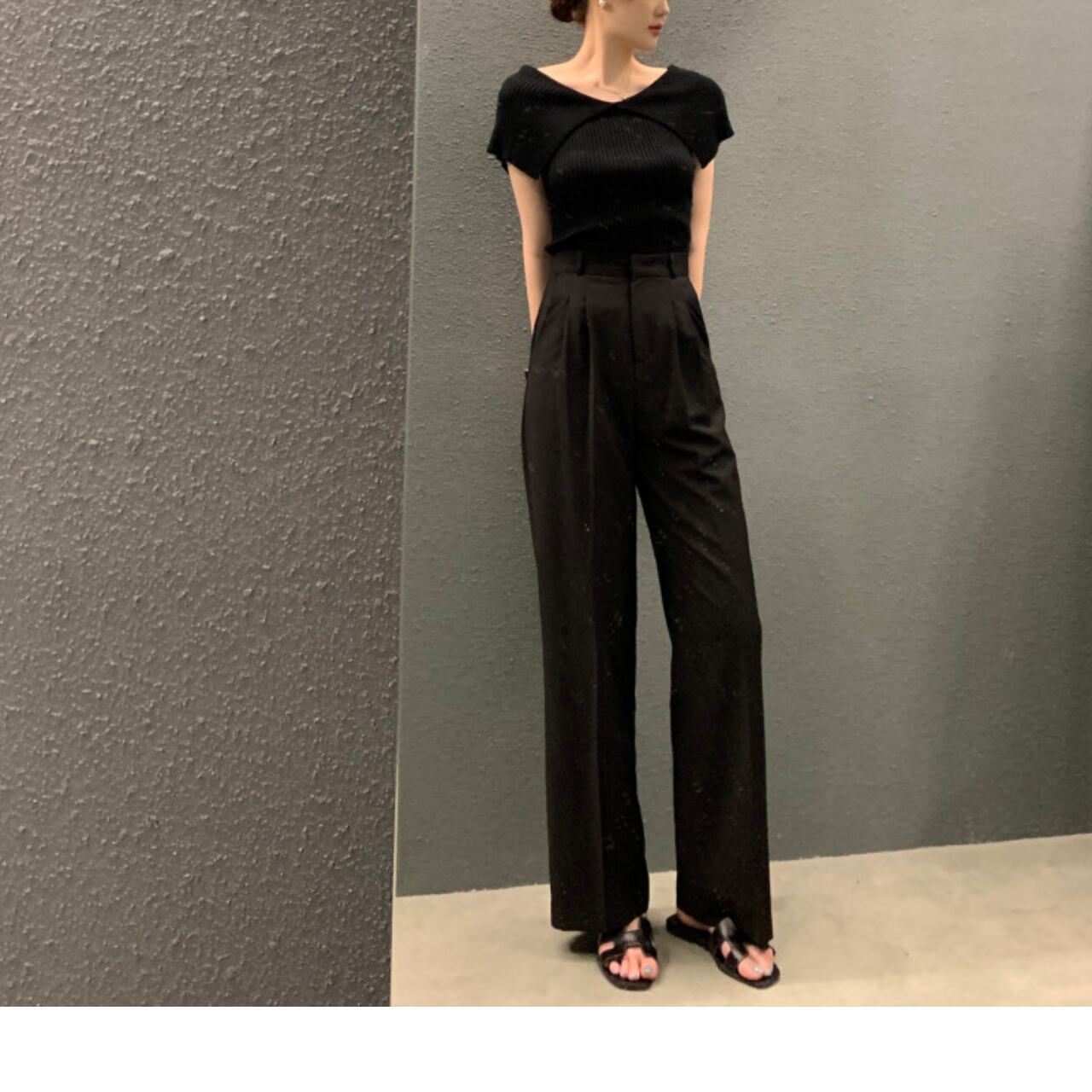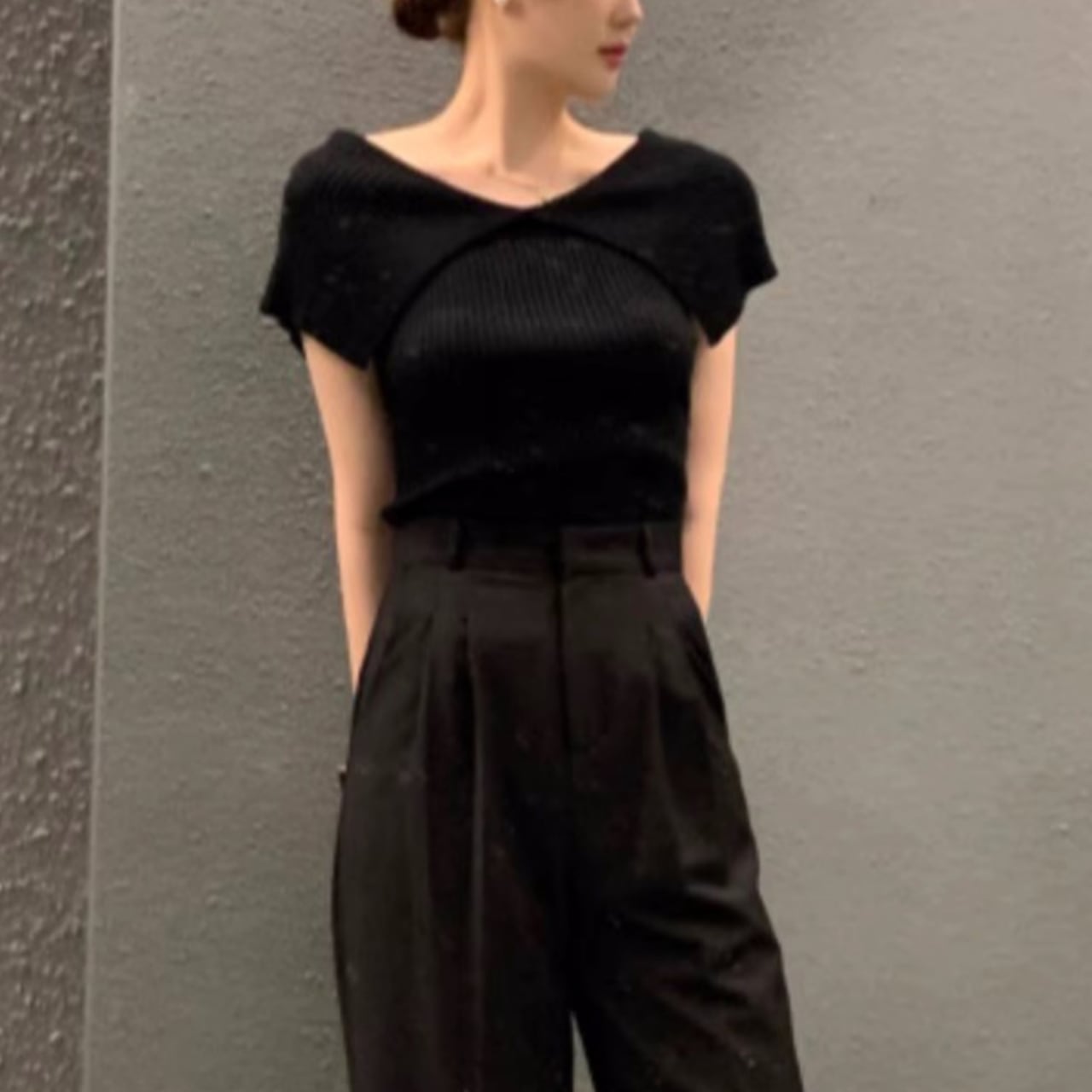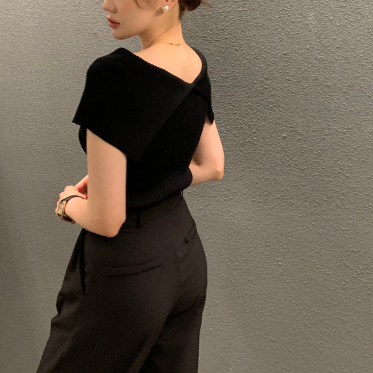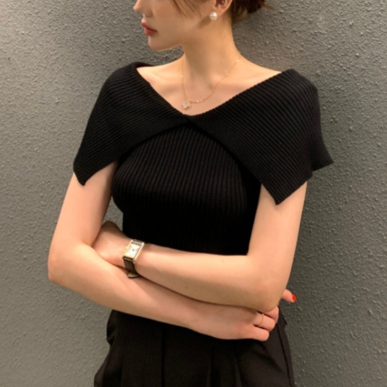ストレッチ性のある着心地も快適なリブニット素材のトップスです。肩にかかるビッグカラーはさりげなく二の腕をカバーしてくれるのがポイント。
