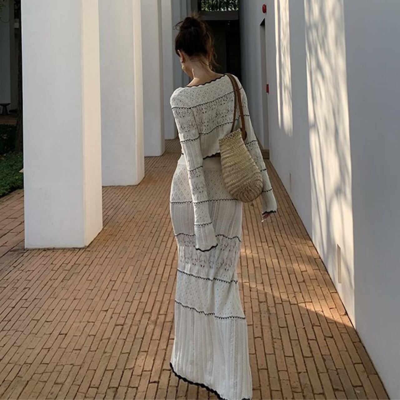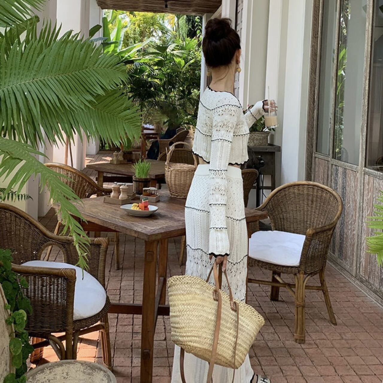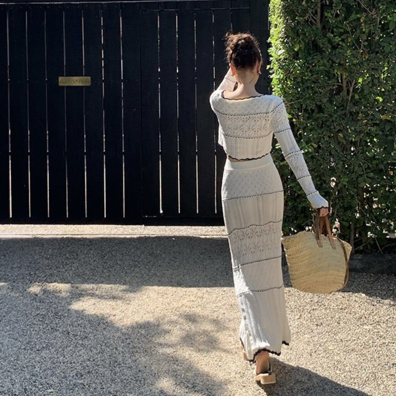 パイピングデザインが魅力のクロシェニットセットアップです。ロングスカートはマーメイドシルエットでレディな印象を与えます。