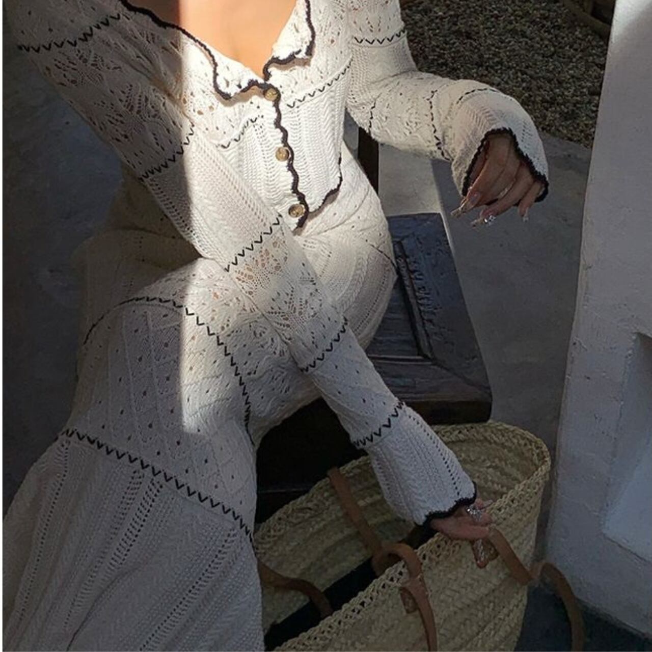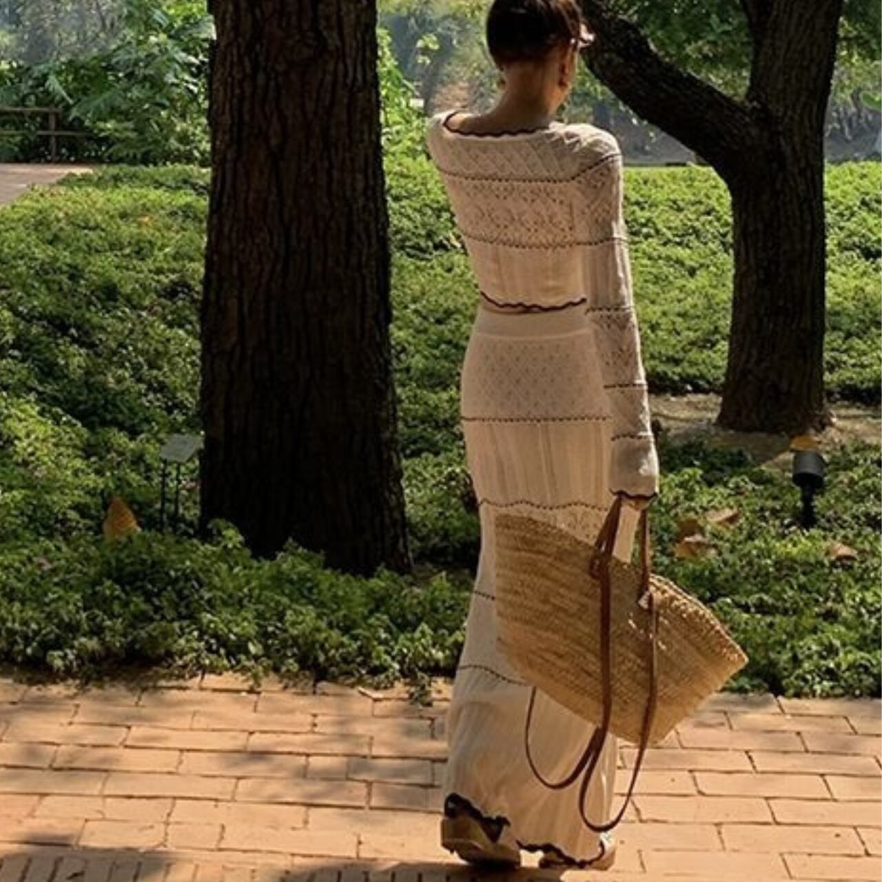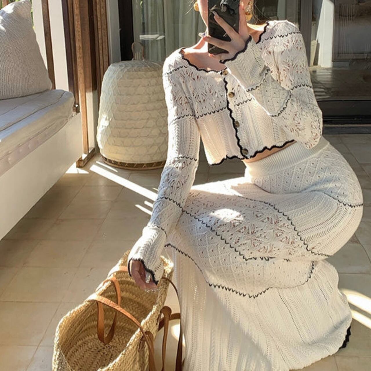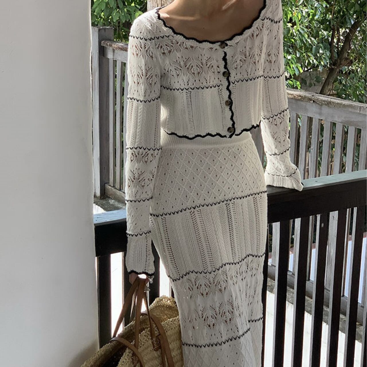パイピングデザインが魅力のクロシェニットセットアップです。ロングスカートはマーメイドシルエットでレディな印象を与えます。
