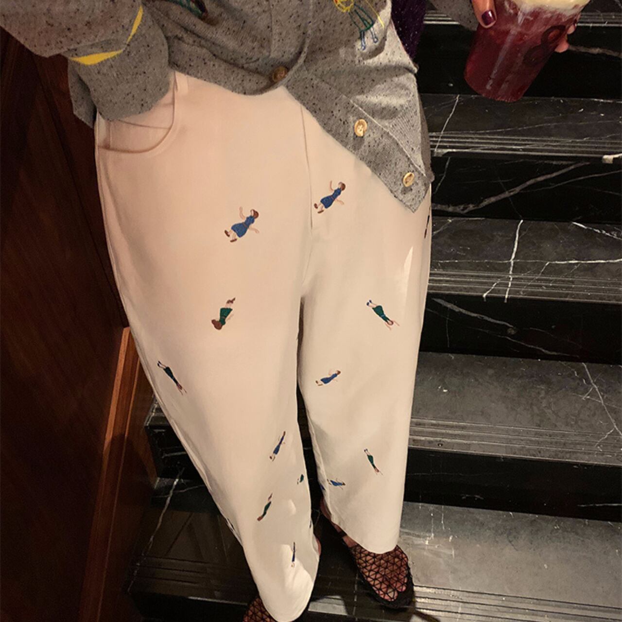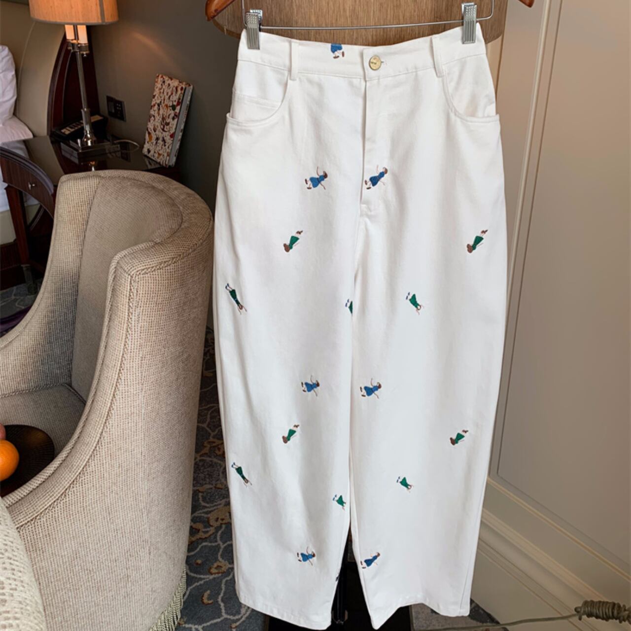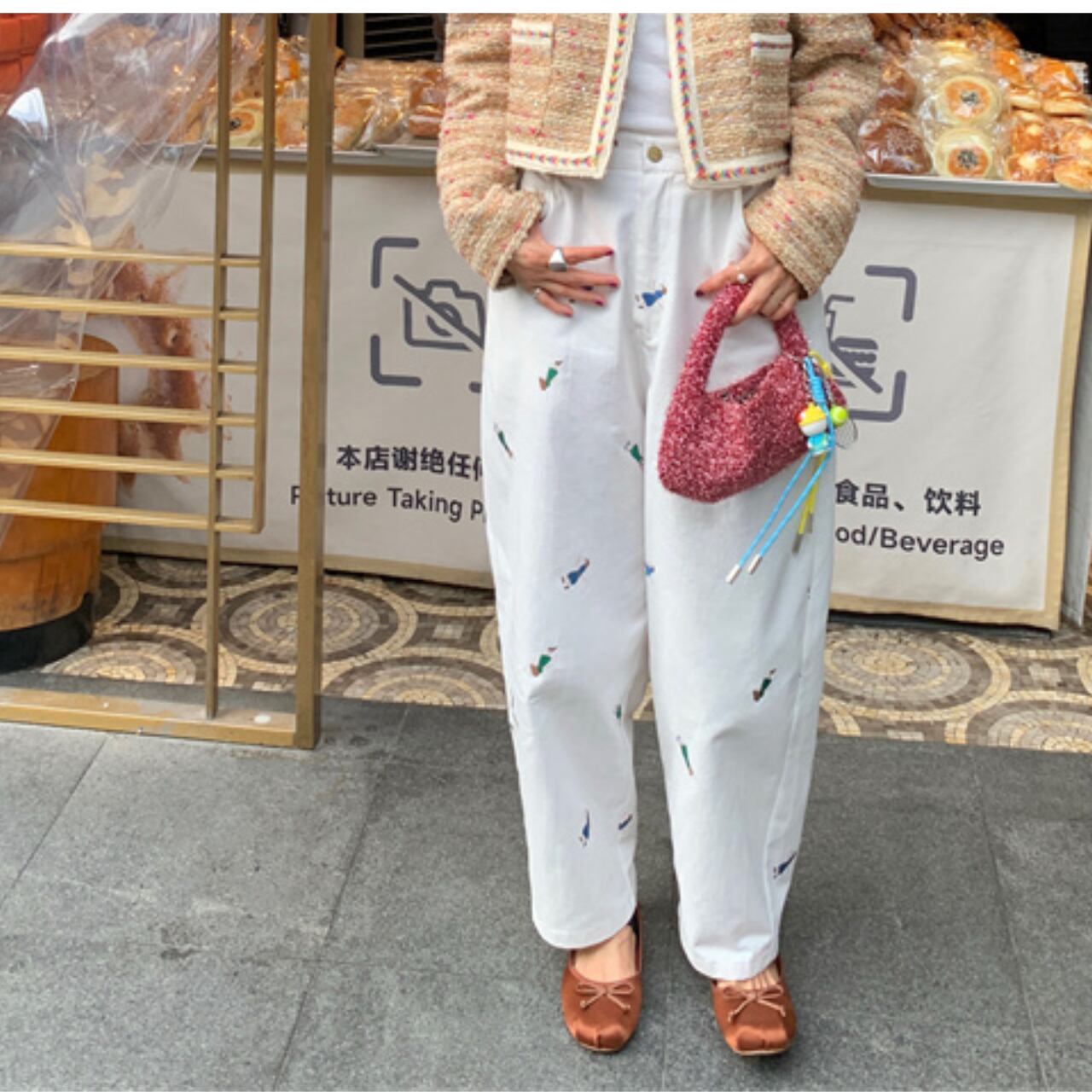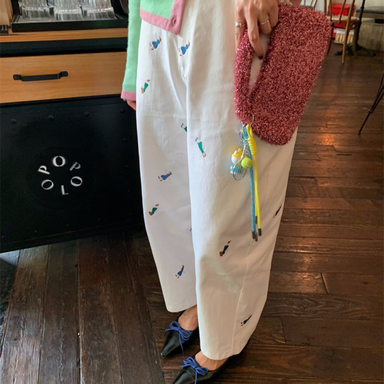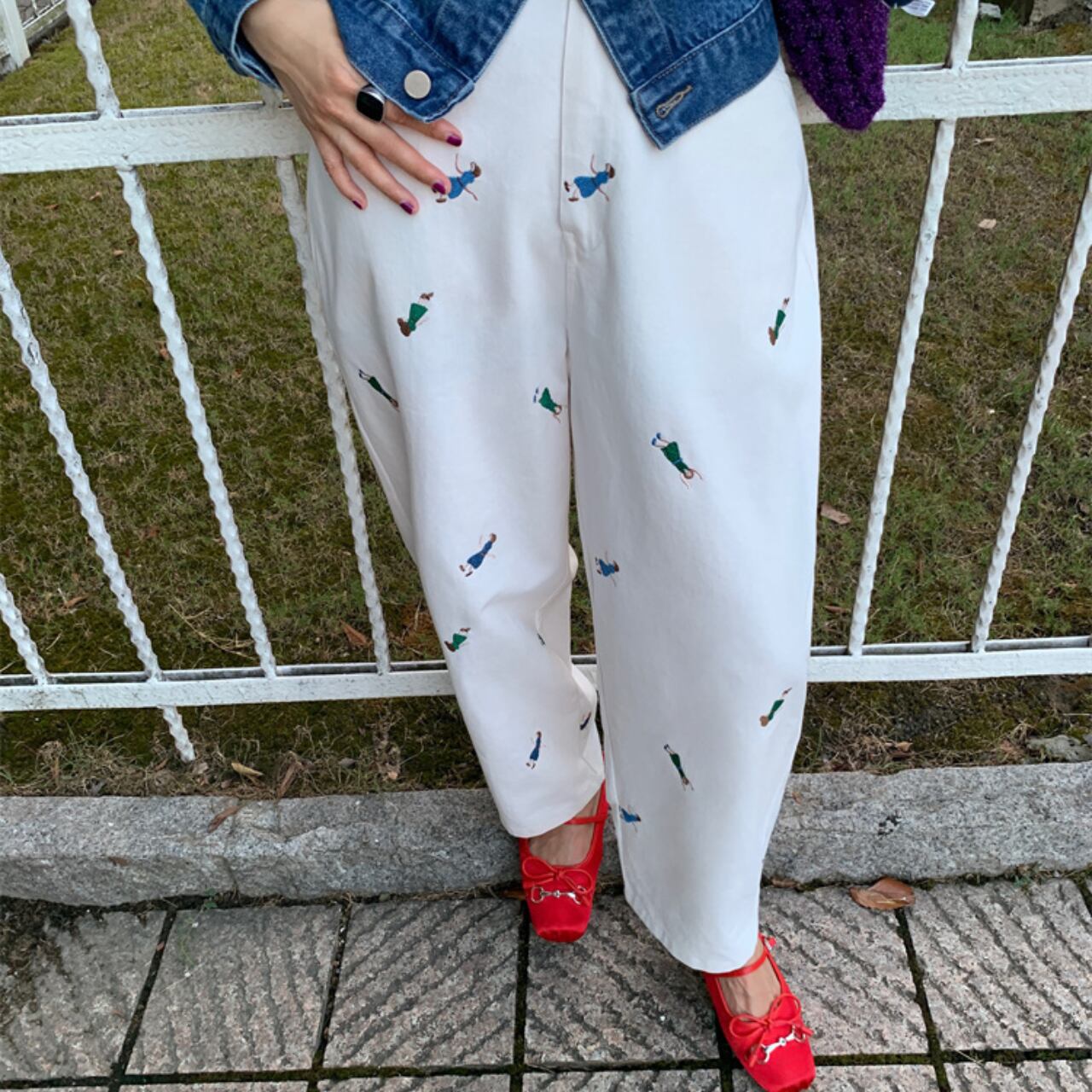 清潔感のあるホワイトベースに、遊び心のある刺繍が散りばめられた、とびきりキュートなパンツ。ブルーとグリーンの爽やかな色合いの刺繍が、シンプルなホワイトパンツを一気に個性的でスタイリッシュなアイテムに変身させます。程よいゆとりのあるシルエットで履き心地も抜群。画像のようにミントグリーンとピンクのカーディガンでキュートにまとめたり、白いシャツでクリーンに仕上げたりと着回し自在。スニーカーでカジュアルに、ローファーで上品に、サンダルでリゾート感をプラス。バッグや小物でカラーリンクさせれば、さらにコーディネートがまとまります。