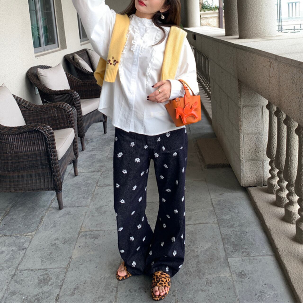 デイジー刺繍 ワイドレッグストレートパンツ A4159