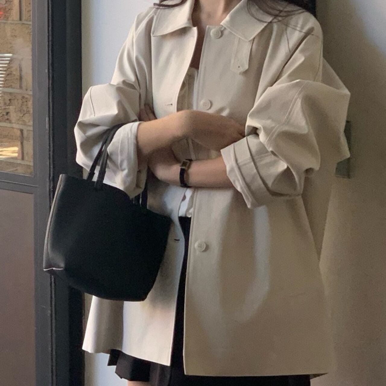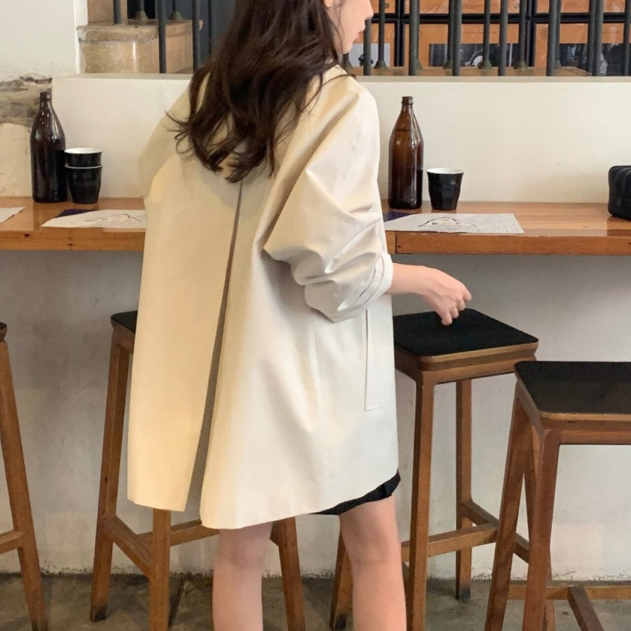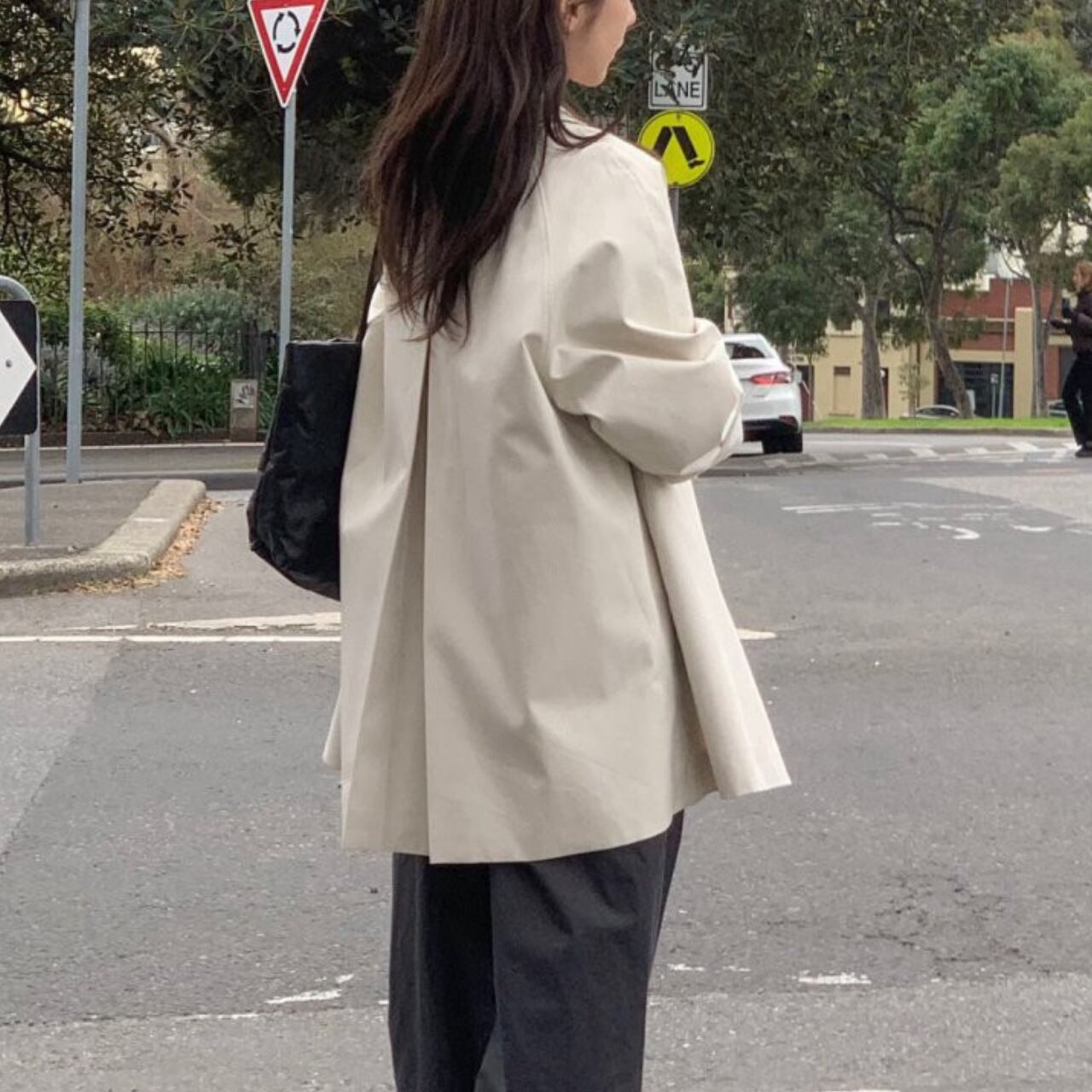 黒のブラウスとスラックスの上に羽織って、クラシックなオフィススタイルに。カジュアルなニットやデニムに合わせれば、リラックスした休日スタイルも大人っぽく仕上がります。ロングブーツでモードに、スニーカーでカジュアルに、パンプスでエレガントにと、足元次第で印象は自在に変化してくれます。冬までの羽織り問題もこの一着があればすべて解決してくれるアイテムです。