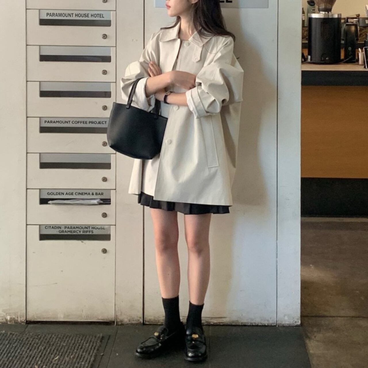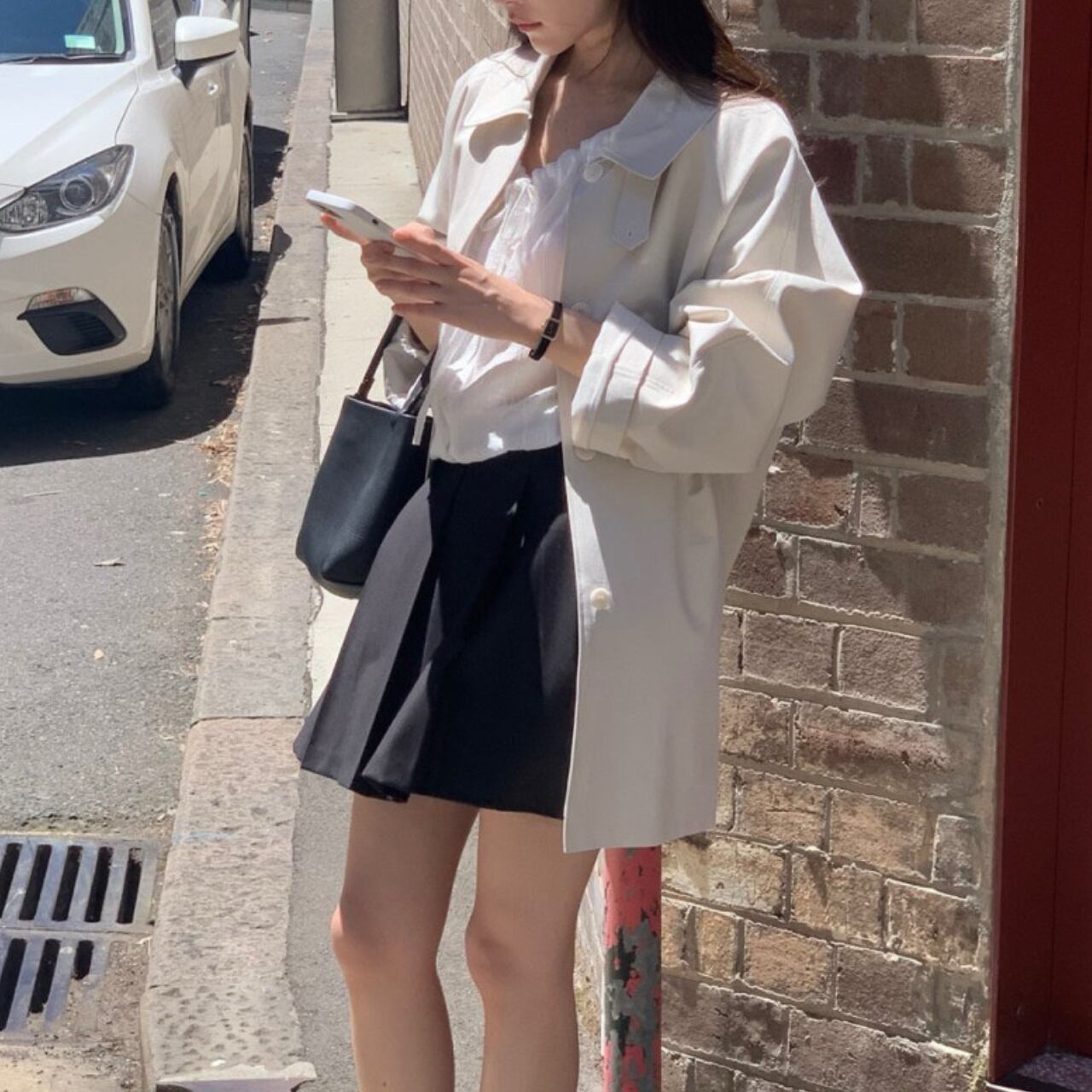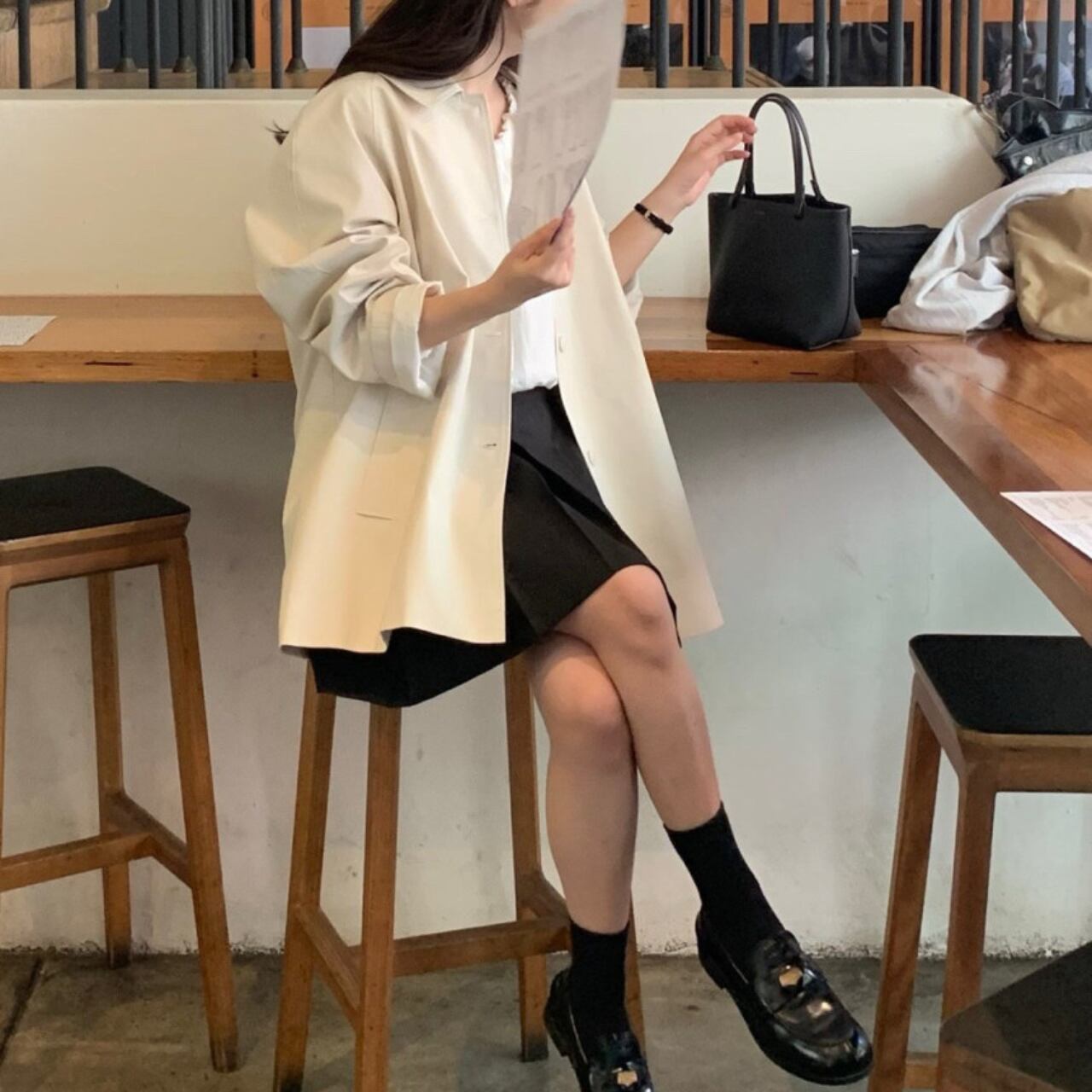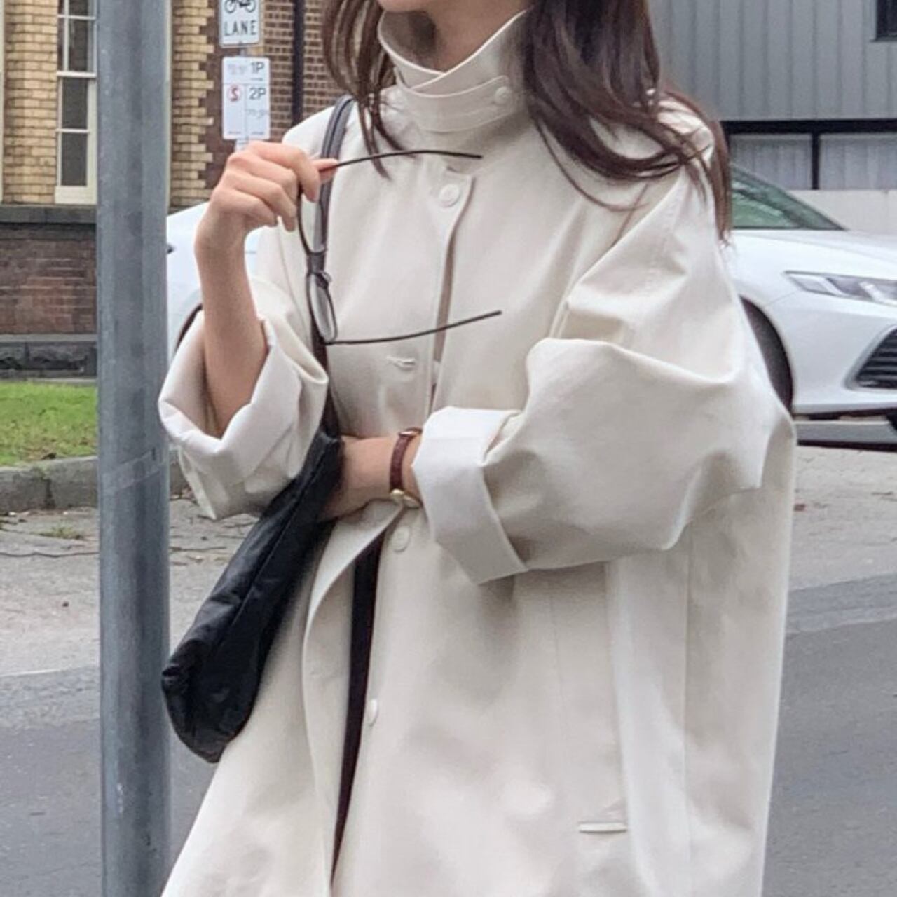黒のブラウスとスラックスの上に羽織って、クラシックなオフィススタイルに。カジュアルなニットやデニムに合わせれば、リラックスした休日スタイルも大人っぽく仕上がります。ロングブーツでモードに、スニーカーでカジュアルに、パンプスでエレガントにと、足元次第で印象は自在に変化してくれます。冬までの羽織り問題もこの一着があればすべて解決してくれるアイテムです。