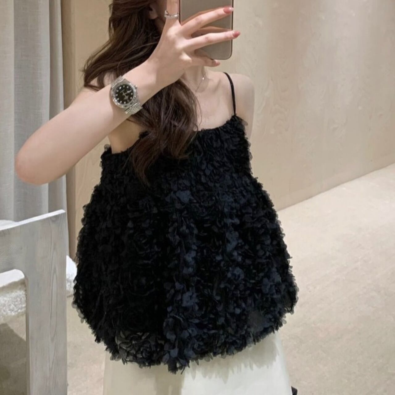 上品な3Dフラワーデザインが華やかさを引き立てるフレアキャミソールです。