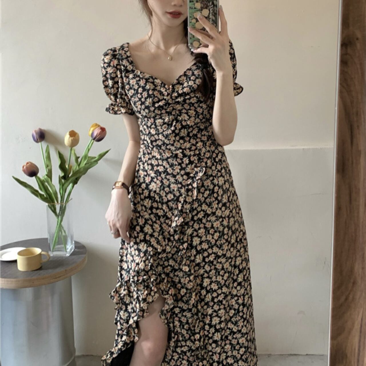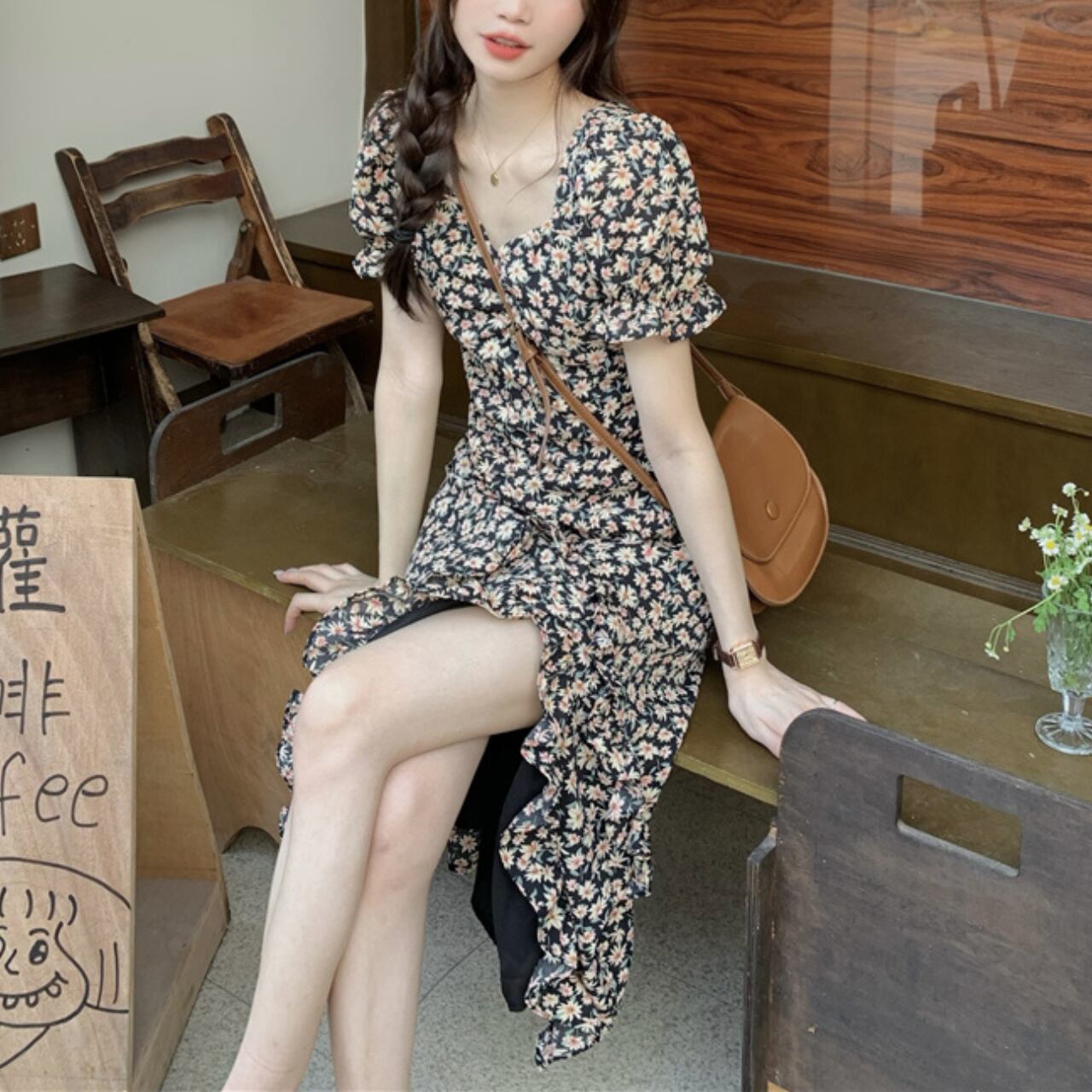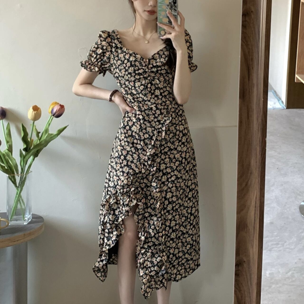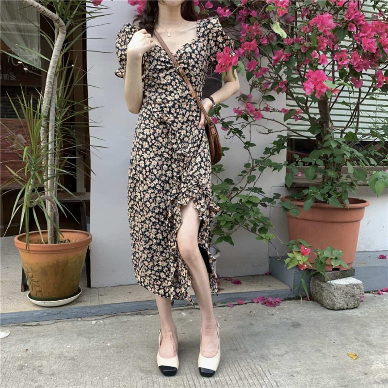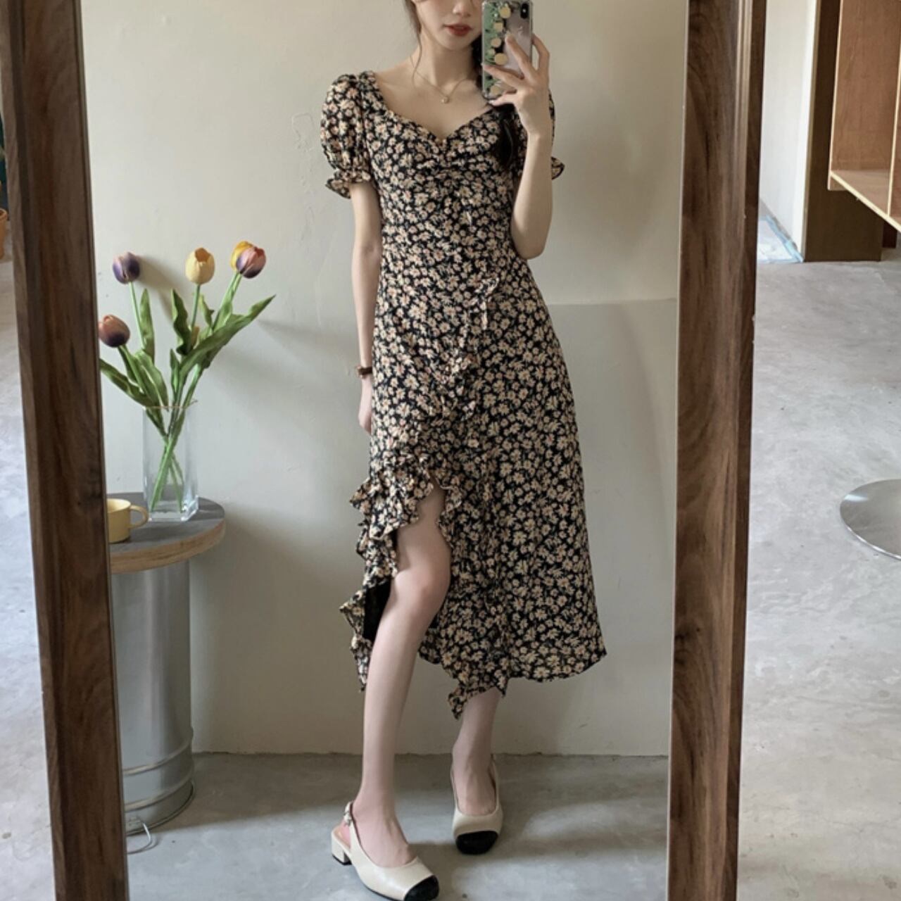 フローラルプリント フリルシフォンワンピース A4197