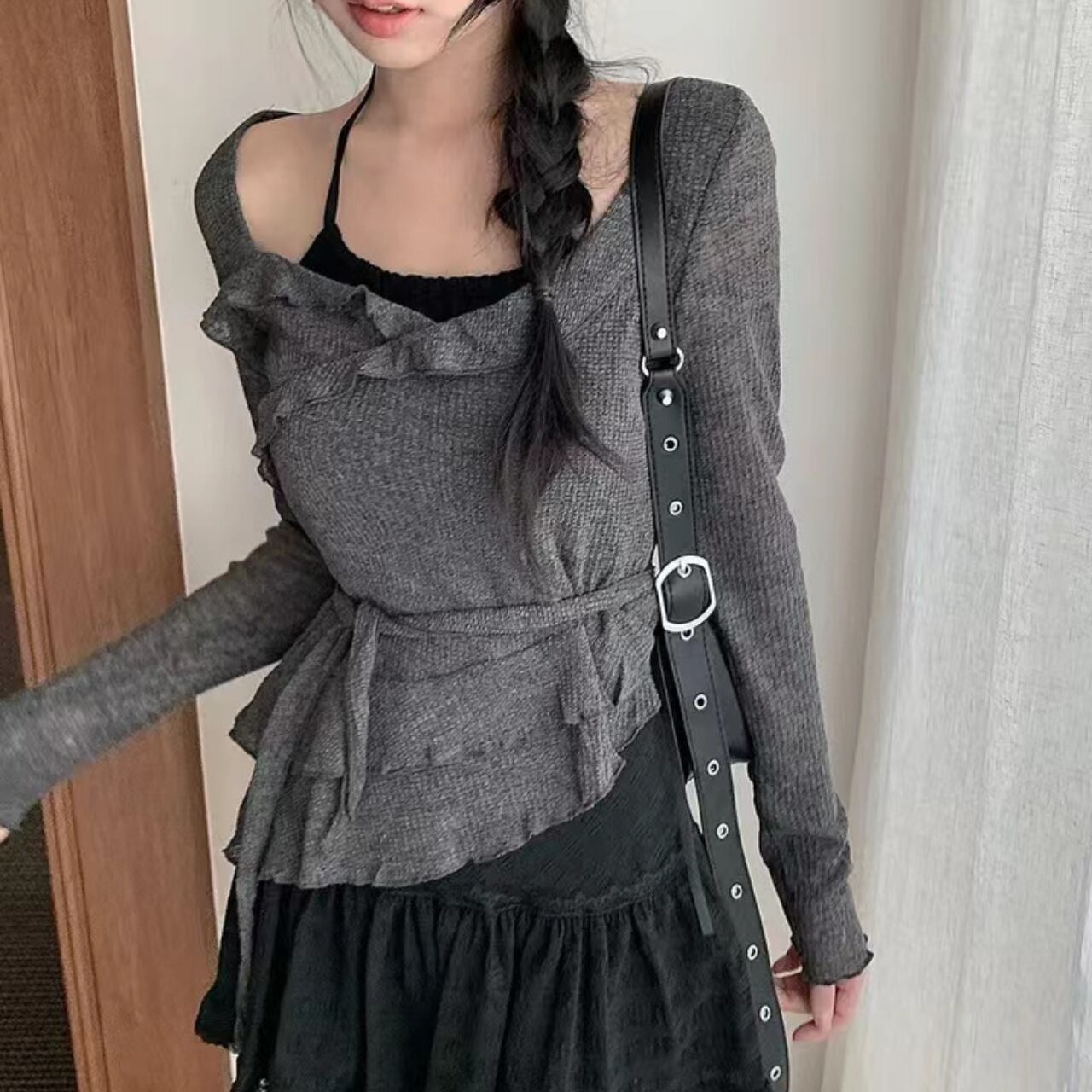 軽やかな素材感とフリルデザインが特徴のバレエコアなトップス。一枚で重ねて着ているように見えるおしゃれな一着です。