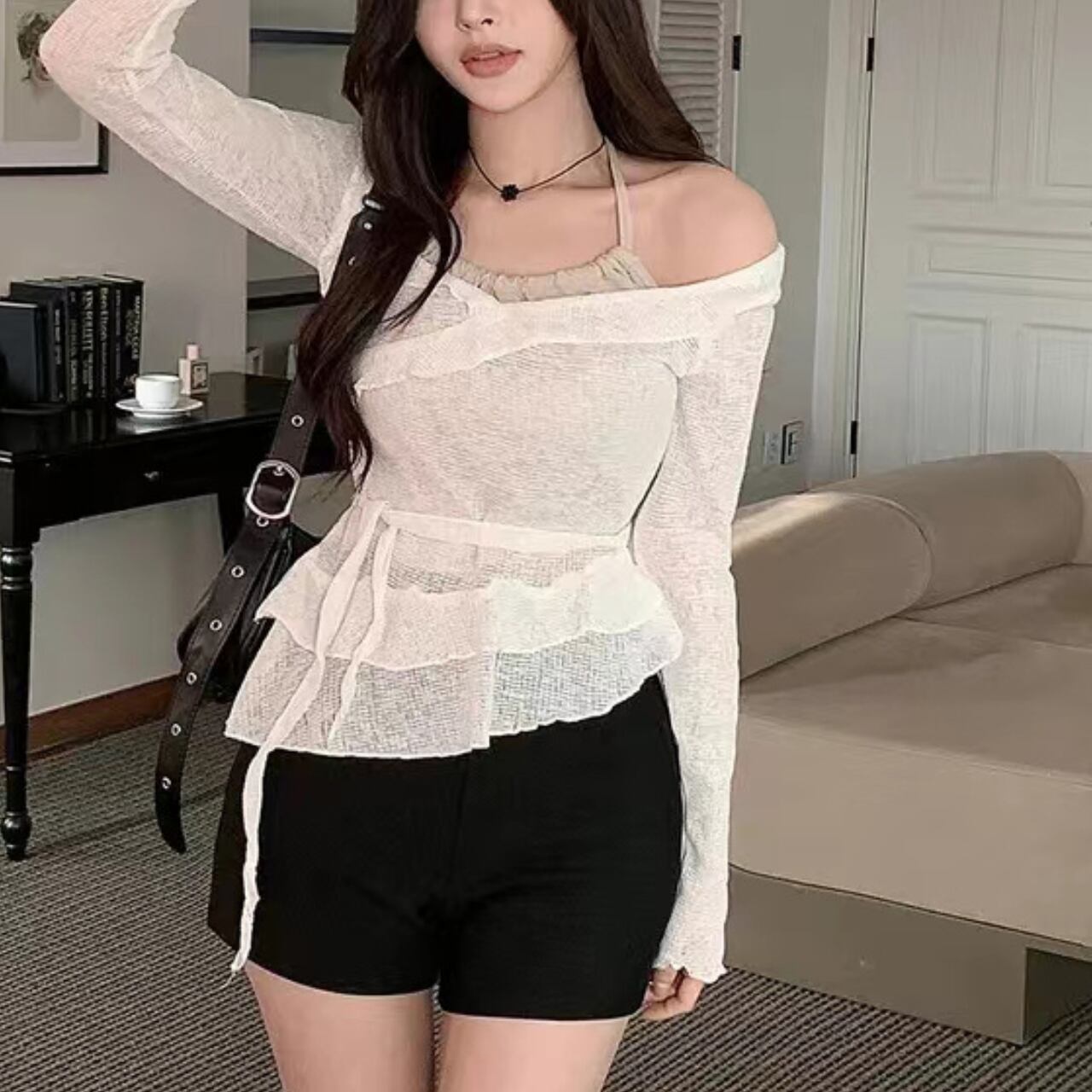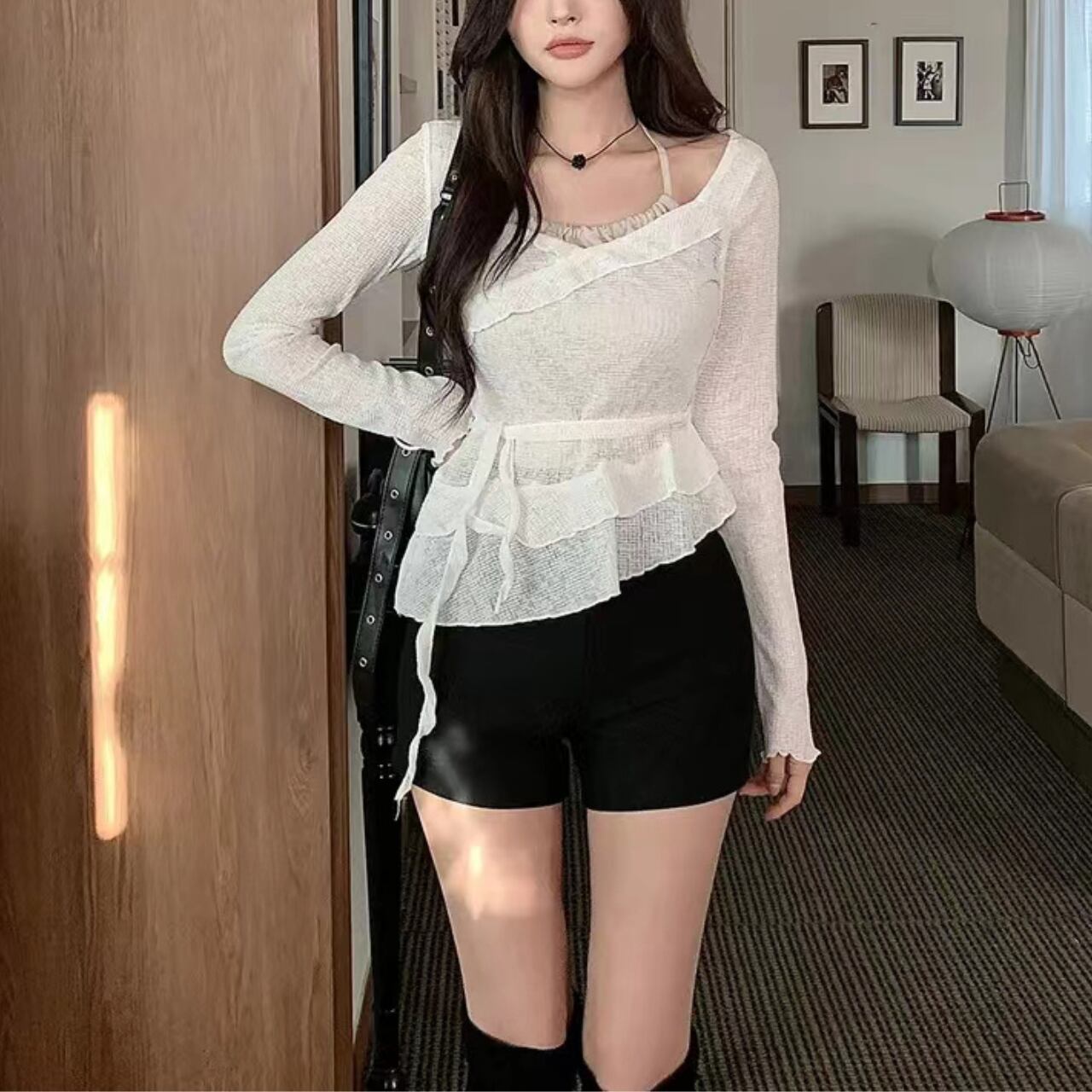 軽やかな素材感とフリルデザインが特徴のバレエコアなトップス。一枚で重ねて着ているように見えるおしゃれな一着です。