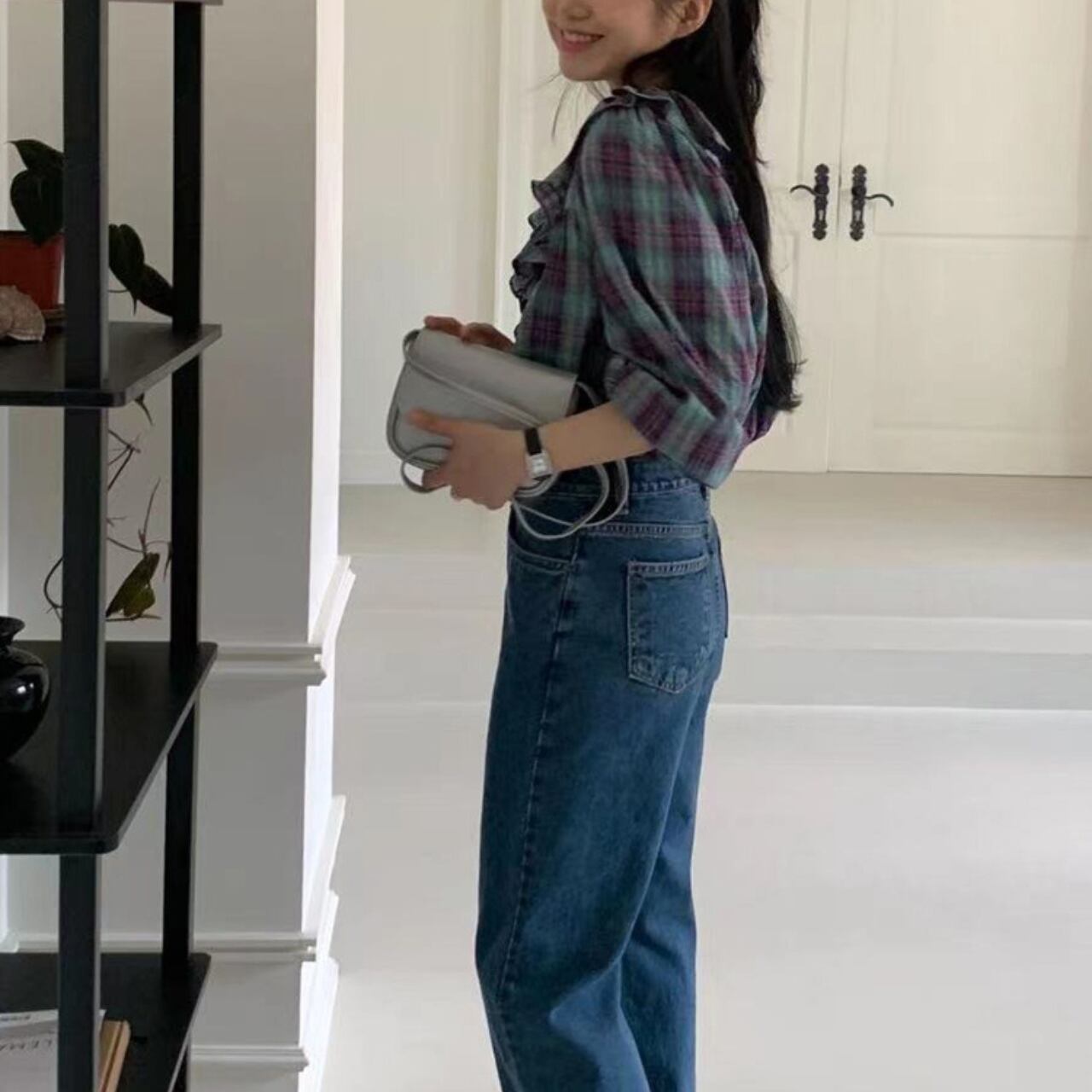 ハイウエストデニムでウエストマークすれば脚長効果も期待でき、パールネックレスなどクラシカルなアクセサリーとの相性も抜群。秋にはベージュのトレンチコートを羽織って、春にはカーディガンを肩掛けしてレイヤードスタイルも楽しめます。