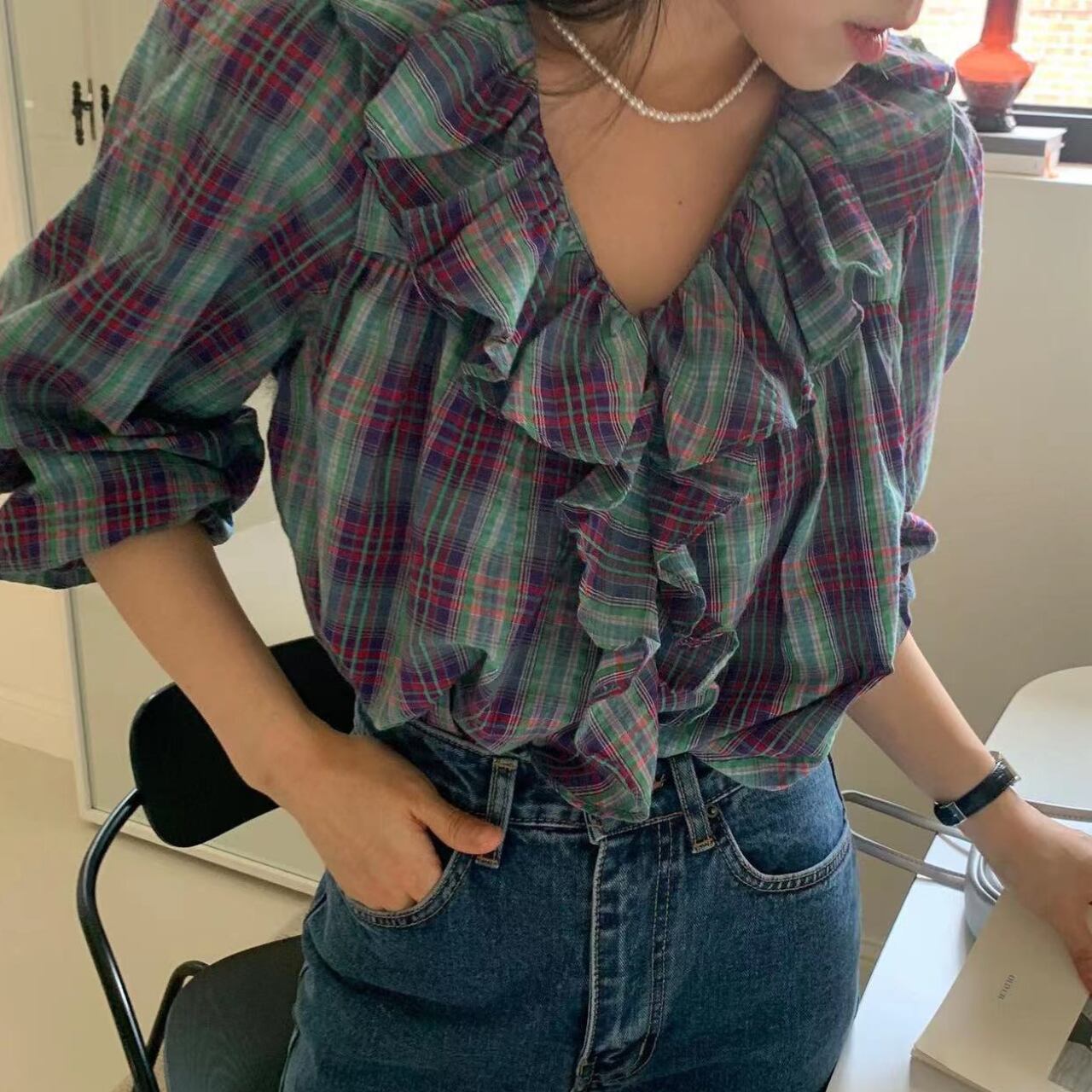 ヴィンテージライクなチェック柄が魅力的なフリルブラウス。