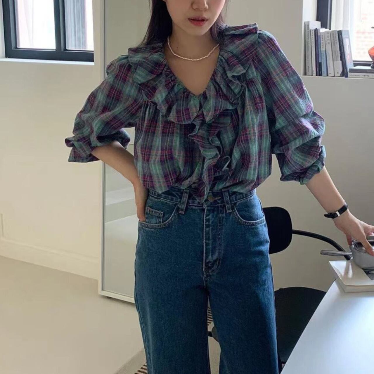 胸元を華やかに彩る縦フリルデザインが、シンプルなコーディネートを一瞬で格上げ。グリーン×パープルの深みのあるチェック柄が、大人の洗練された印象を演出します。透け感のある軽やかな素材で、重くなりがちな秋冬スタイルに抜け感をプラスしてくれます。
