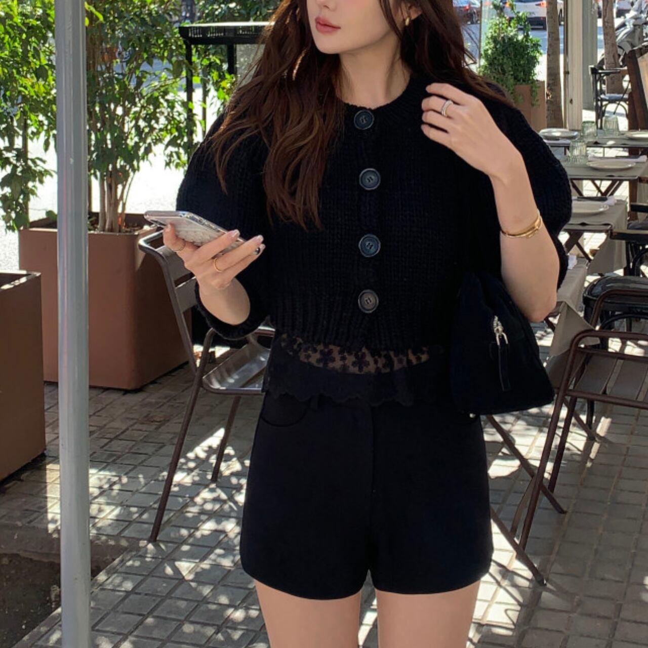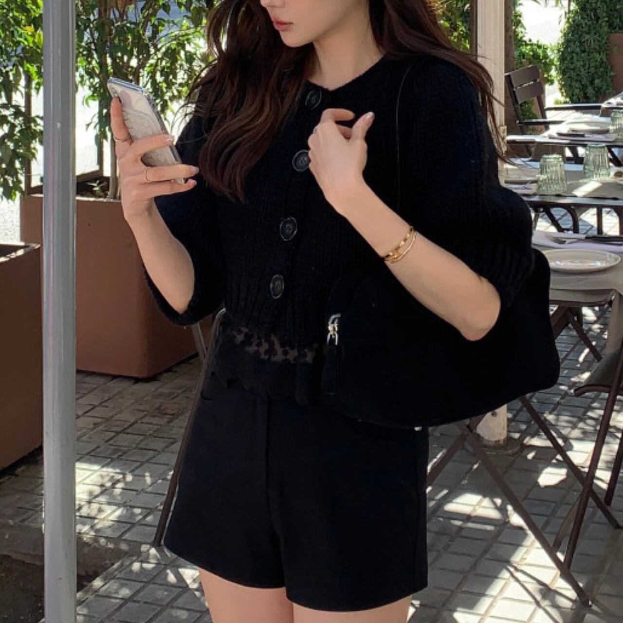 腕回りにゆとりがあるため、重ね着してももたつかずすっきりと着こなせます。丈はウエストラインでぴたりと止まるクロップド丈で、ハイウエストのデニムと合わせることで脚長効果もばっちりです。裾フリルやレースキャミとのレイヤードスタイルもおすすめです。編み目がざくざくと粗めなので、カジュアルながらもこなれた印象を与えてくれます。