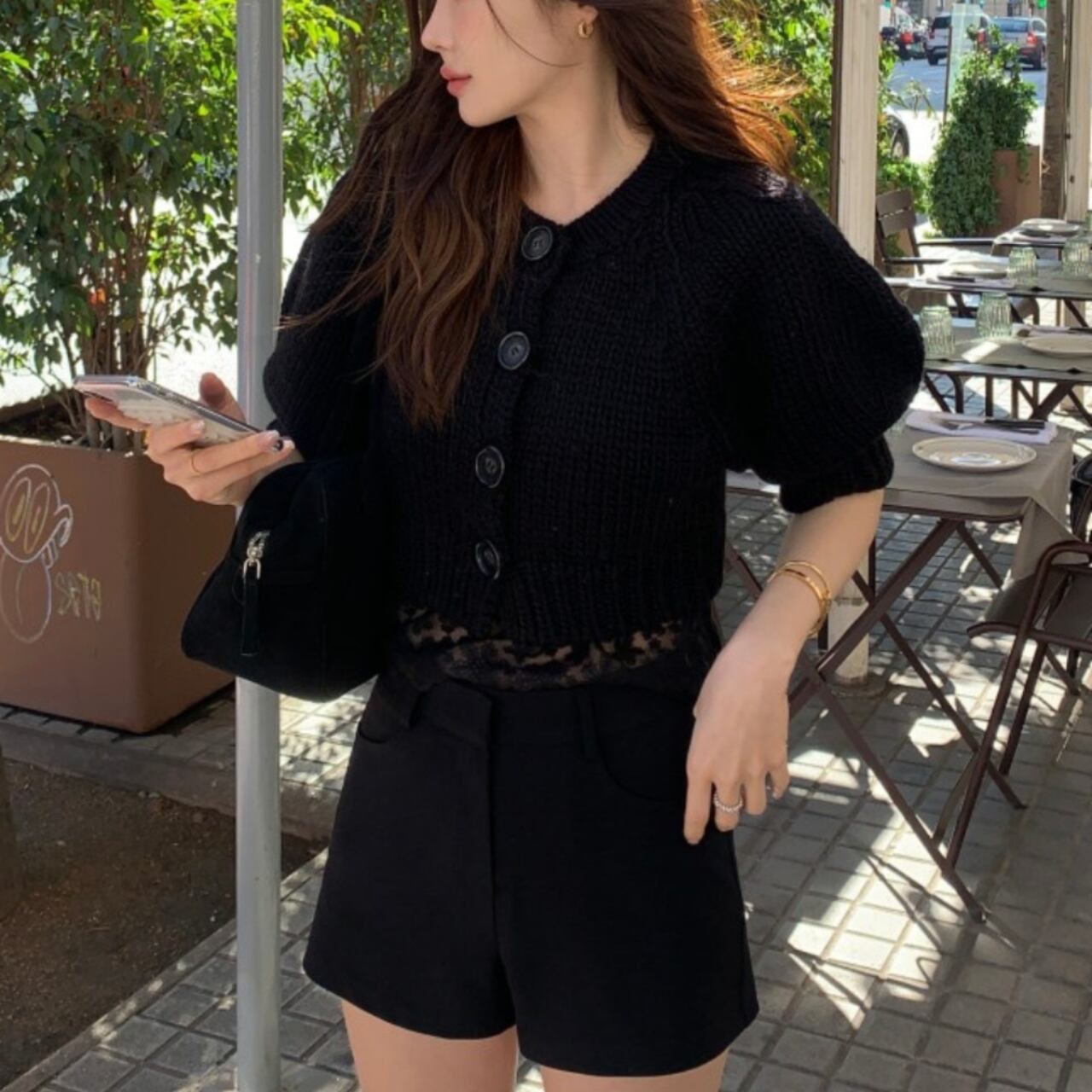 このぽわんとした袖がポイントのニットカーディガンは、ふわりと柔らかな質感が魅力的で、ざっくりと編まれた温かみのある風合いが特徴です。フロントにはころんと可愛らしい丸ボタンがぽつぽつと並び、きちんと感とカジュアルさを絶妙にバランスよく演出しています。