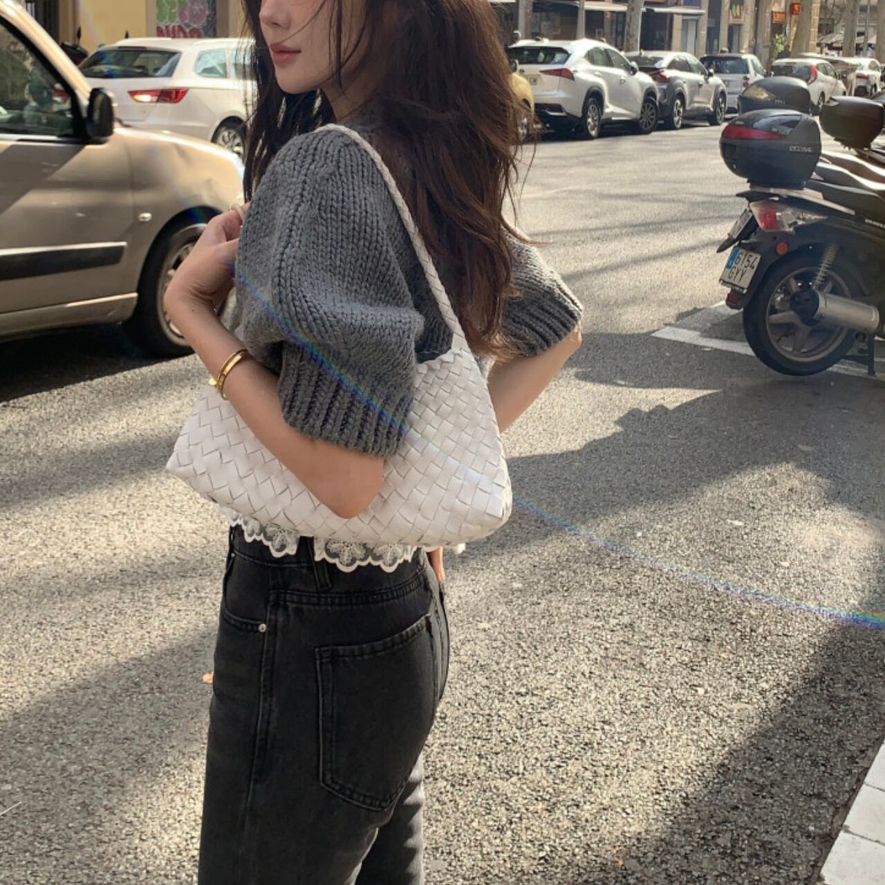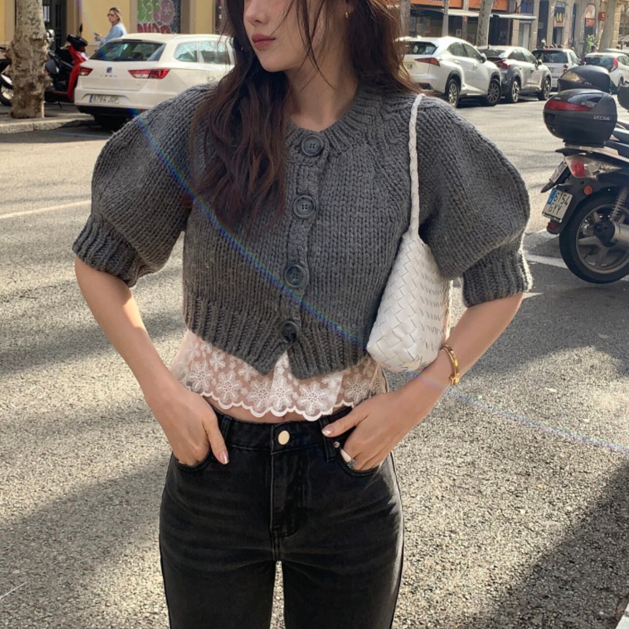 腕回りにゆとりがあるため、重ね着してももたつかずすっきりと着こなせます。丈はウエストラインでぴたりと止まるクロップド丈で、ハイウエストのデニムと合わせることで脚長効果もばっちりです。裾フリルやレースキャミとのレイヤードスタイルもおすすめです。編み目がざくざくと粗めなので、カジュアルながらもこなれた印象を与えてくれます。