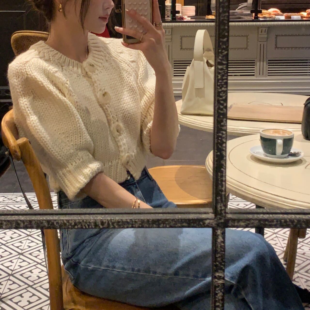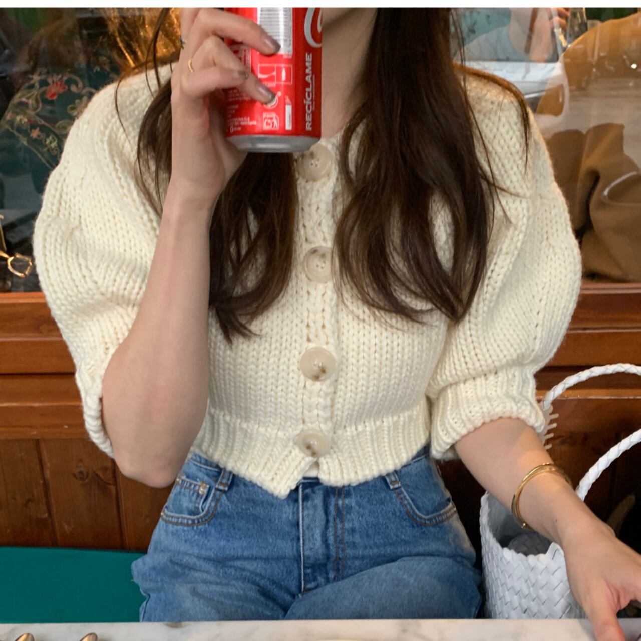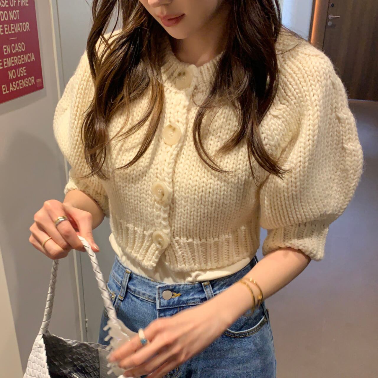このぽわんとした袖がポイントのニットカーディガンは、ふわりと柔らかな質感が魅力的で、ざっくりと編まれた温かみのある風合いが特徴です。フロントにはころんと可愛らしい丸ボタンがぽつぽつと並び、きちんと感とカジュアルさを絶妙にバランスよく演出しています。