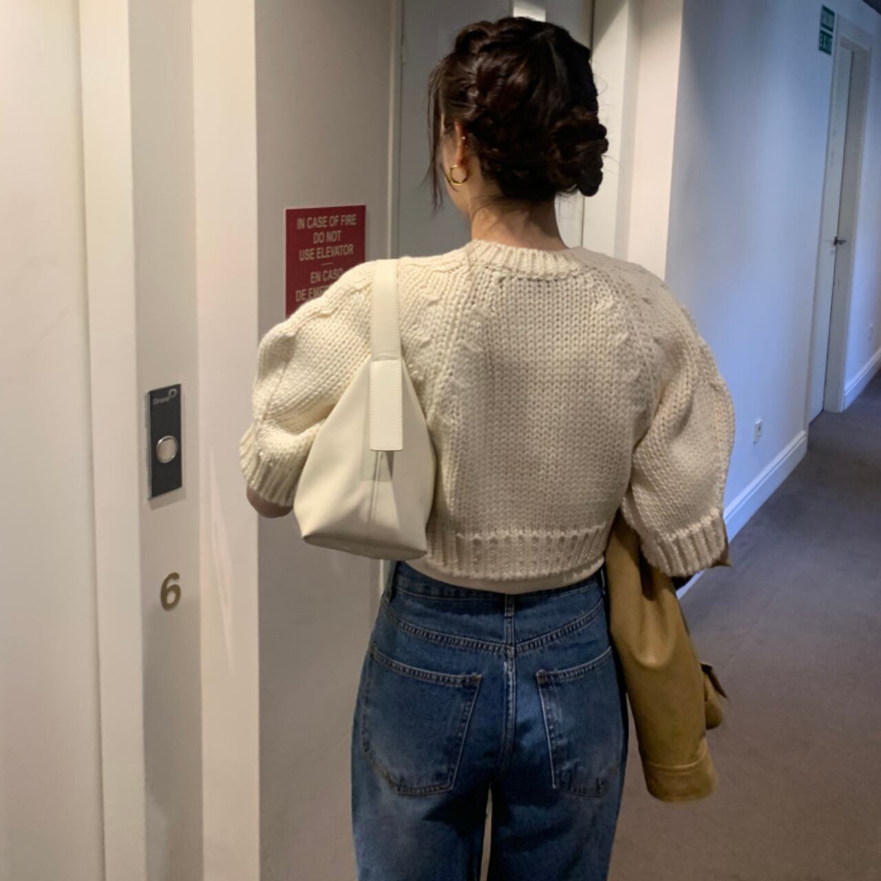 腕回りにゆとりがあるため、重ね着してももたつかずすっきりと着こなせます。丈はウエストラインでぴたりと止まるクロップド丈で、ハイウエストのデニムと合わせることで脚長効果もばっちりです。裾フリルやレースキャミとのレイヤードスタイルもおすすめです。編み目がざくざくと粗めなので、カジュアルながらもこなれた印象を与えてくれます。