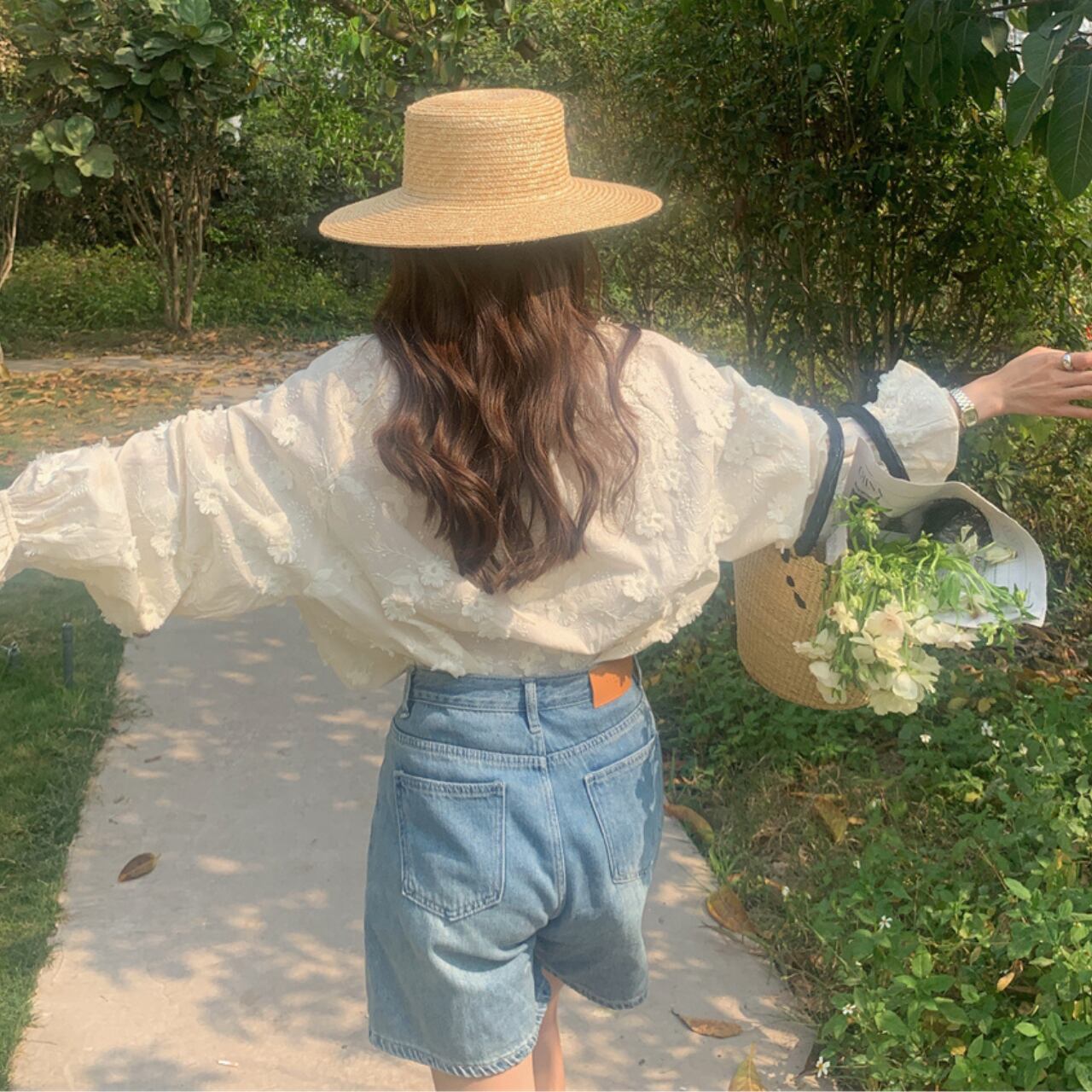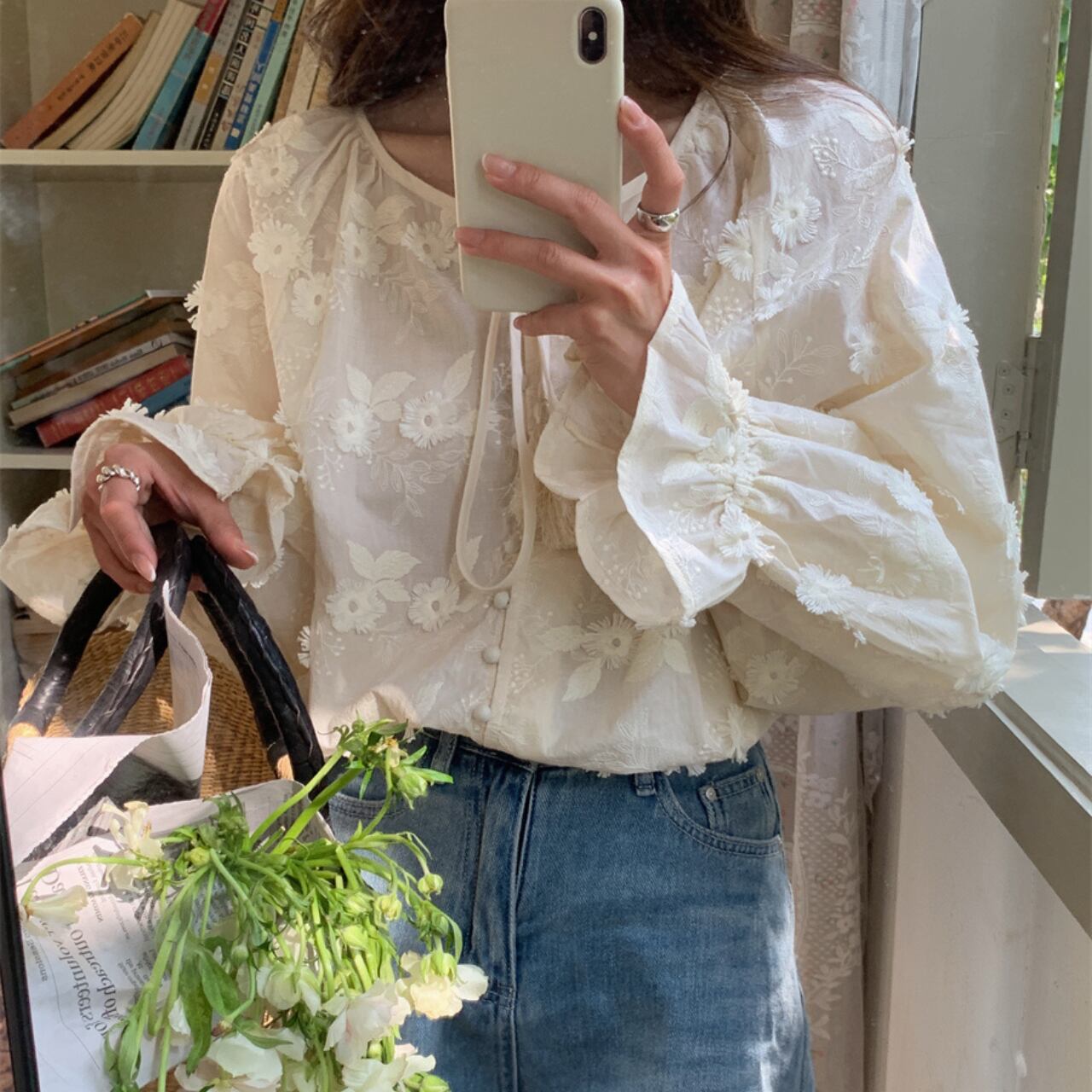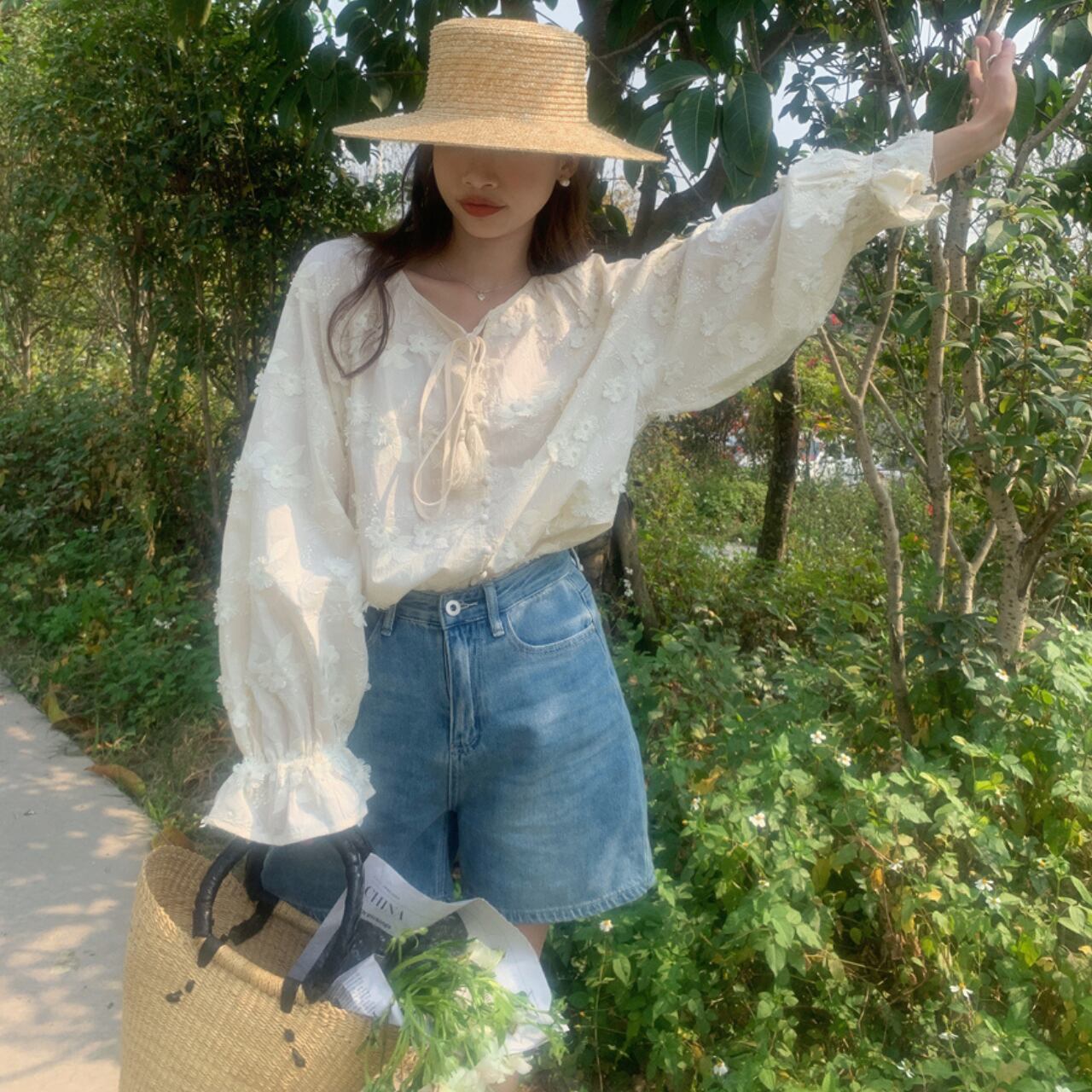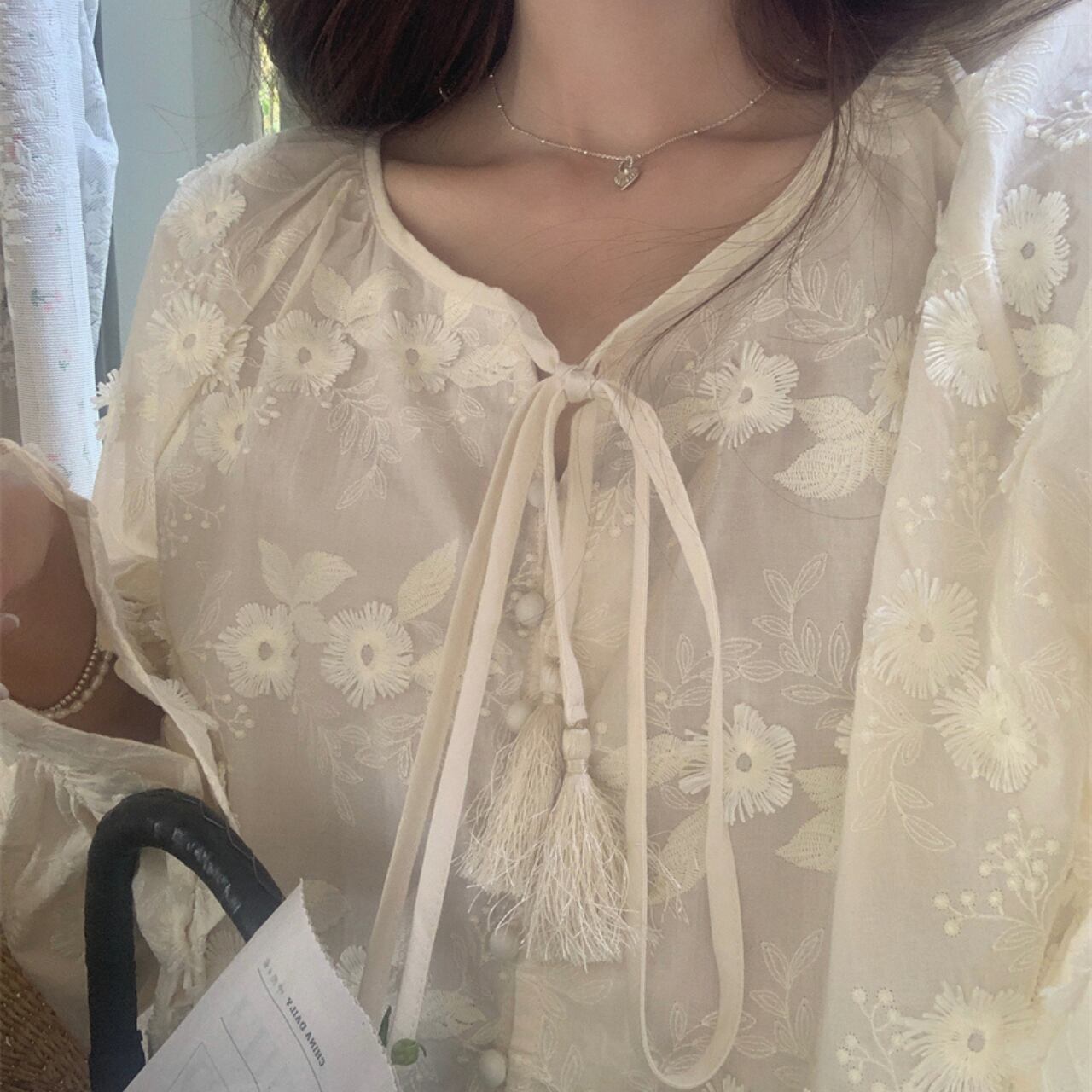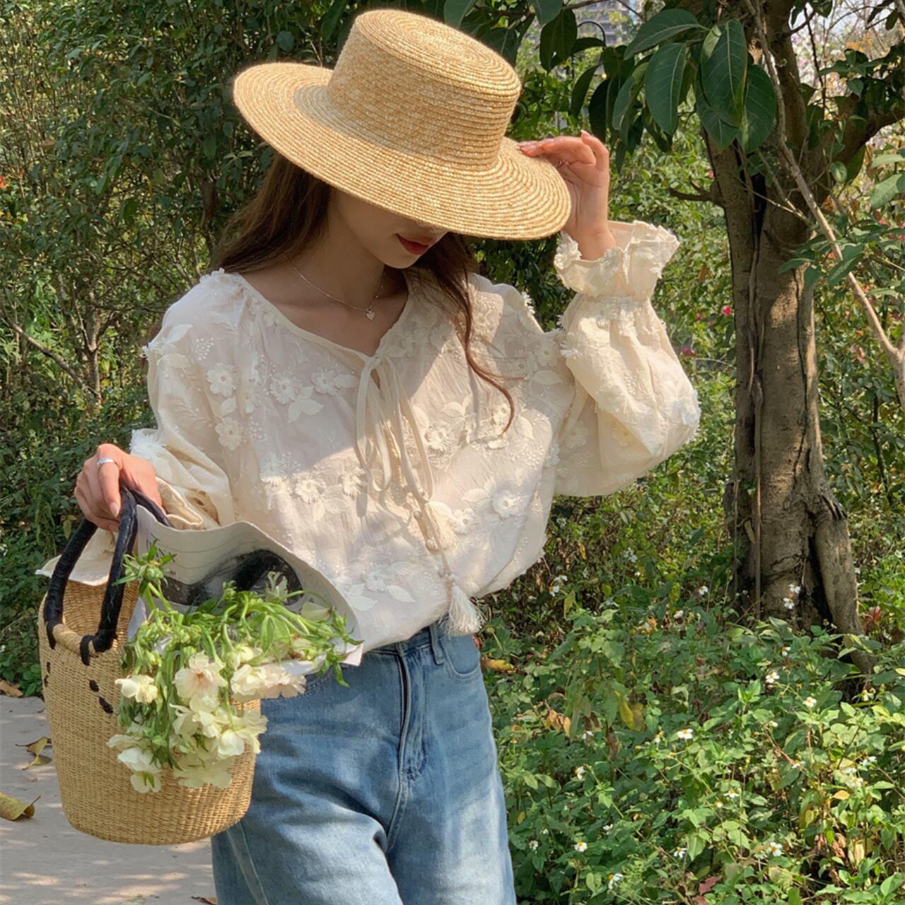 一枚で華やかなシーズンムード溢れるブラウスで、立体的なお花の柄がポイントです。紐を結んだり、トップスをインにしたりで印象が変えられます!