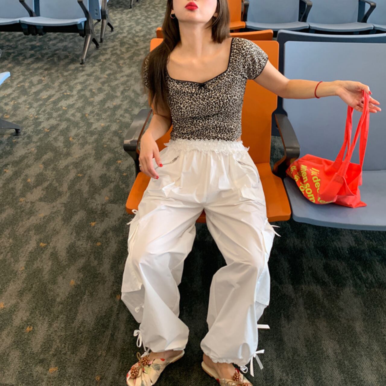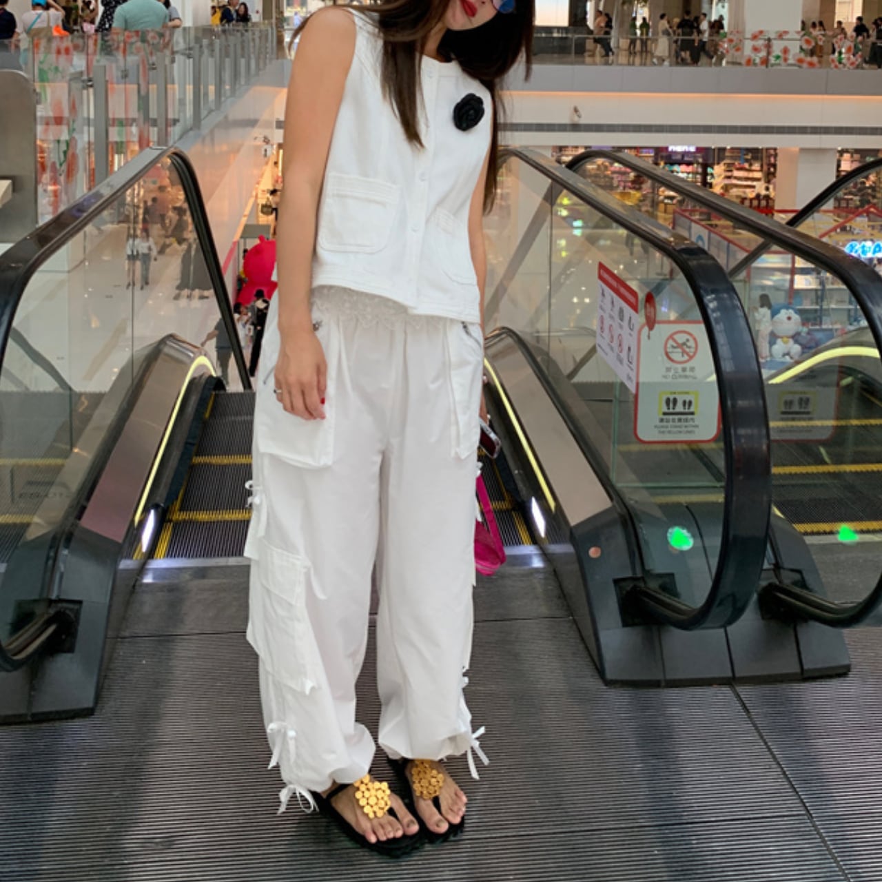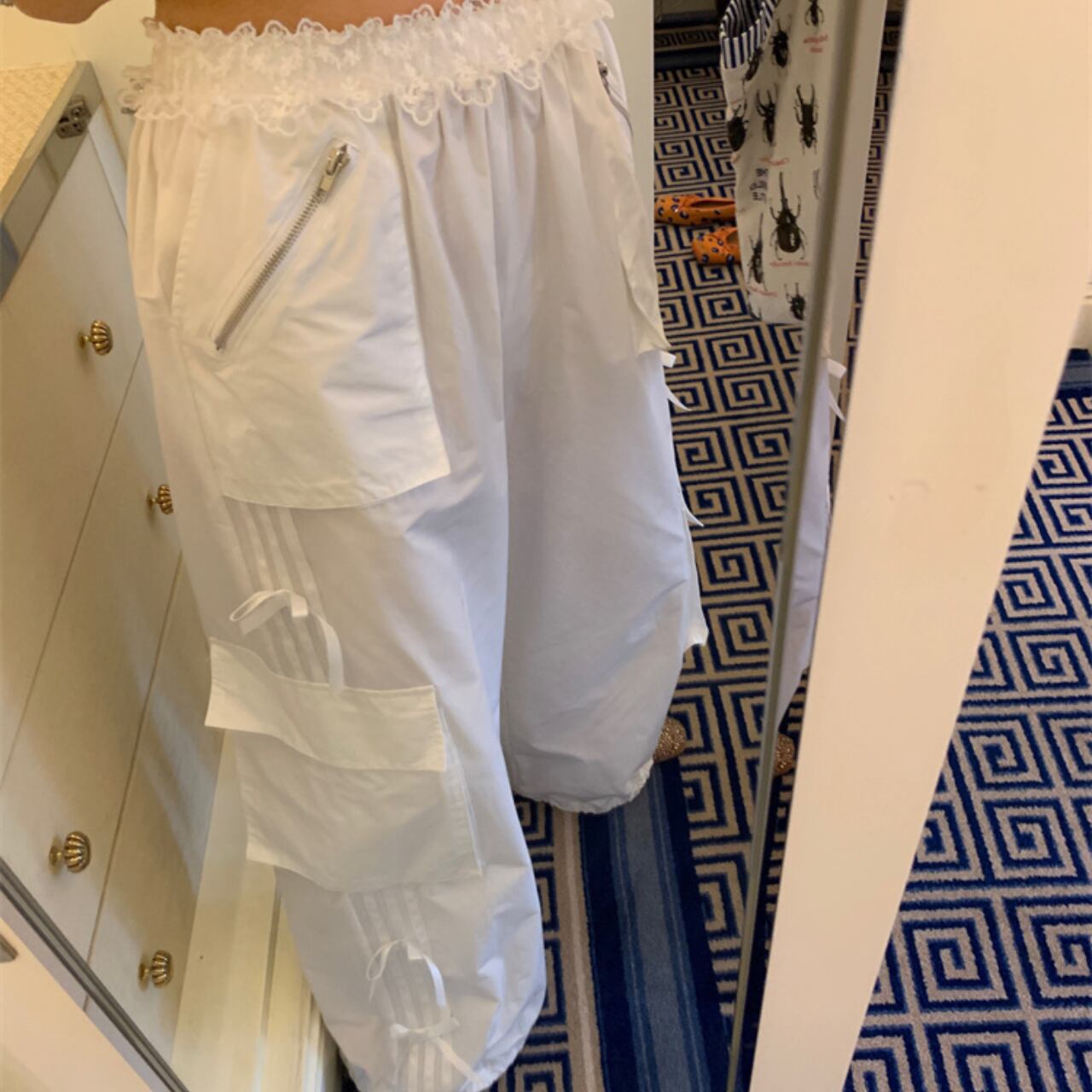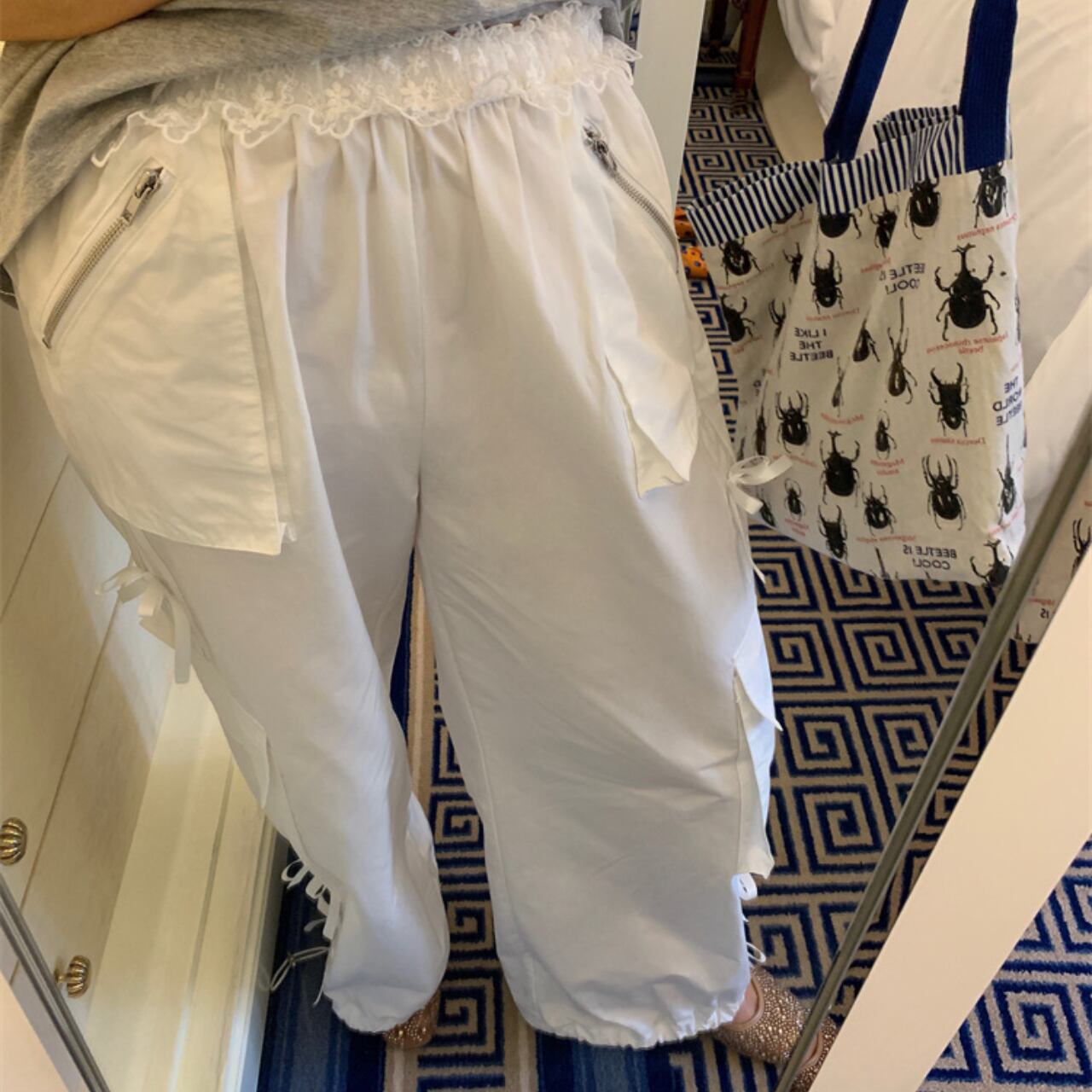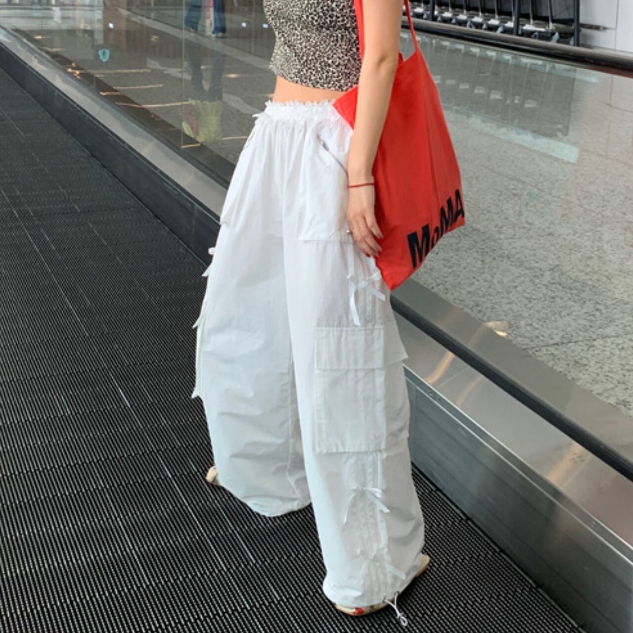 ウエスト部分の立体的なレースステッチデザインがポイントのワイドカーゴパンツです。何を合わせてもおしゃれになる注目のボトムスです。リボンやサイドラインも遊び心が感じられます。