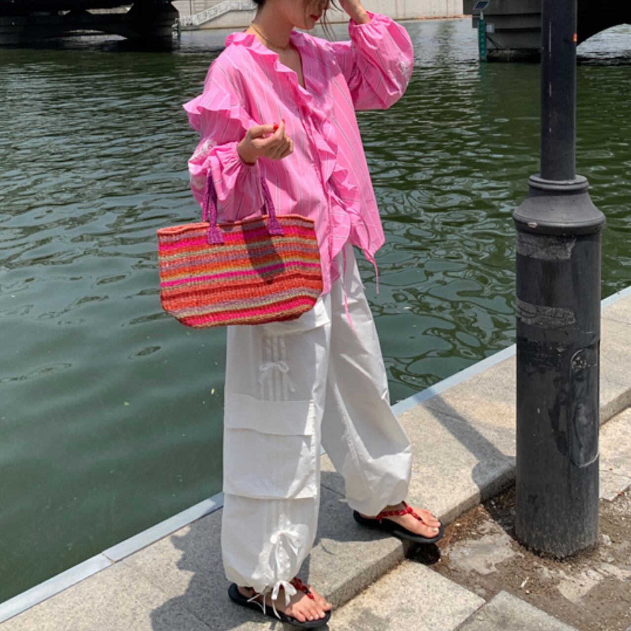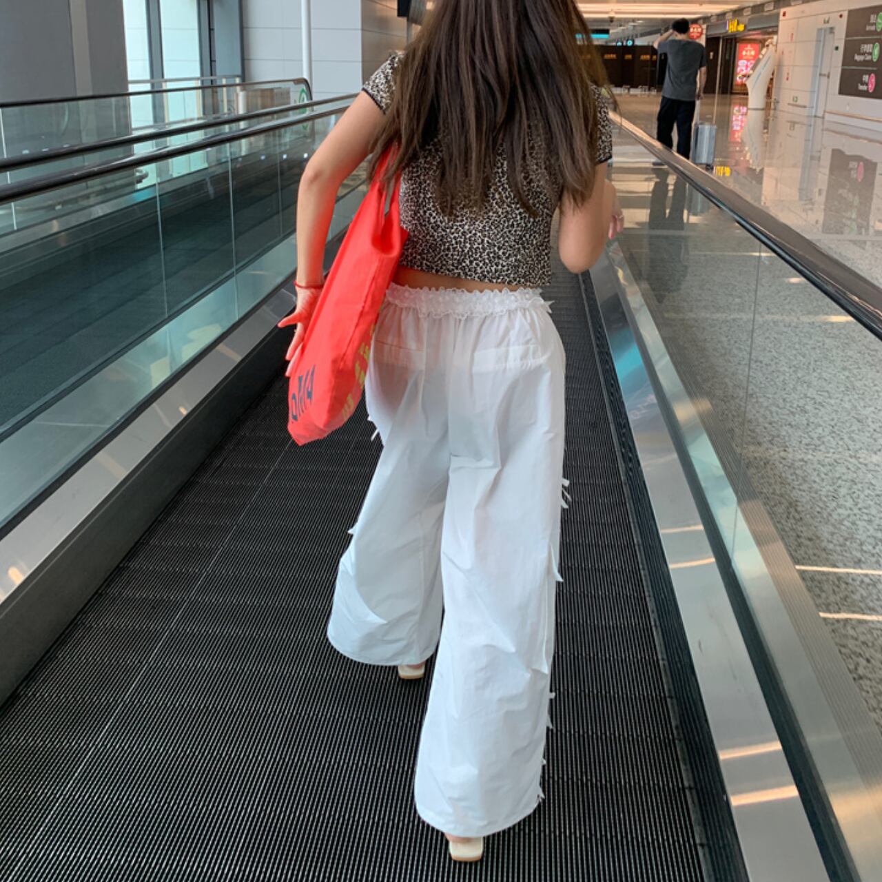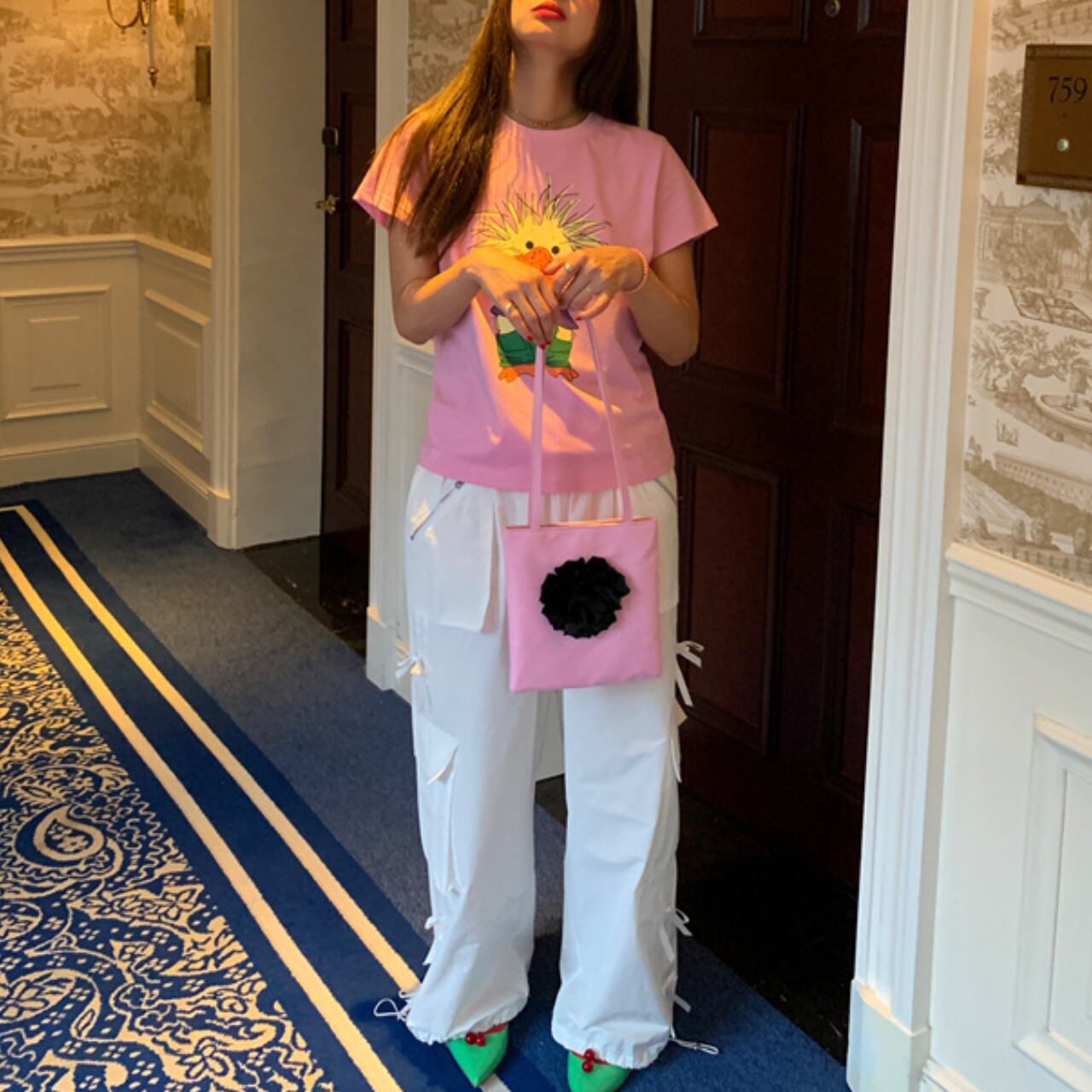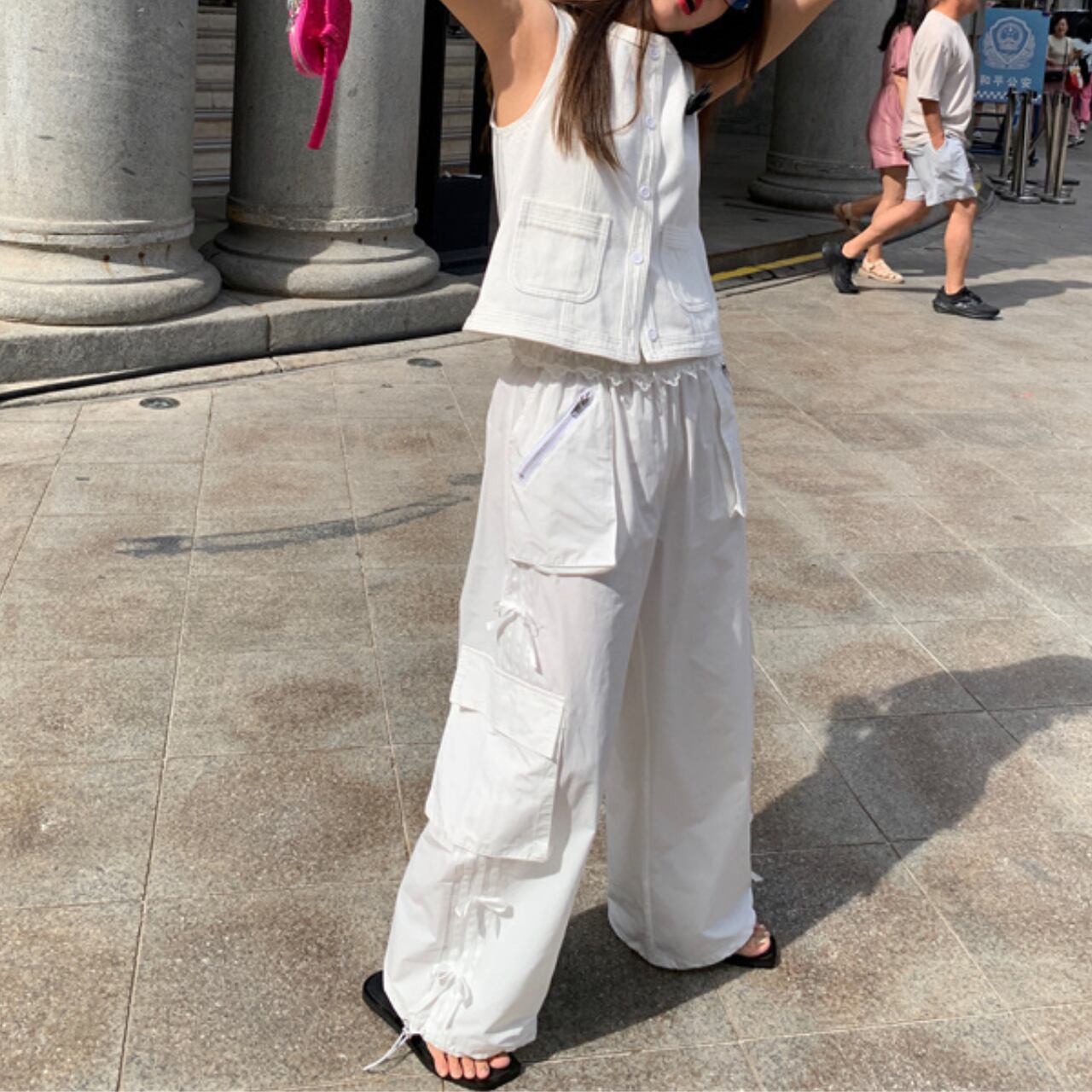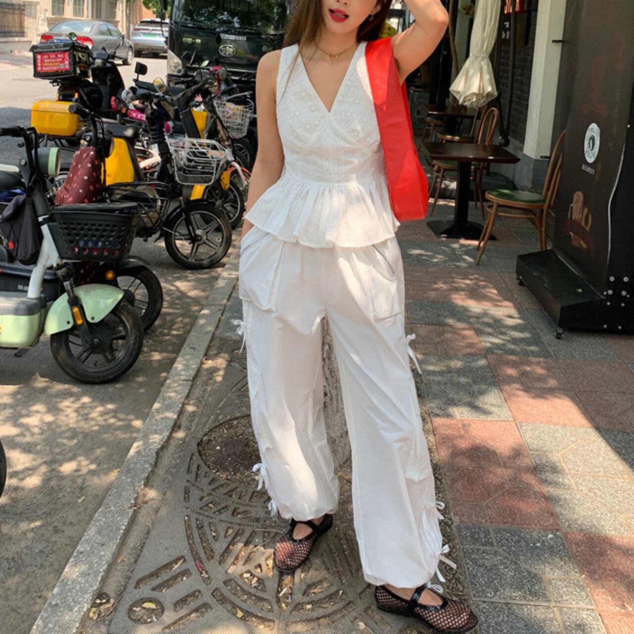 ウエスト部分の立体的なレースステッチデザインがポイントのワイドカーゴパンツです。何を合わせてもおしゃれになる注目のボトムスです。リボンやサイドラインも遊び心が感じられます。
