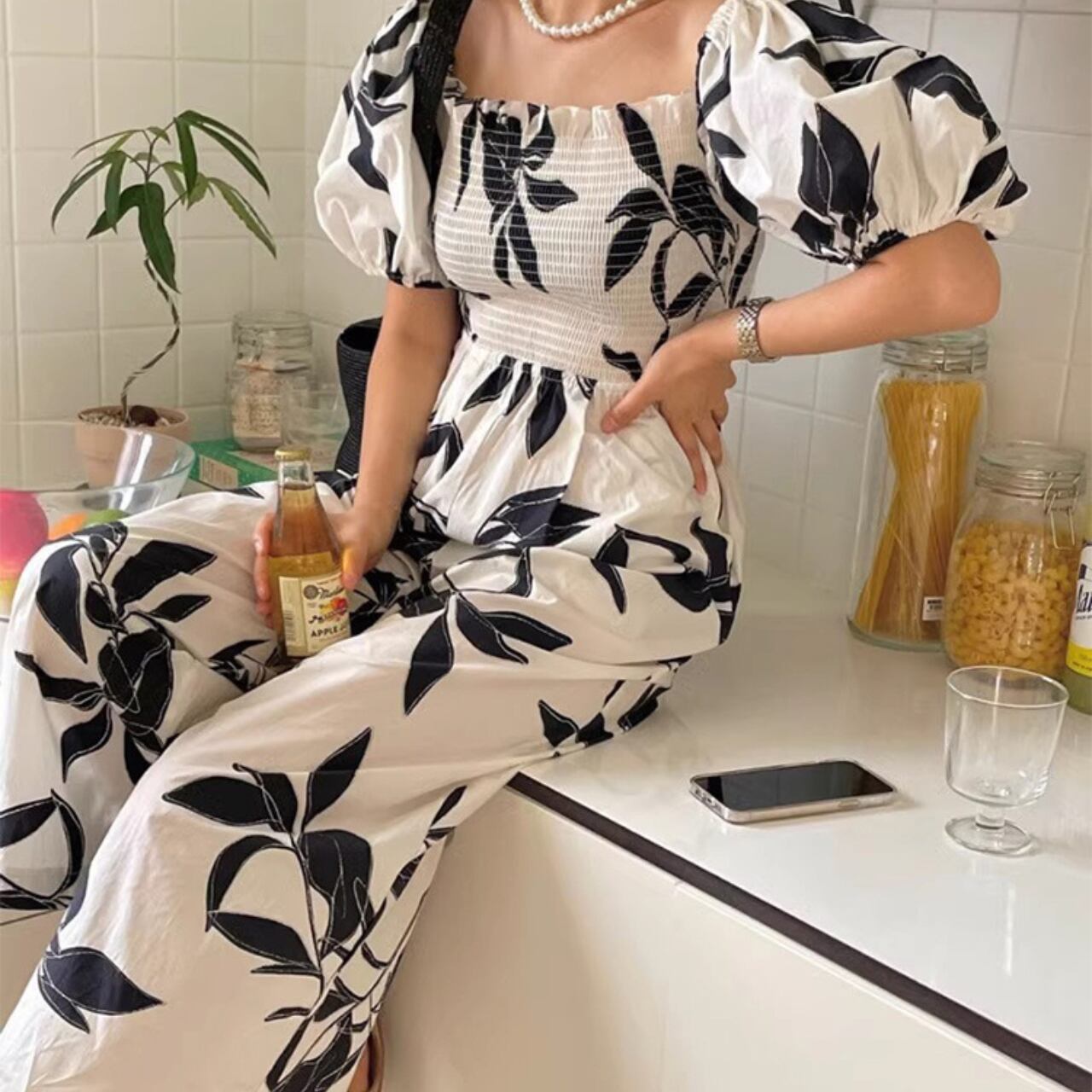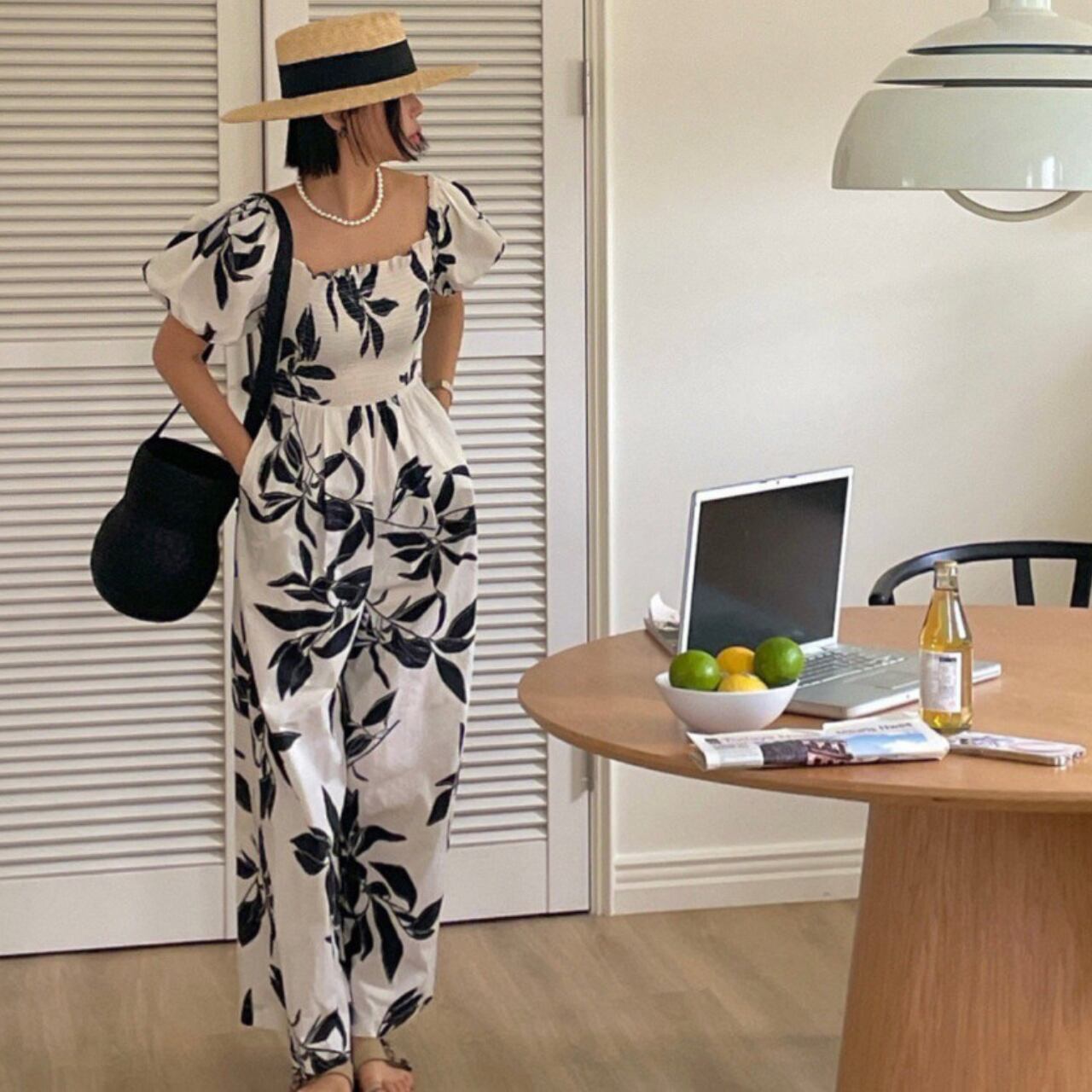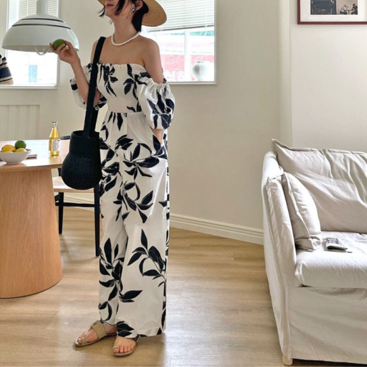 リゾートシーンにぴったりなフラワープリントのオールインワン。オフショルとしてもご着用いただけます。