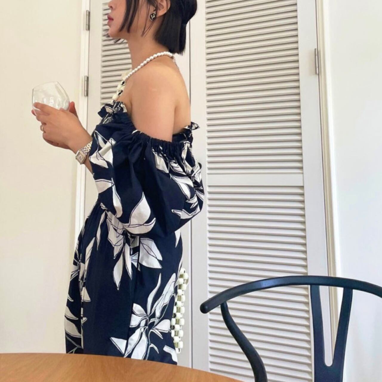 リゾートシーンにぴったりなフラワープリントのオールインワン。オフショルとしてもご着用いただけます。