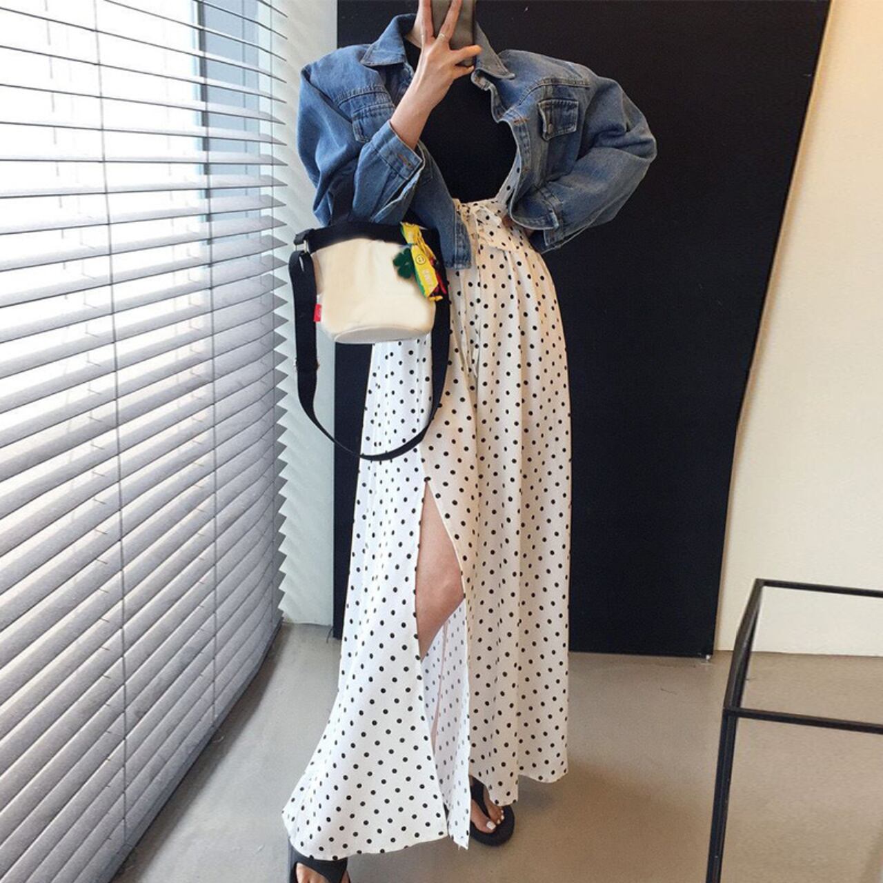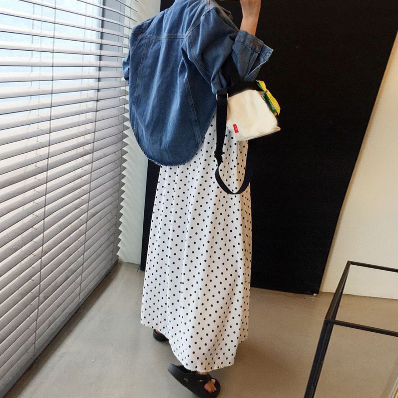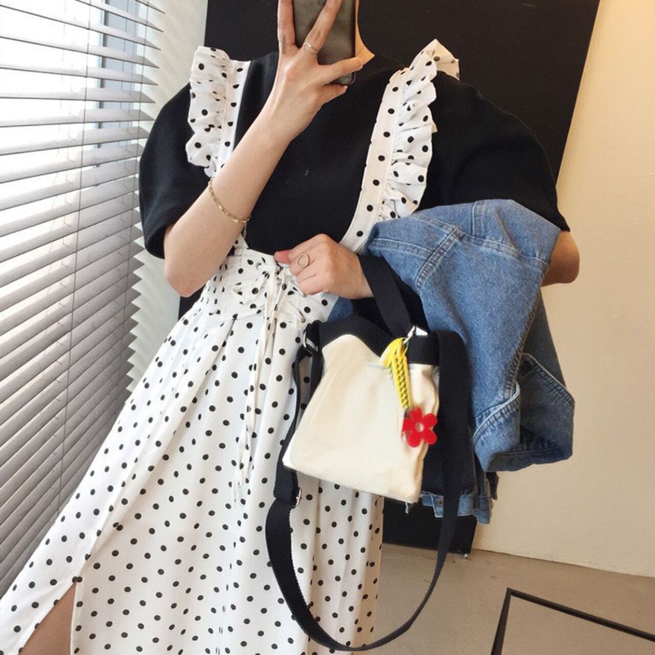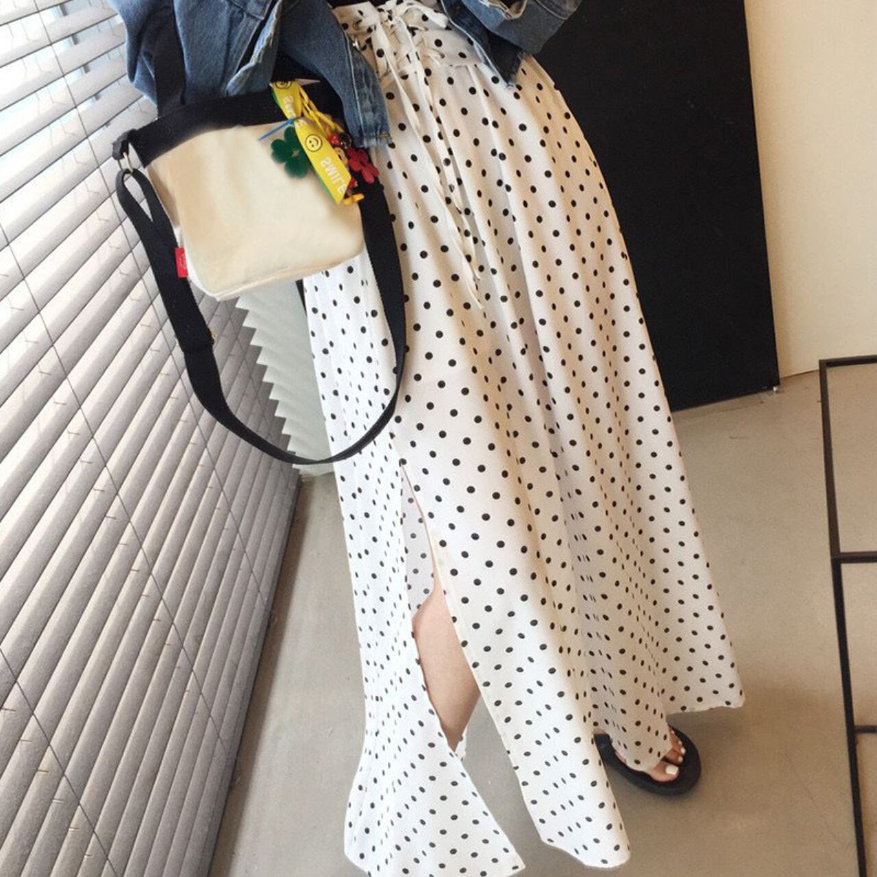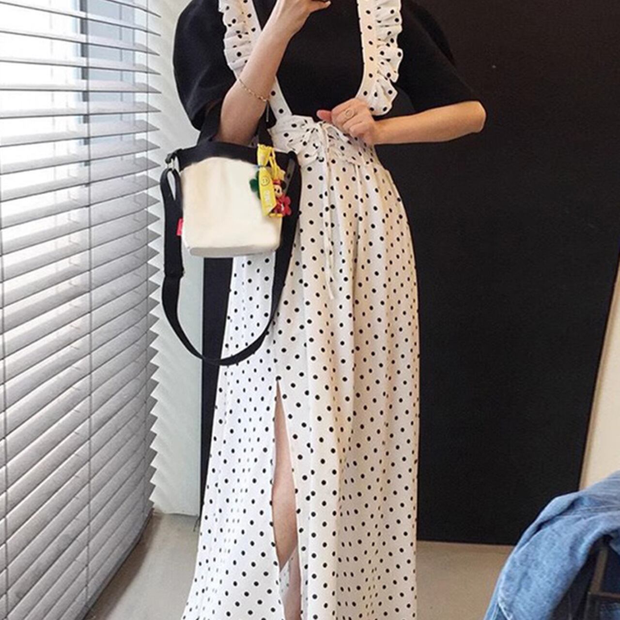 スリットが入ったドット柄のジャンパースカートです。かわいいフリルストラップが前から見ても後ろから見ても華やかなデザインです。