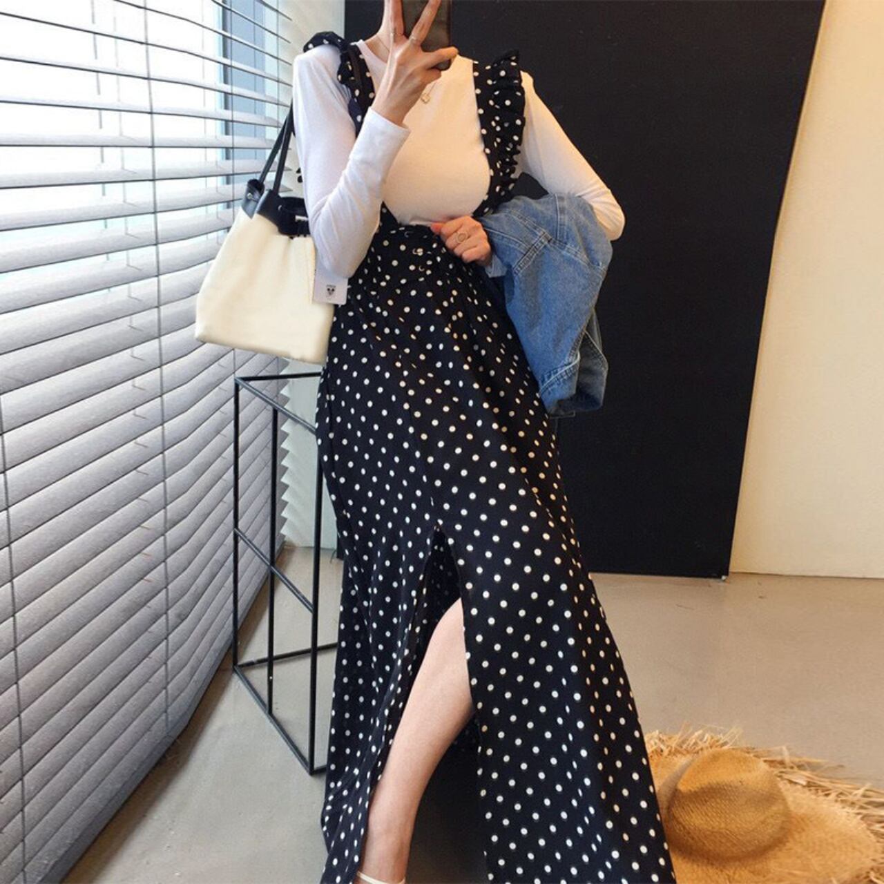 スリットが入ったドット柄のジャンパースカートです。かわいいフリルストラップが前から見ても後ろから見ても華やかなデザインです。