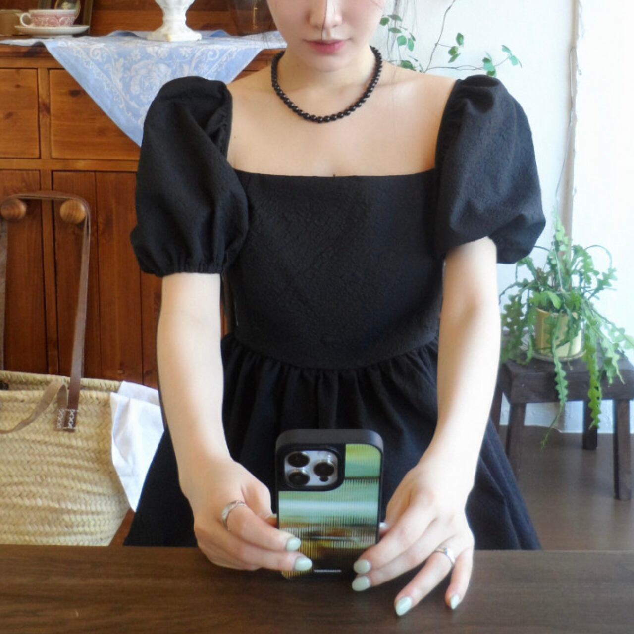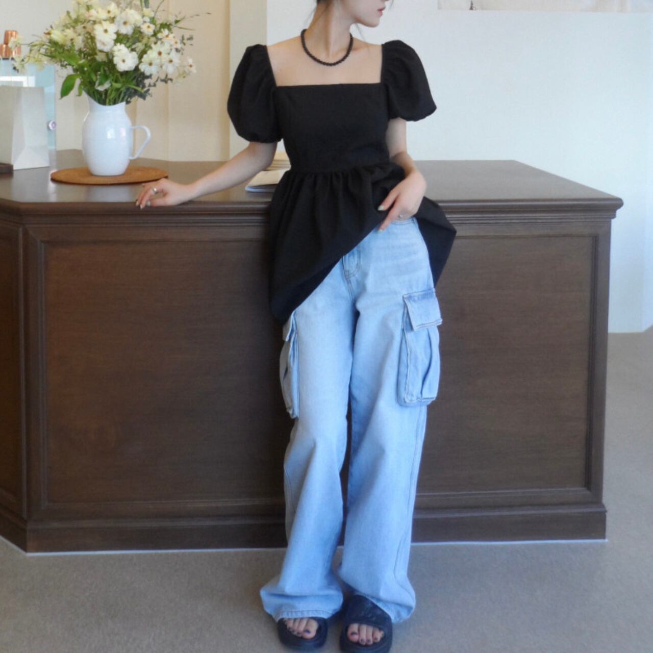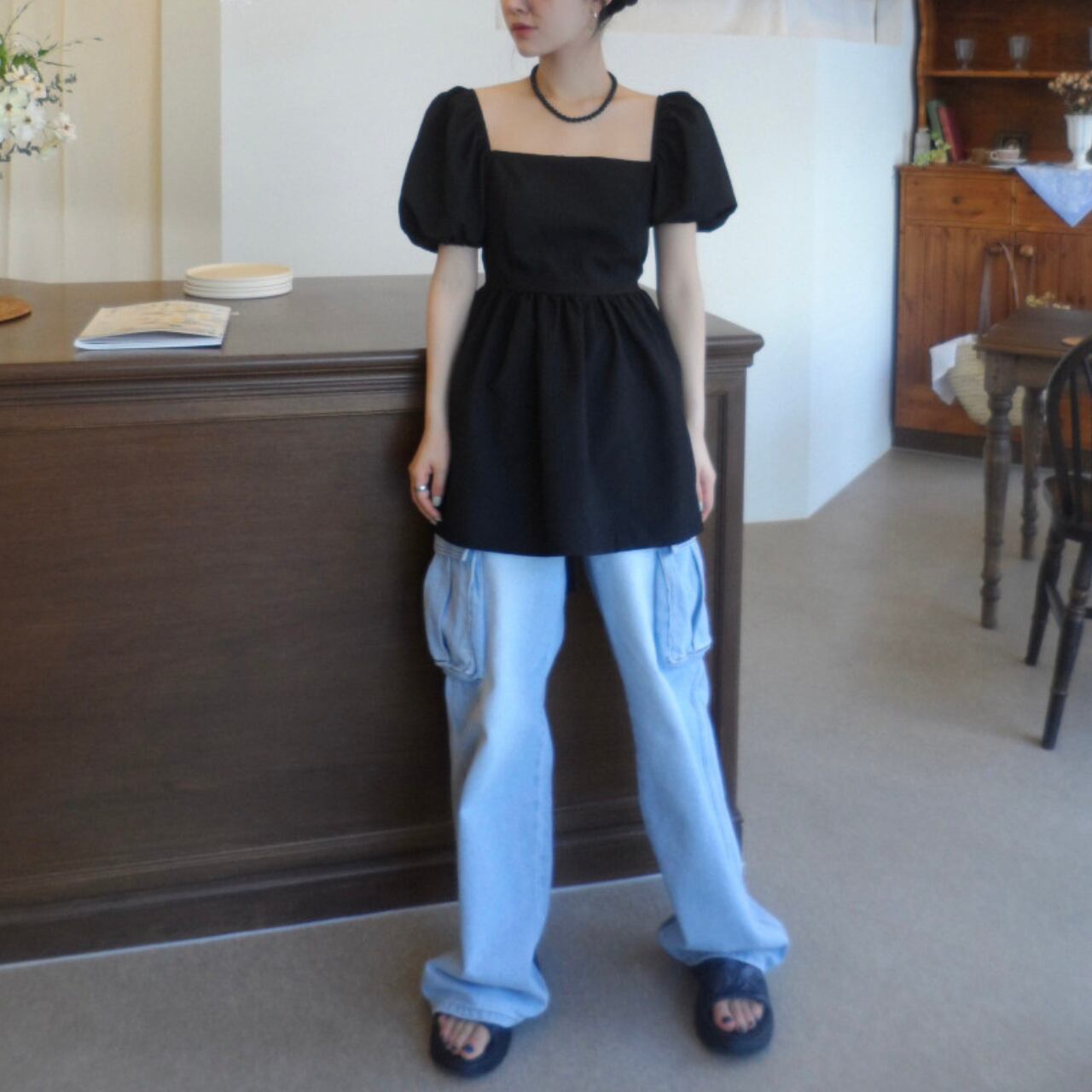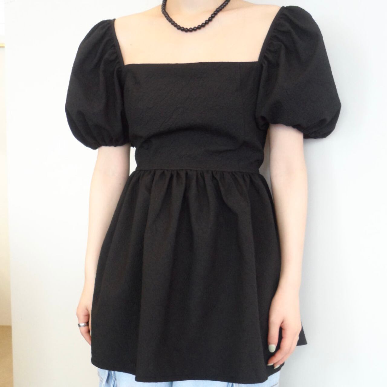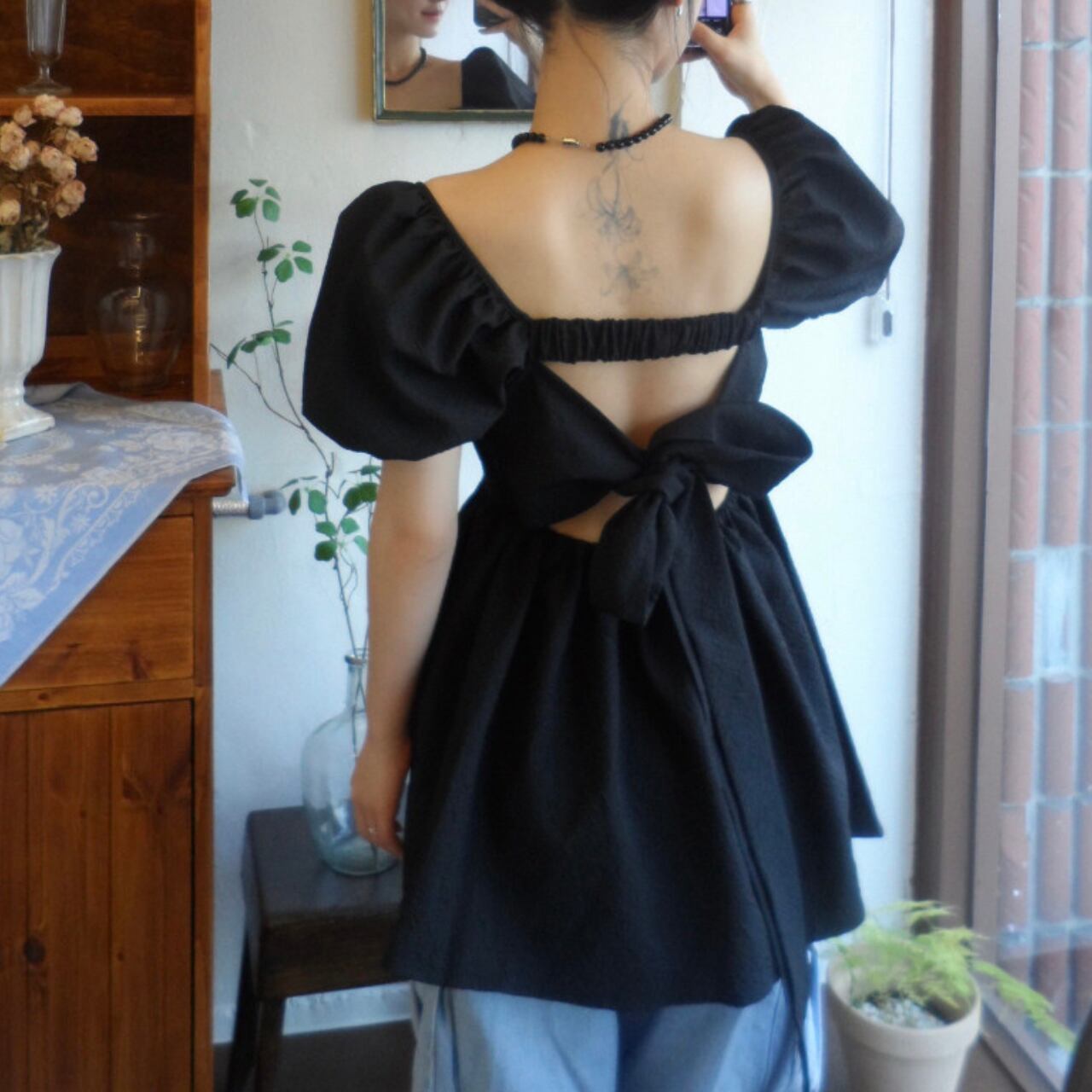 エレガントなスクエアネックとふんわりパフスリーブが女性らしさを演出し、後ろのリボンディテールが上品で特別感のあるアクセントになったブラウス。バックスタイルまで美しく、ペプラムシルエットで体型カバーしながら360度どこから見ても魅力的なシルエットを演出します。後ろ姿にも自信が持てる洗練されたデザインが魅力的な一枚です。