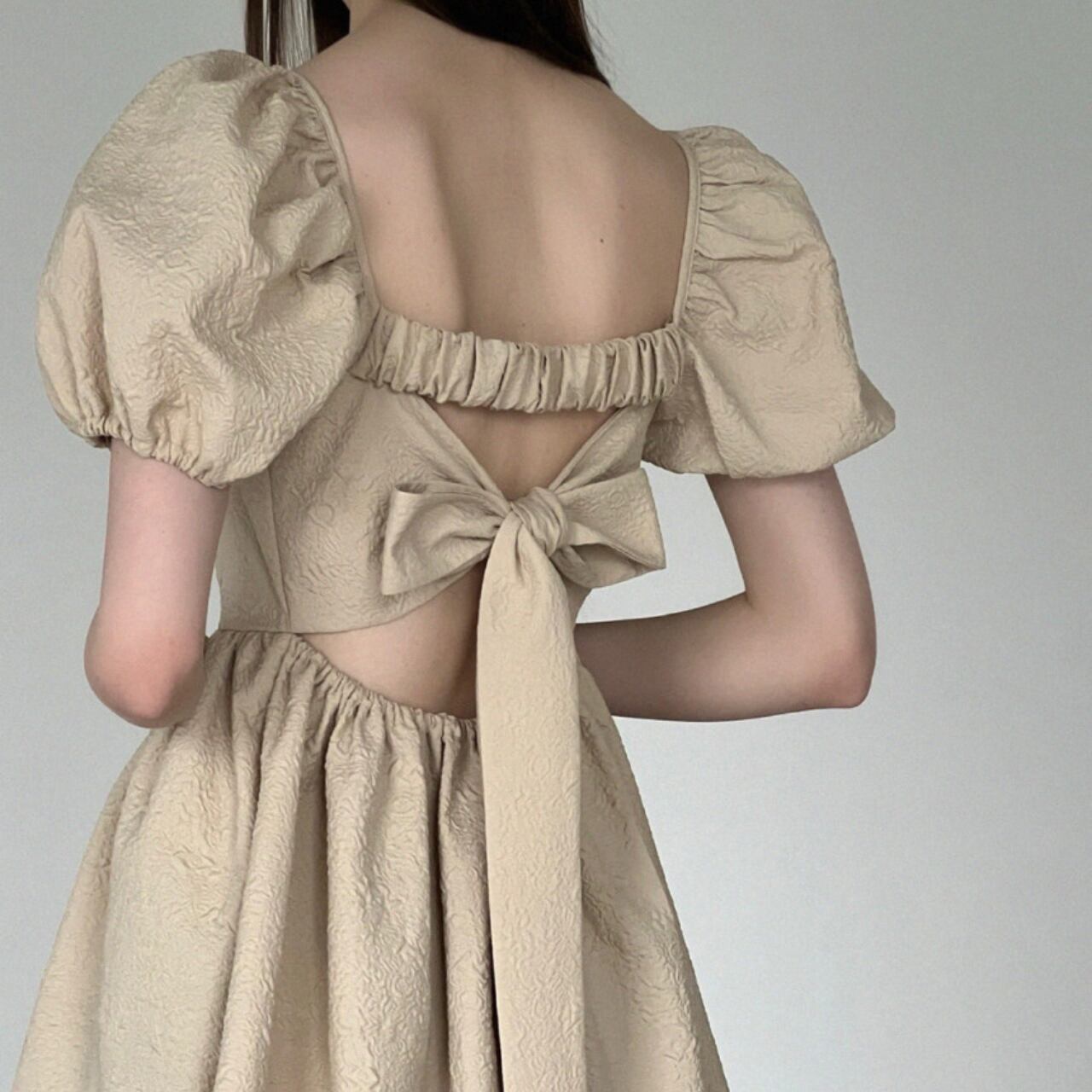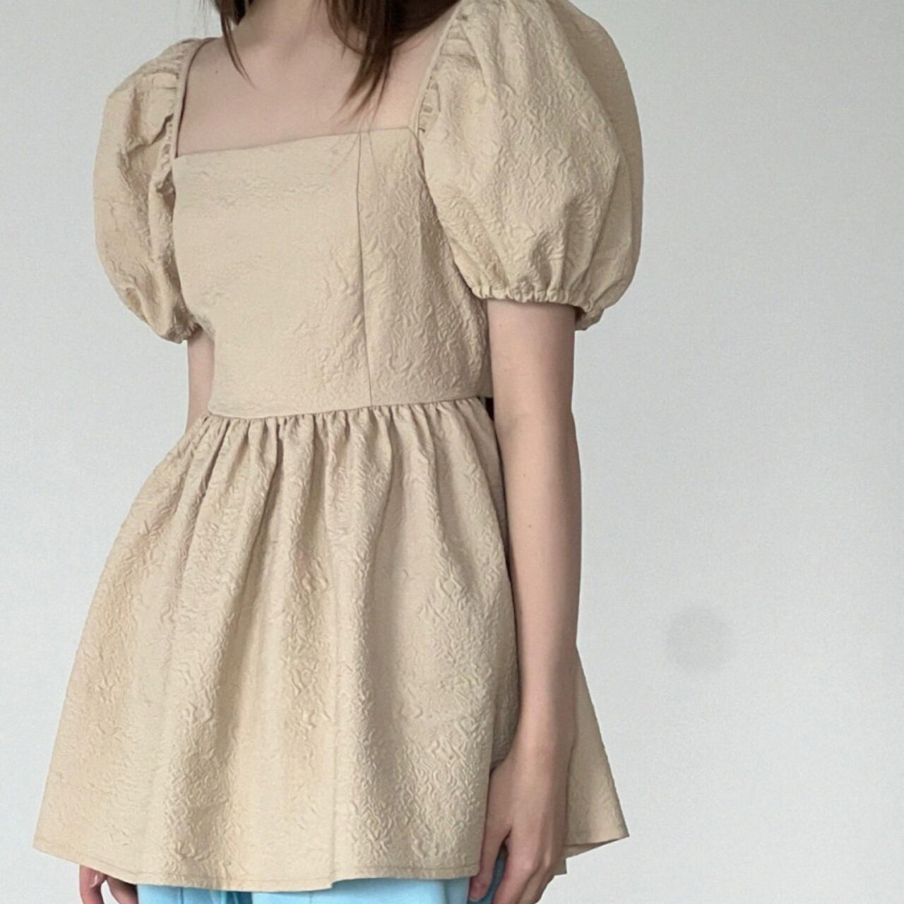 エレガントなスクエアネックとふんわりパフスリーブが女性らしさを演出し、後ろのリボンディテールが上品で特別感のあるアクセントになったブラウス。バックスタイルまで美しく、ペプラムシルエットで体型カバーしながら360度どこから見ても魅力的なシルエットを演出します。後ろ姿にも自信が持てる洗練されたデザインが魅力的な一枚です。