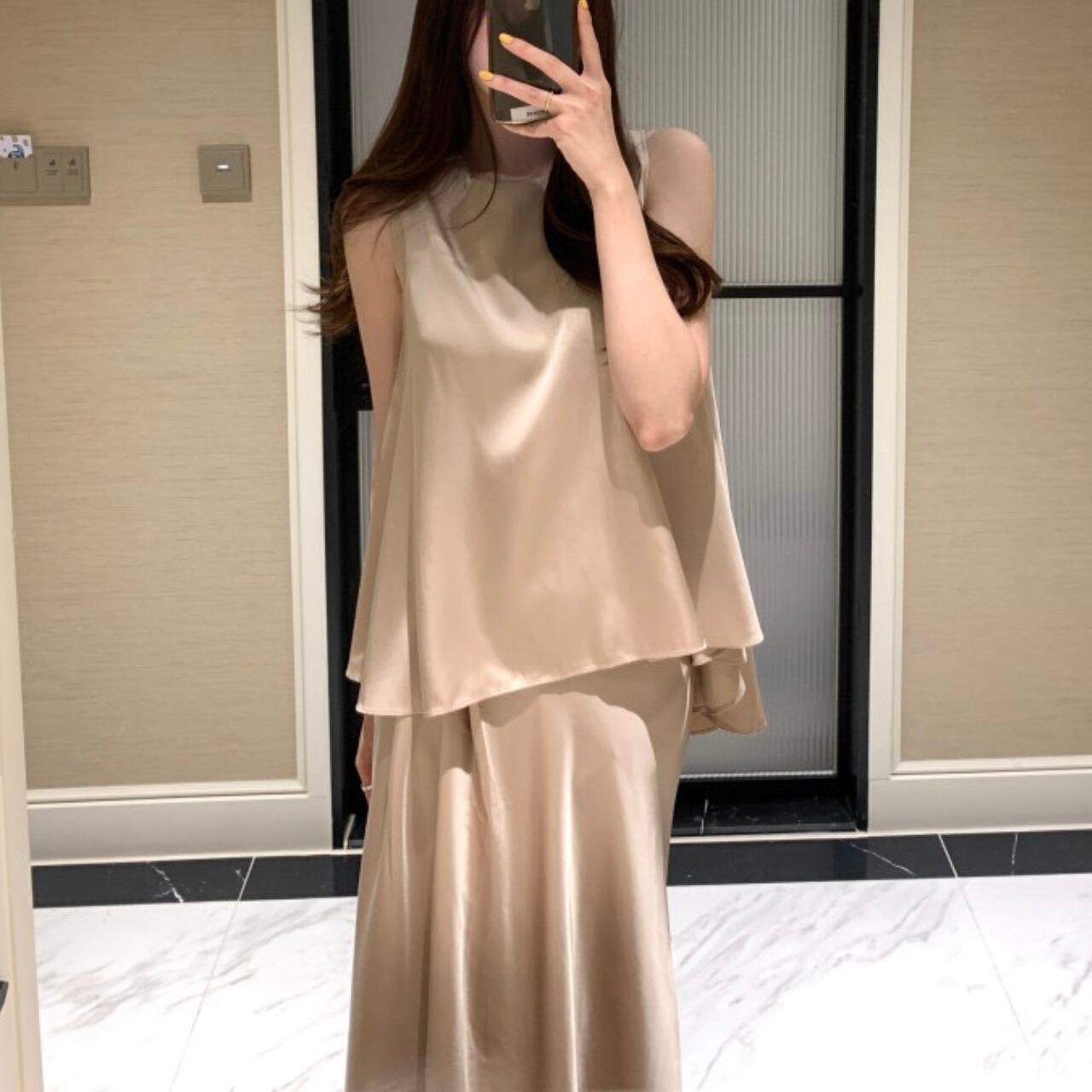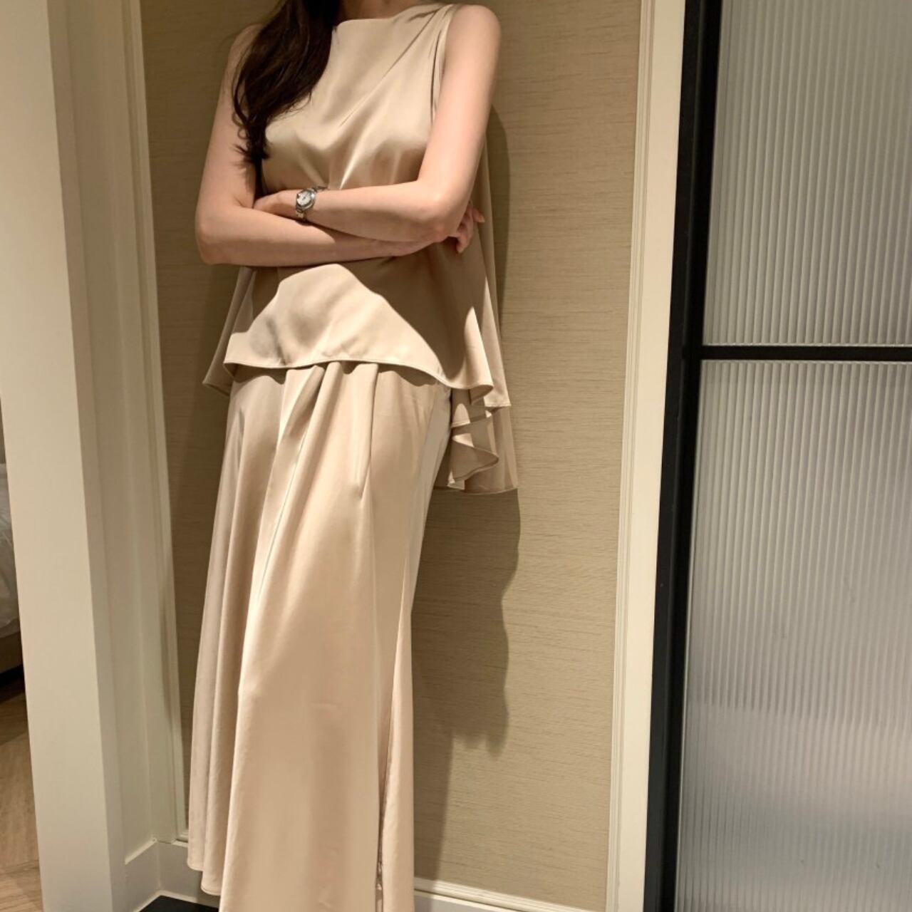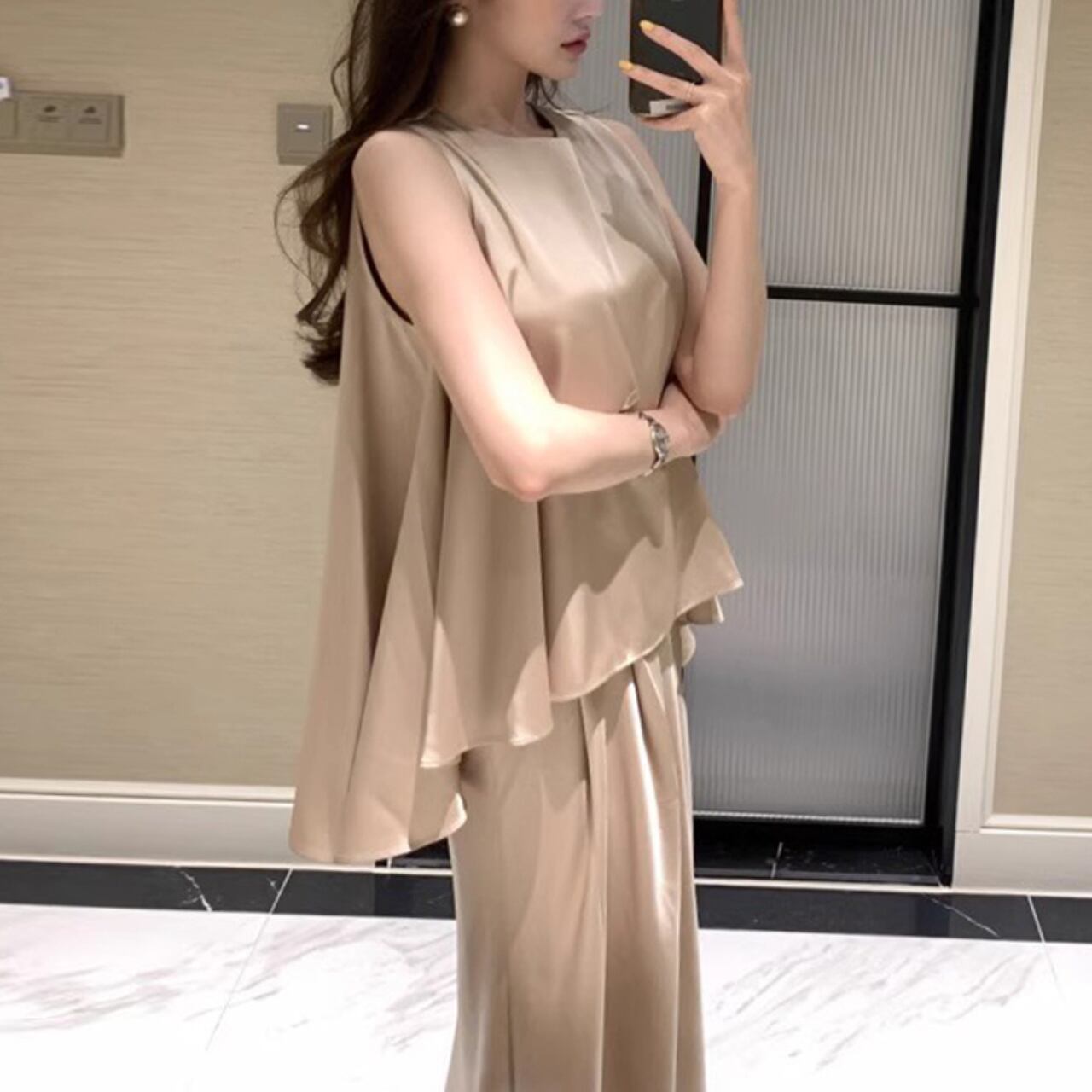 アシンメトリー サテンノースリーブ&スカート セットアップ A4259