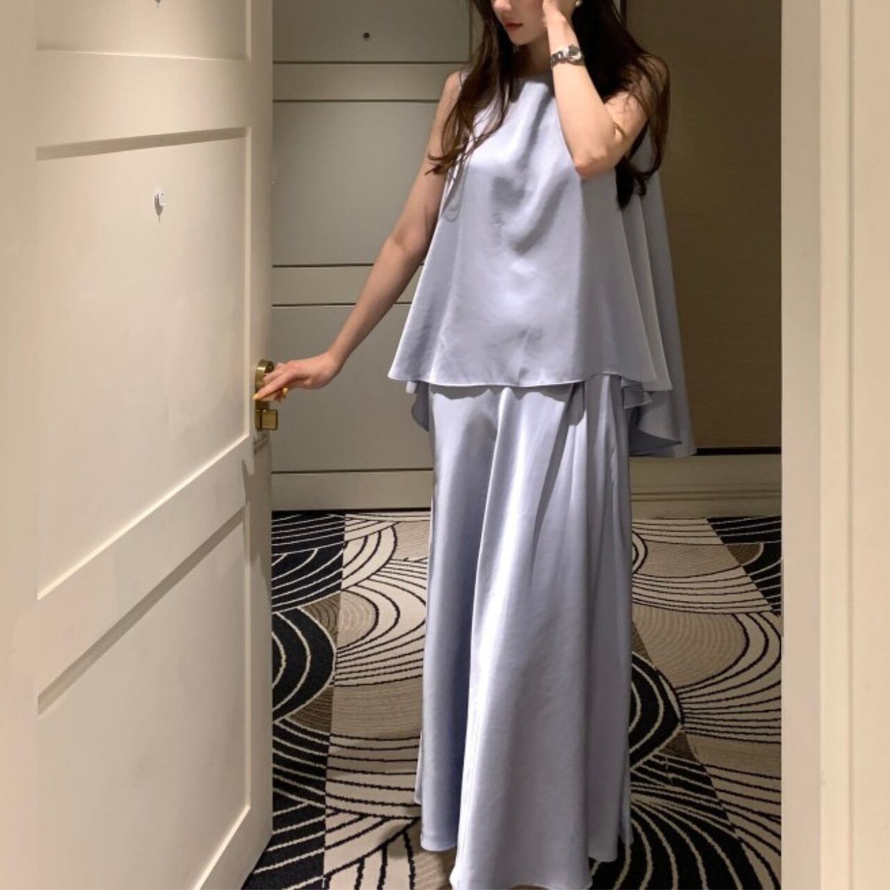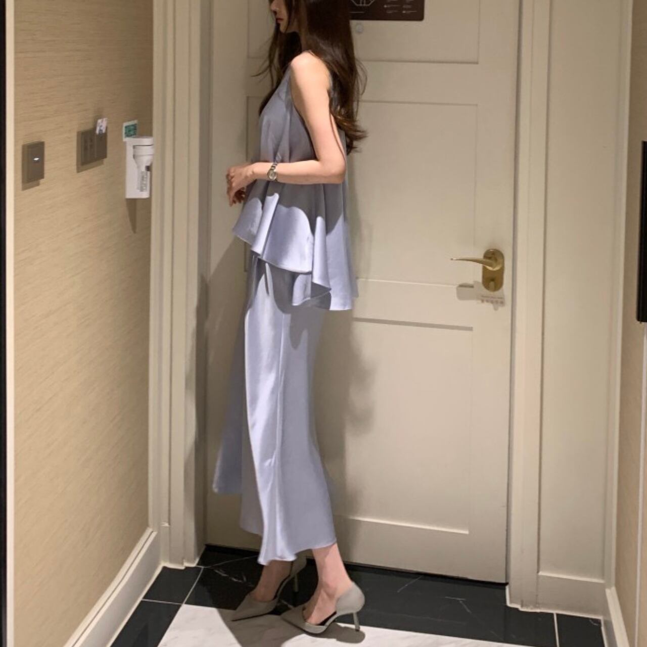 アシンメトリー サテンノースリーブ&スカート セットアップ A4261