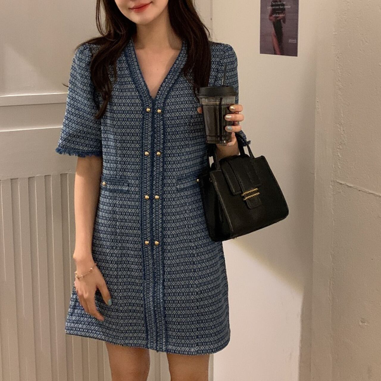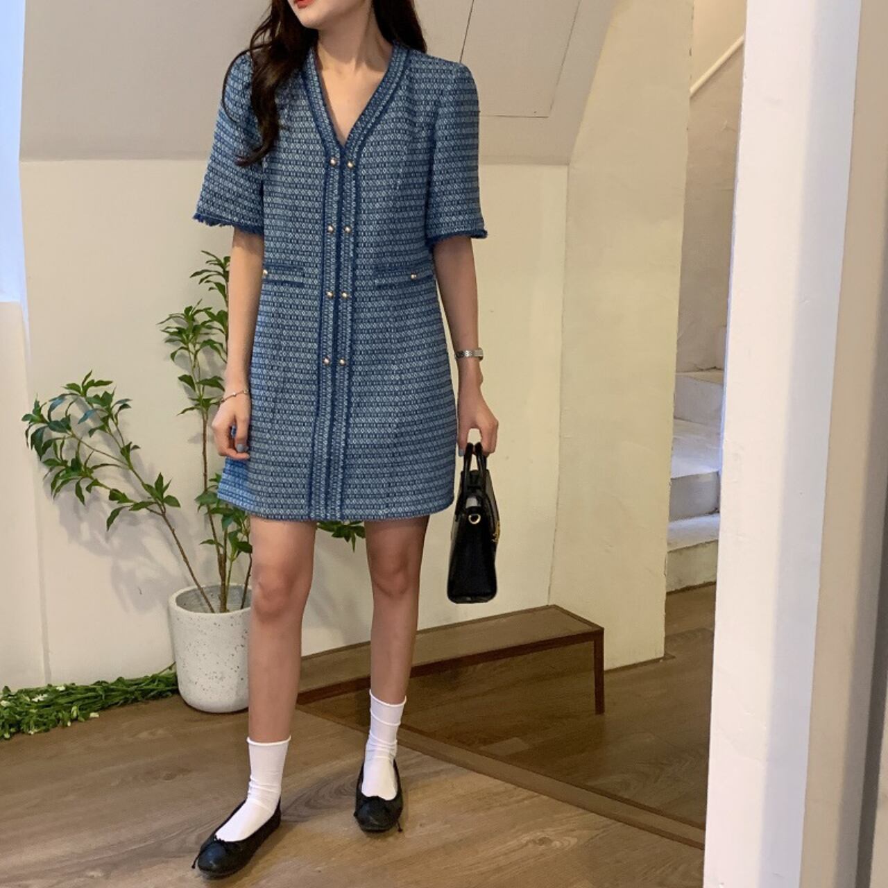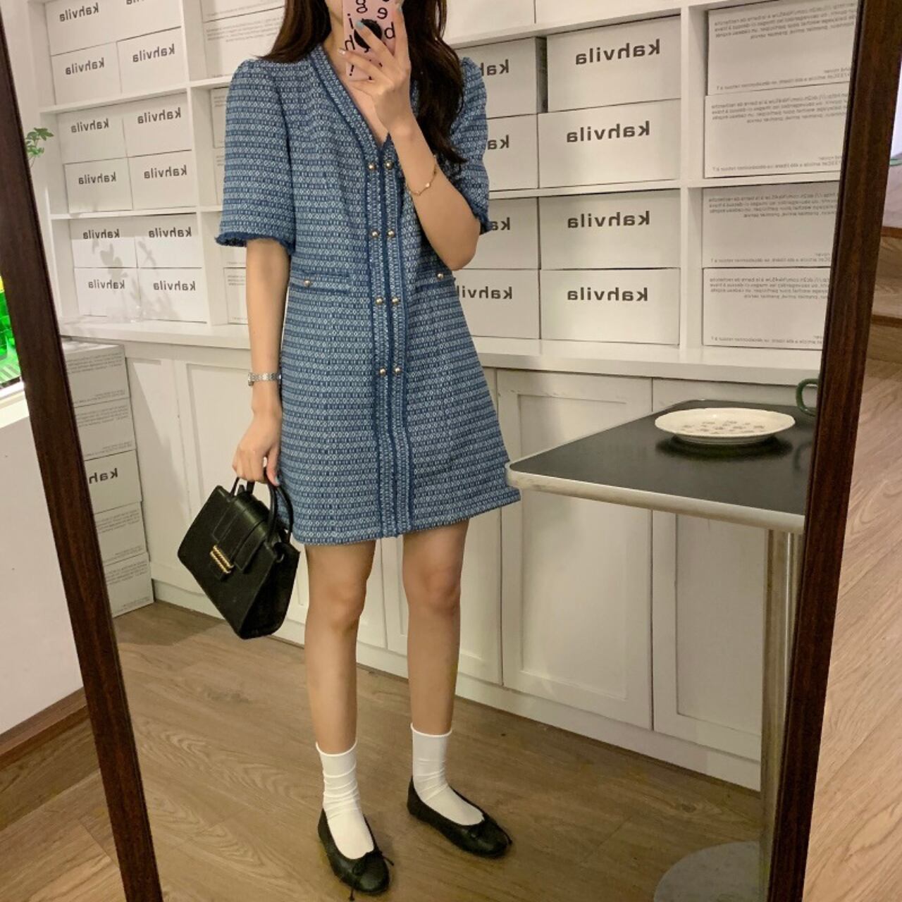 上品でフェミニンな柄のワンピースです。涼しげなブルーのカラーがこれからの時期に映える一着です。
