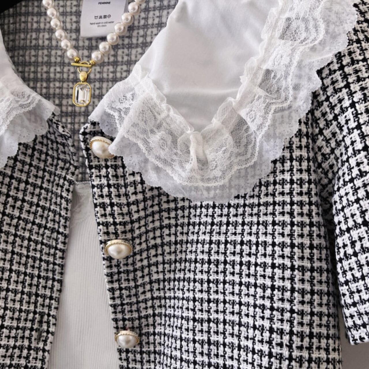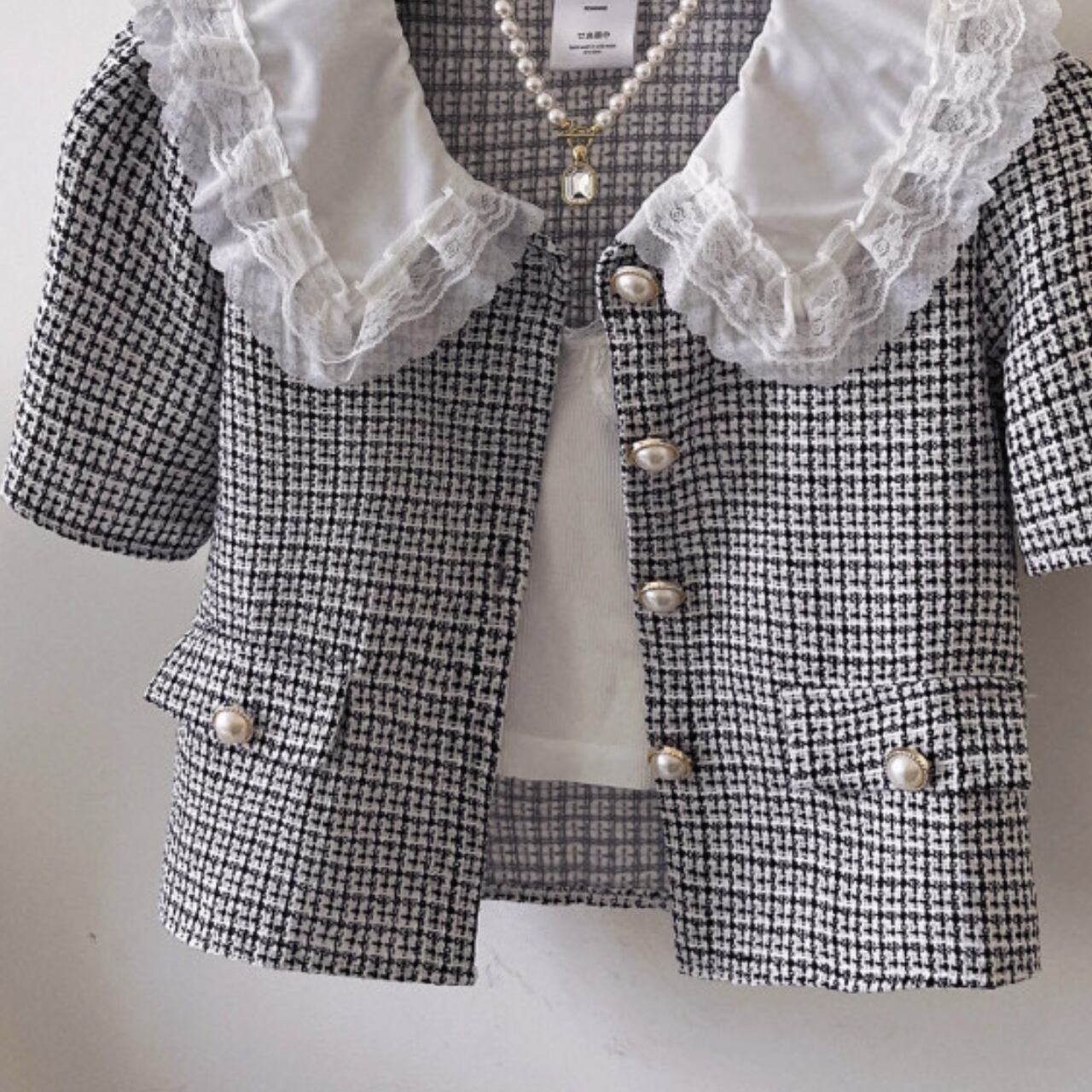 クラシックで洗練された印象を与える、エレガントなジャケットです。一番のポイントは襟元の白いレースディテール。フェミニンな要素がプラスされることで、従来のツイードジャケットよりも柔らかく上品な印象に仕上がっています。