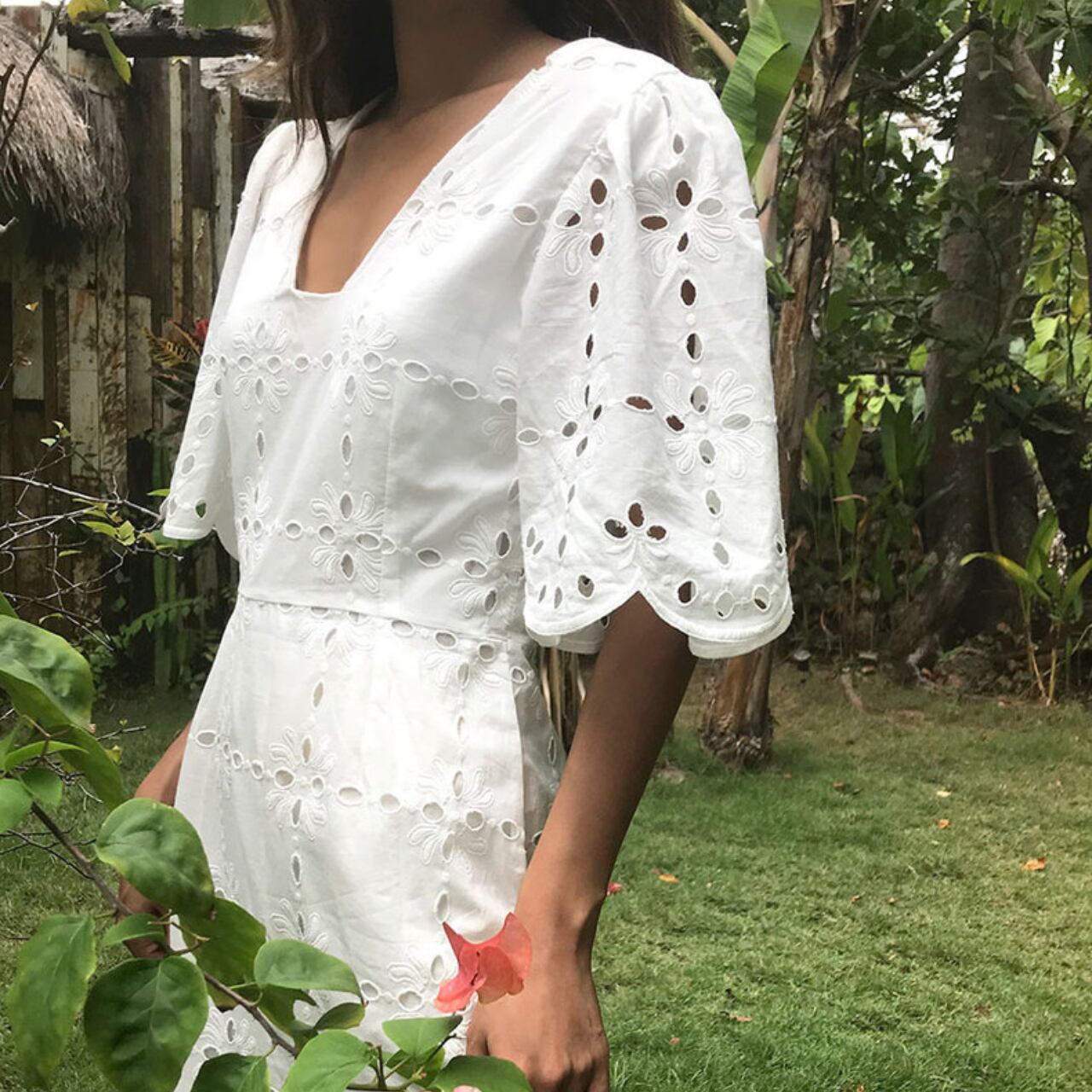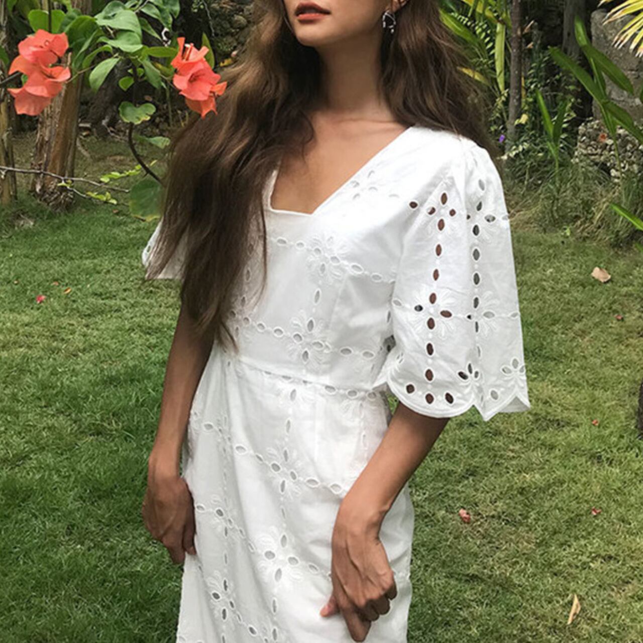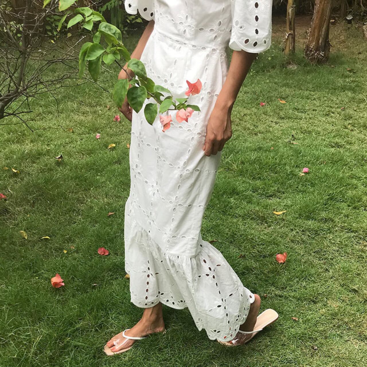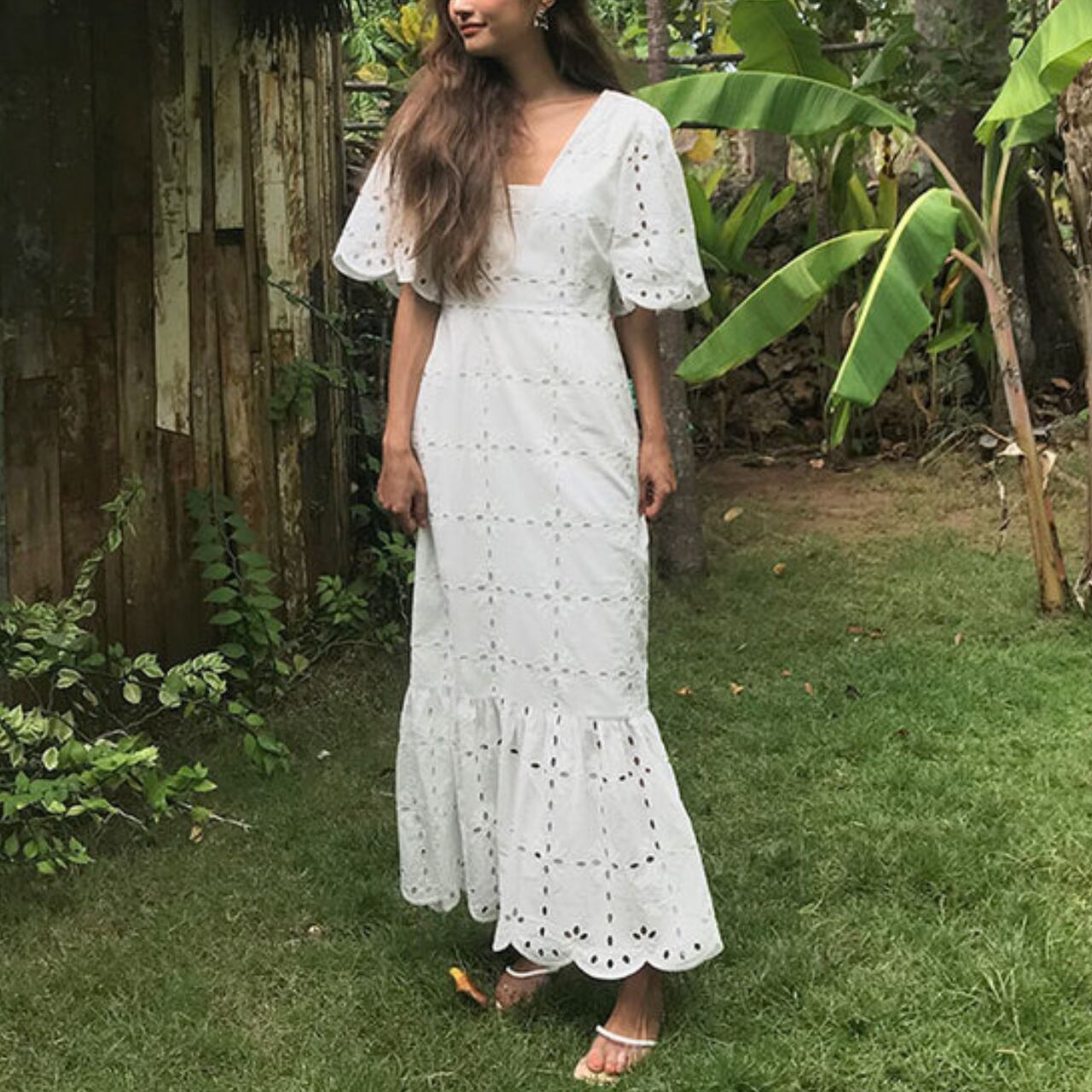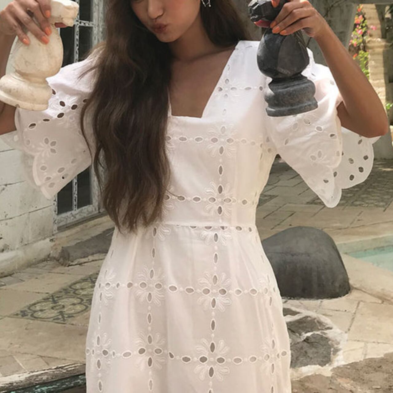 フレアな裾が優雅さを引き立てるワンピースです。ドット柄の切り替えが印象的で、華やかさを演出します。