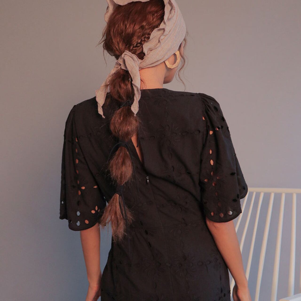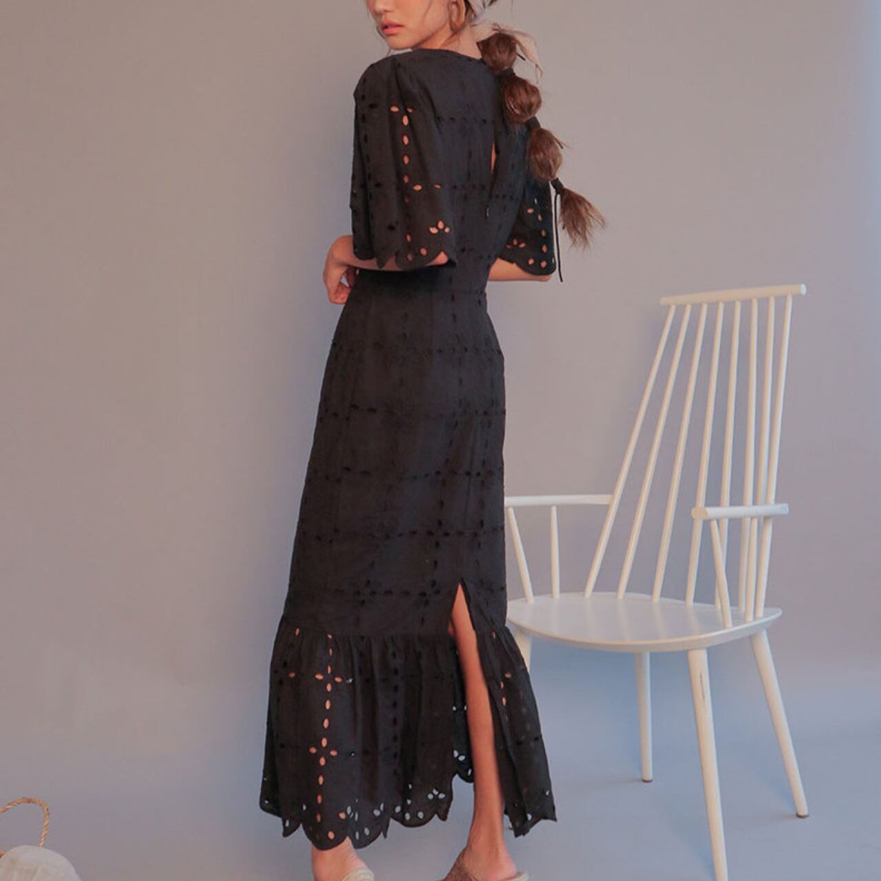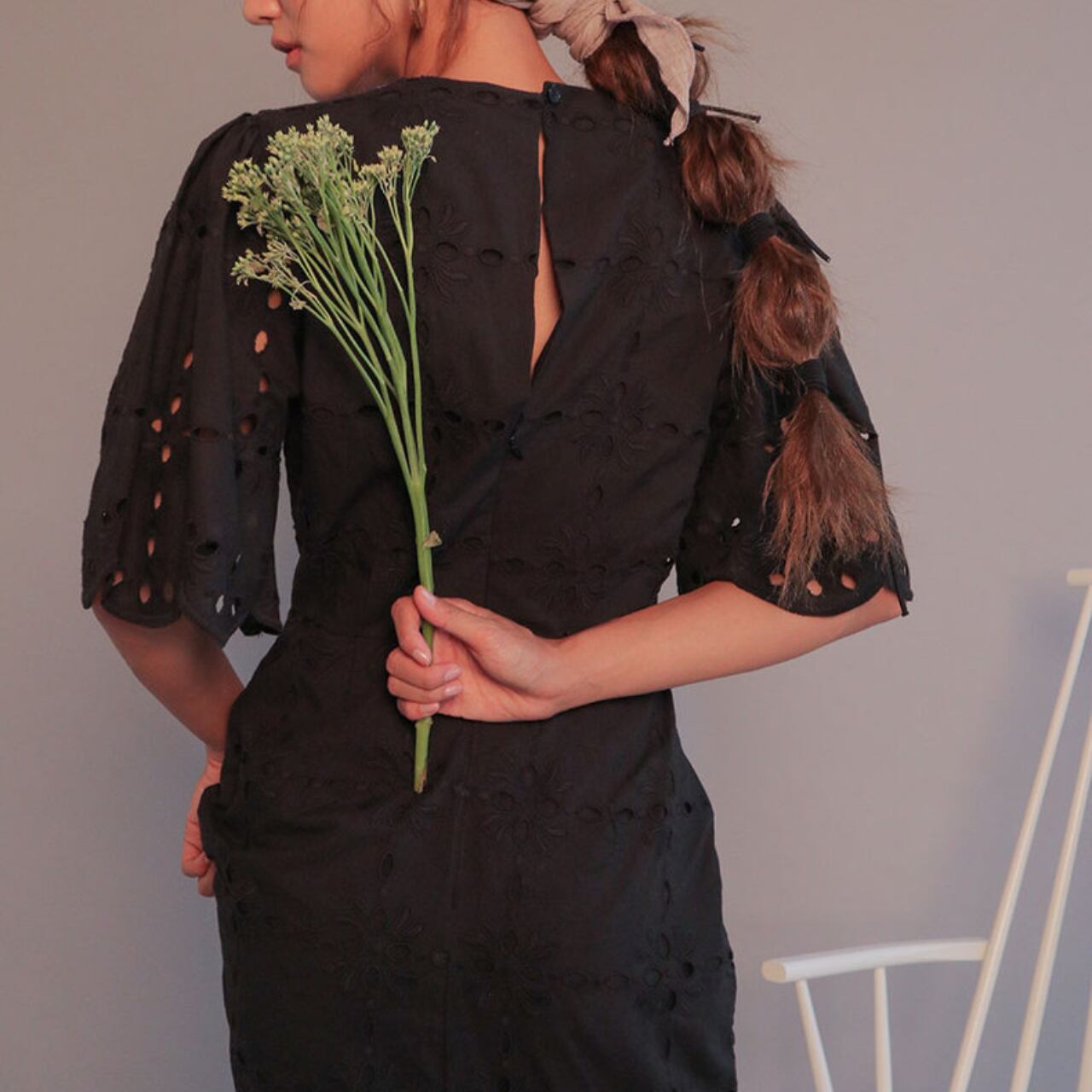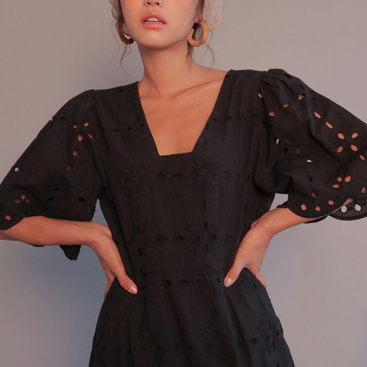 フレアな裾が優雅さを引き立てるワンピースです。ドット柄の切り替えが印象的で、華やかさを演出します。