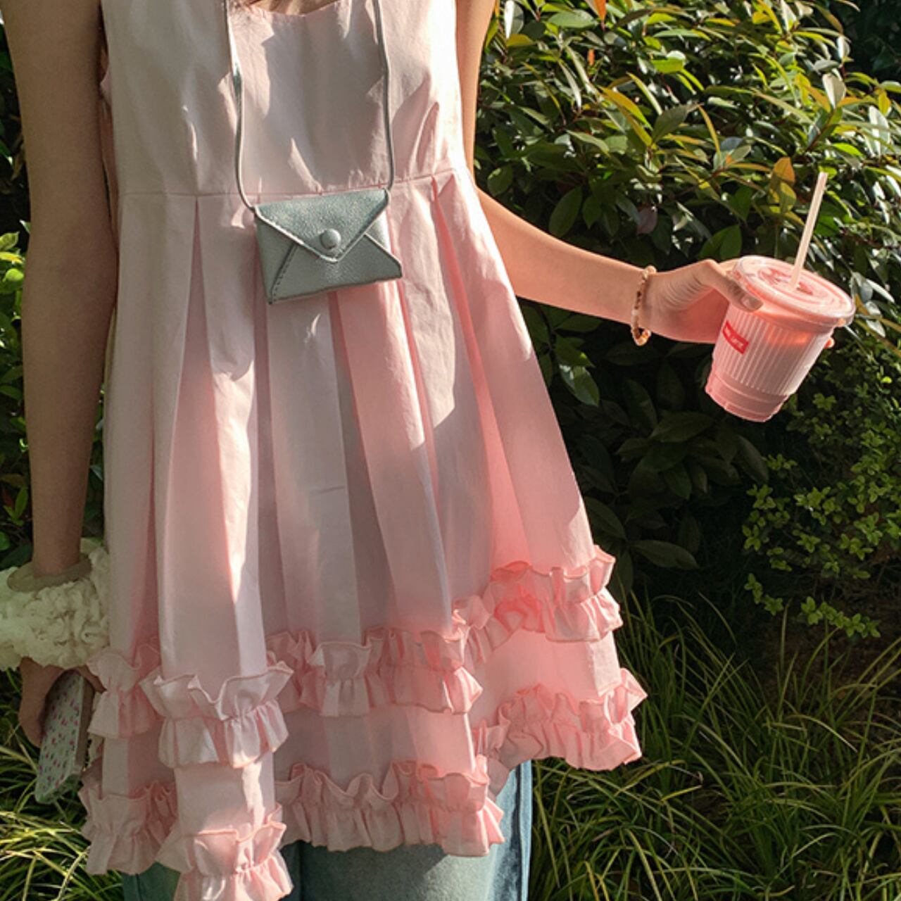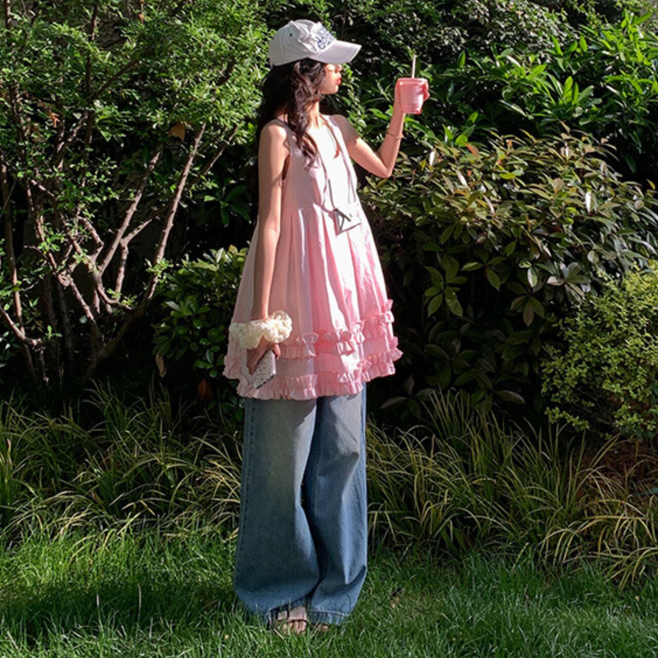 この愛らしいピンクのキャミソールワンピースは、ふんわりと広がるティアードスカートが乙女心をくすぐるような一着です。やわらかなピンクカラーがお肌をぱっと明るく見せ、裾の重なるフリルがひらひらと舞うたびに可愛らしさを演出します。