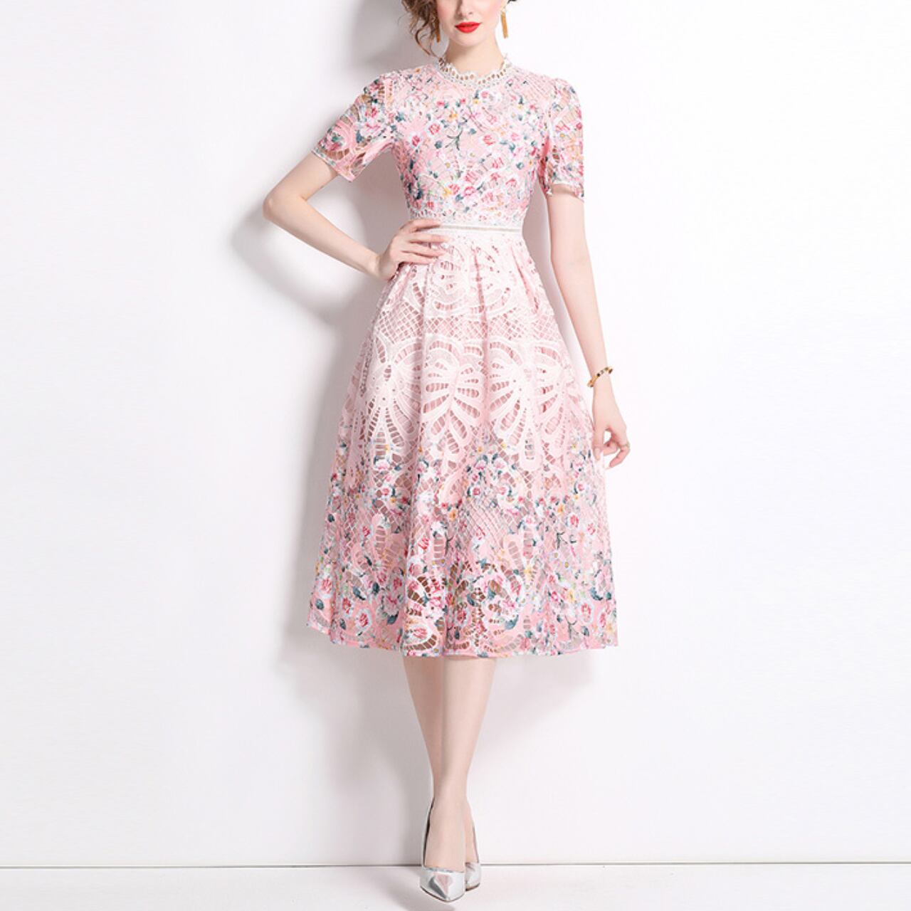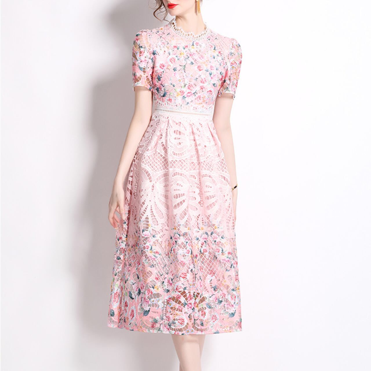 ピンクレース フラワーフィットフレアドレス A4293