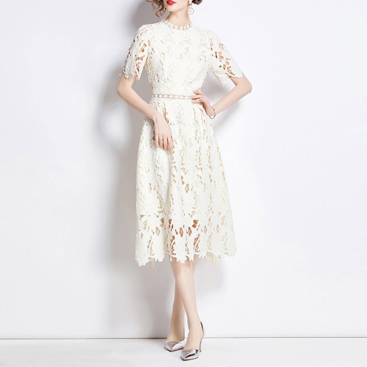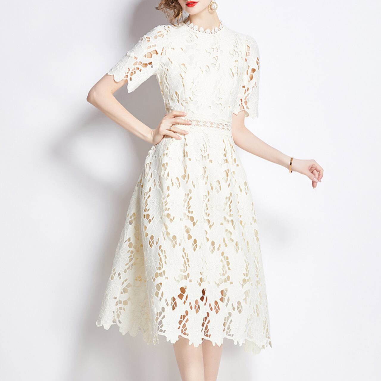 レースがエレガントなワンピースです。ハイネックで上品な印象を与えてくれます。デートや特別な日のおよばれにぴったりです。