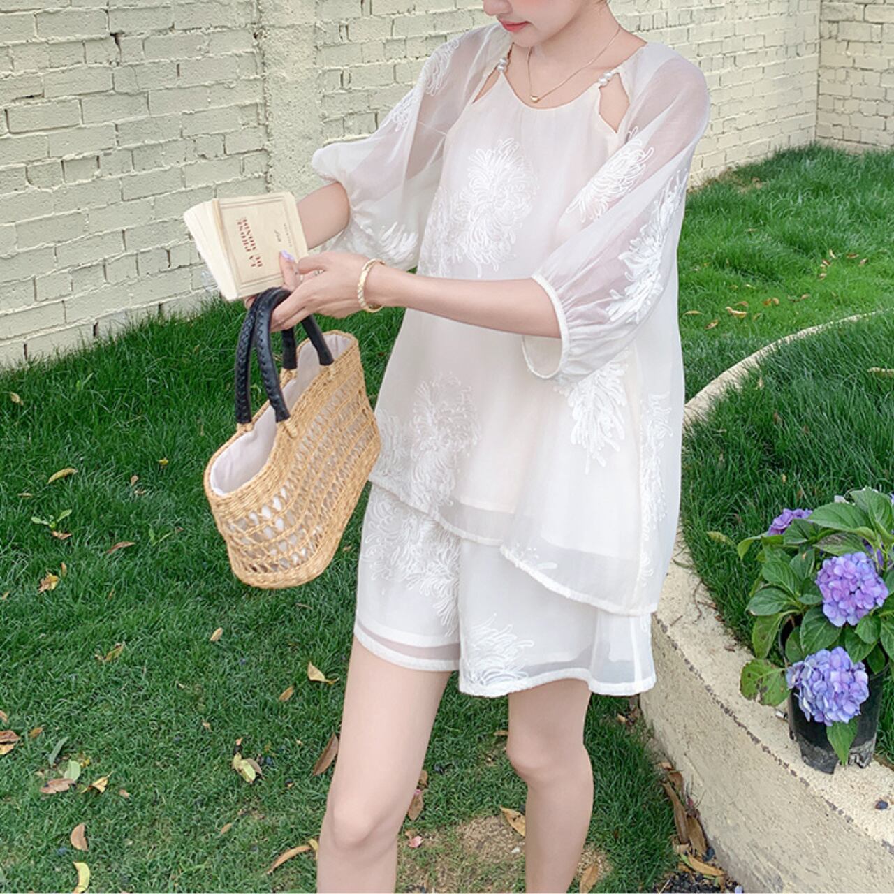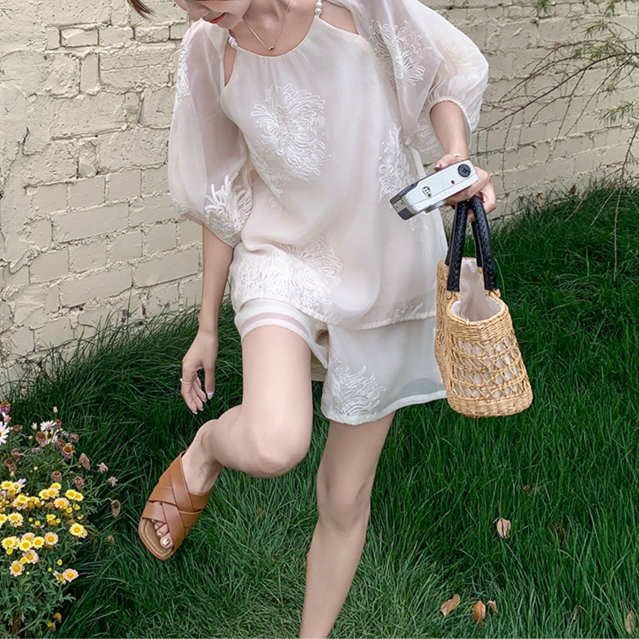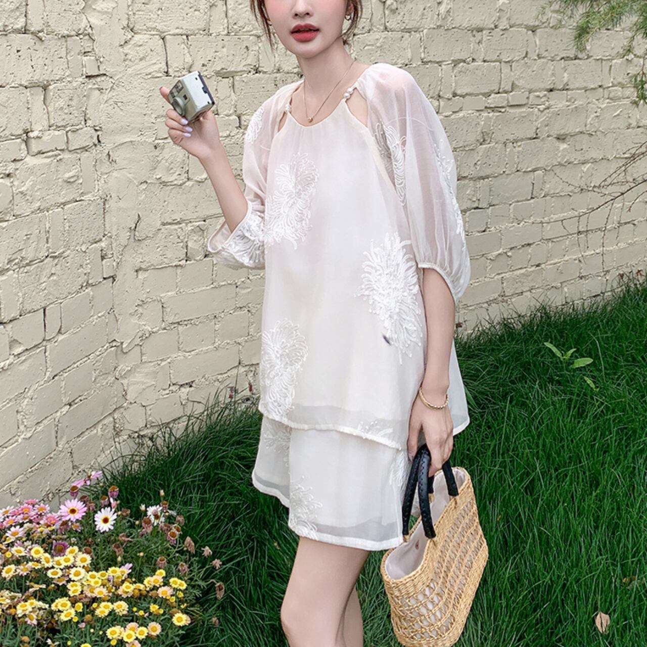 ふんわりと透け感のあるシアースリーブが、女性らしさを引き立てるチュニックとショートパンツのセットアップ。上品なデザインは、シンプルながらも目を引く一着です。