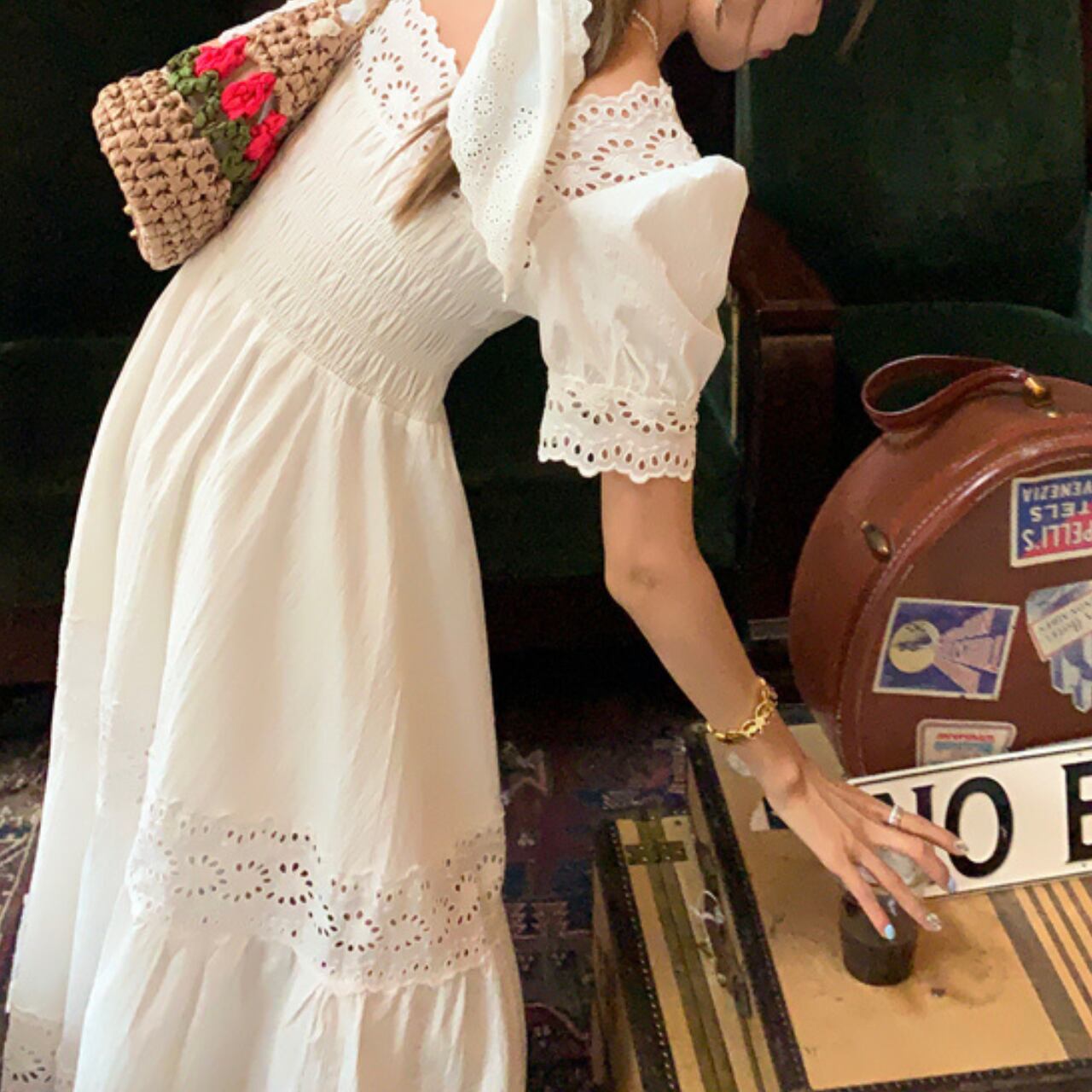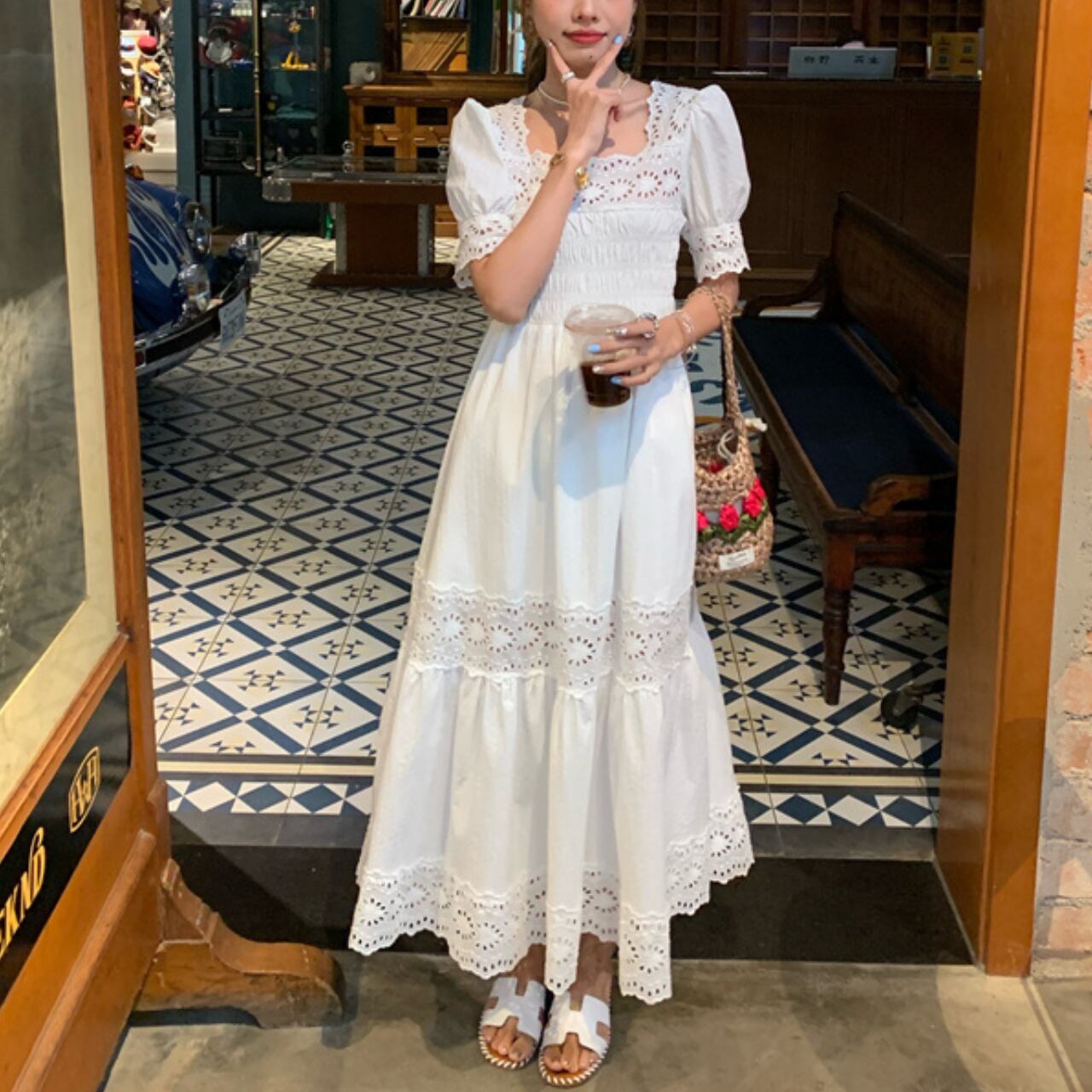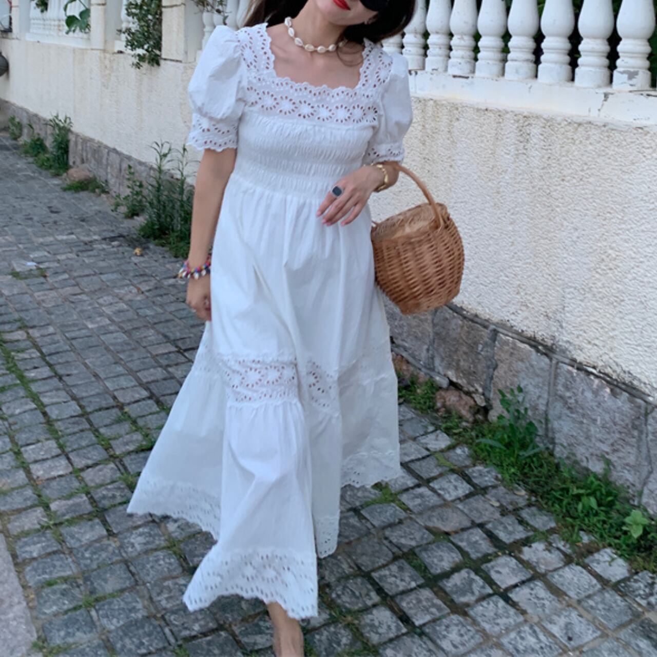 シンプルでベーシックなスクエアカラーデザイン。胸元から背中にかけての刺繍レースが女性らしさをプラスし、ロマンティックなコットンレースワンピースです。スカート部分はウエストゴム仕様で、お腹を締め付けず履き心地も快適です。