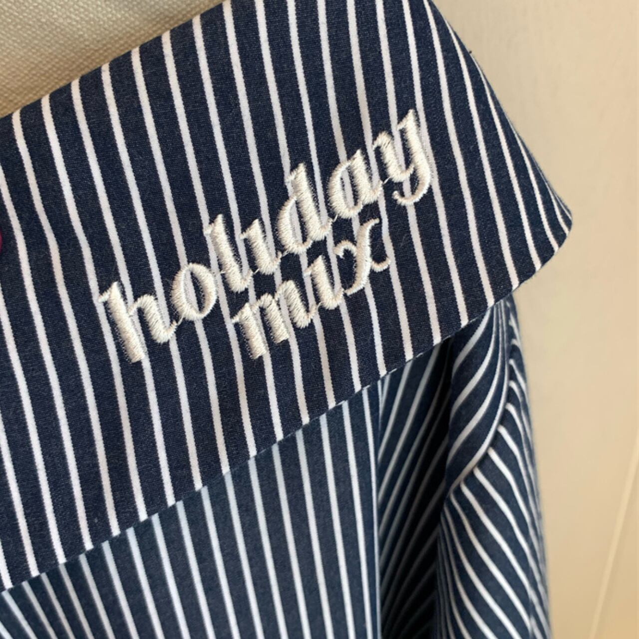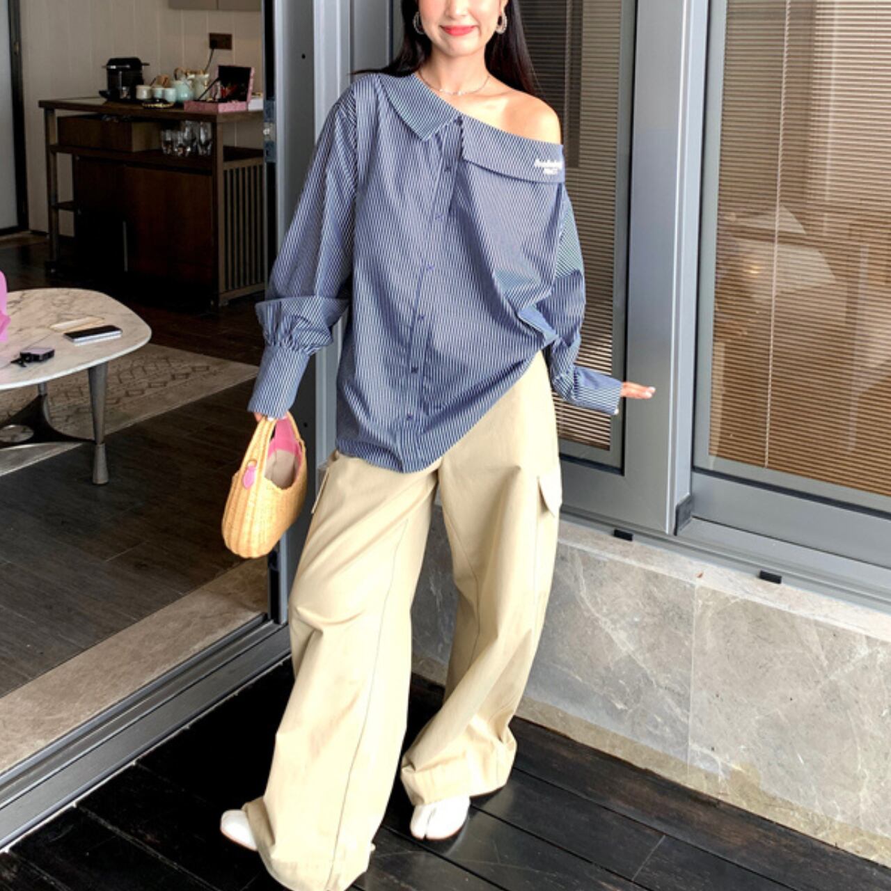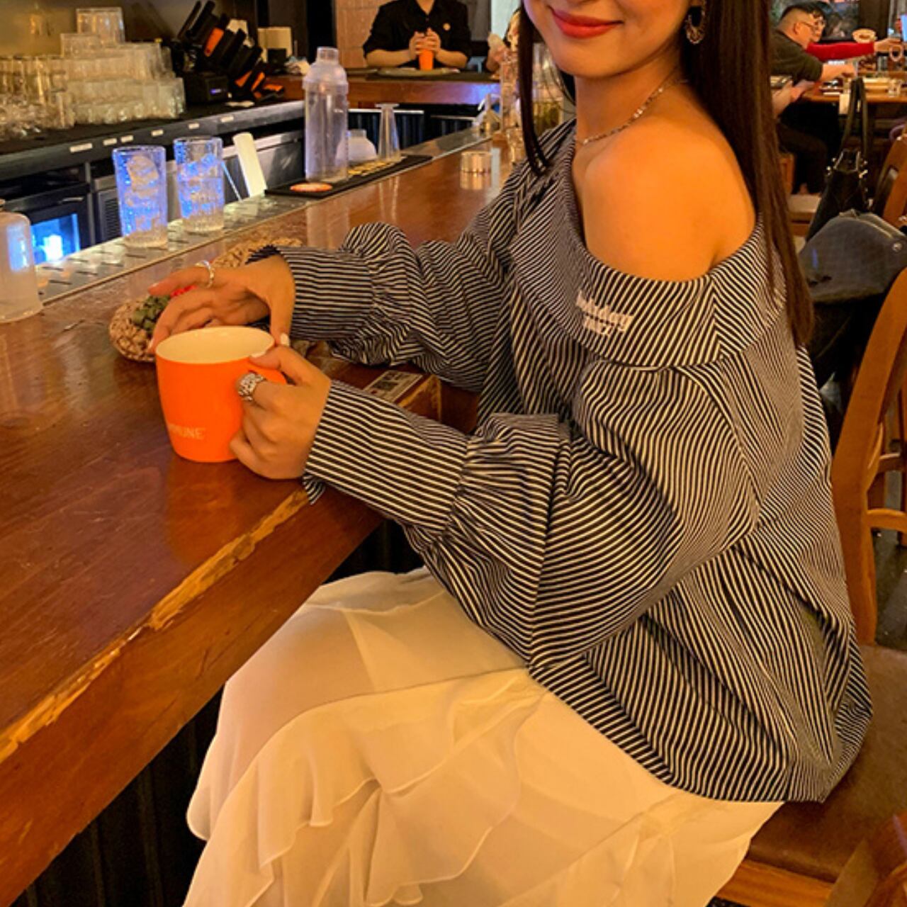 ブルーストライプ ワンショルダープルオーバートップス A4317