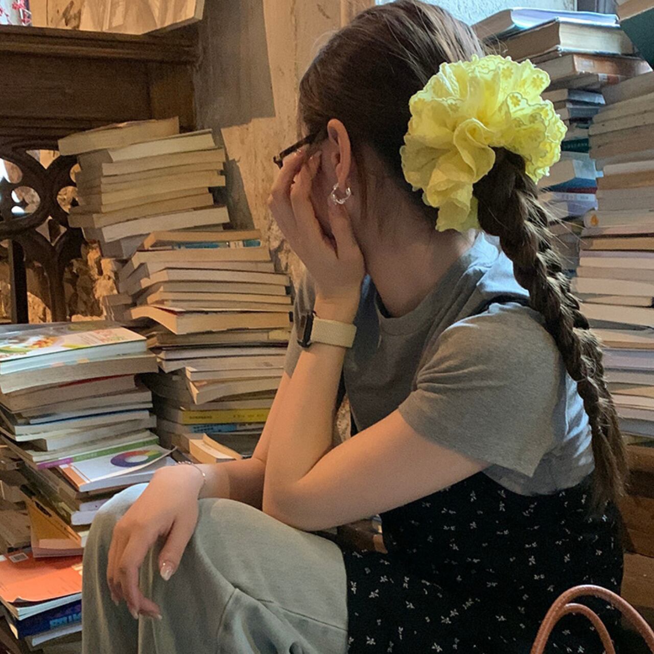 ライトイエローのコットンレースが施されたボリュームシュシュです。華やかなデザインが、シンプルな髪型に特別なアクセントを加え、カジュアルスタイルからフォーマルスタイルまで、さまざまなシーンで活躍します!元気の出るカラーがポイントで、リンクコーデやモノトーンコーデのポイントとしてのぜひ!