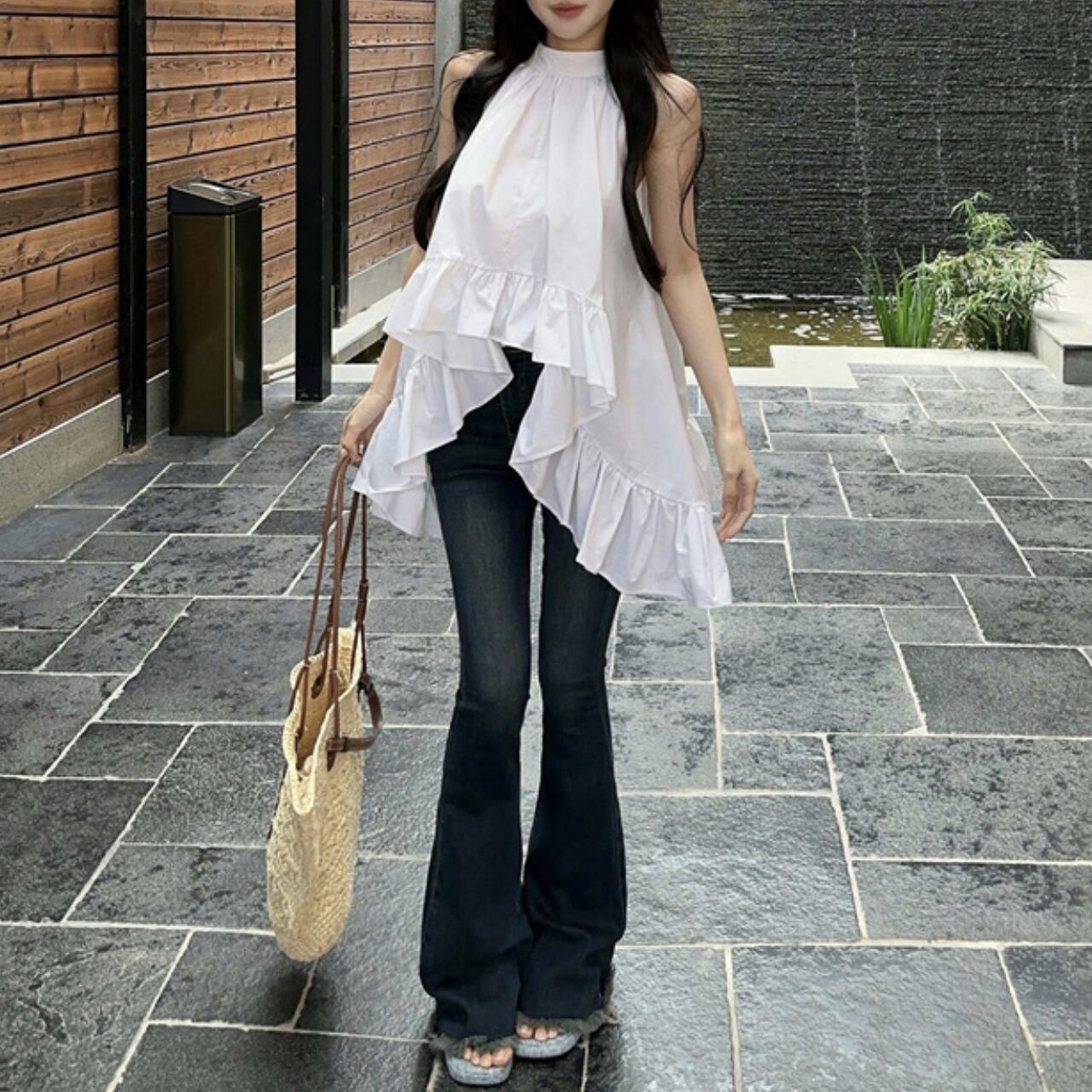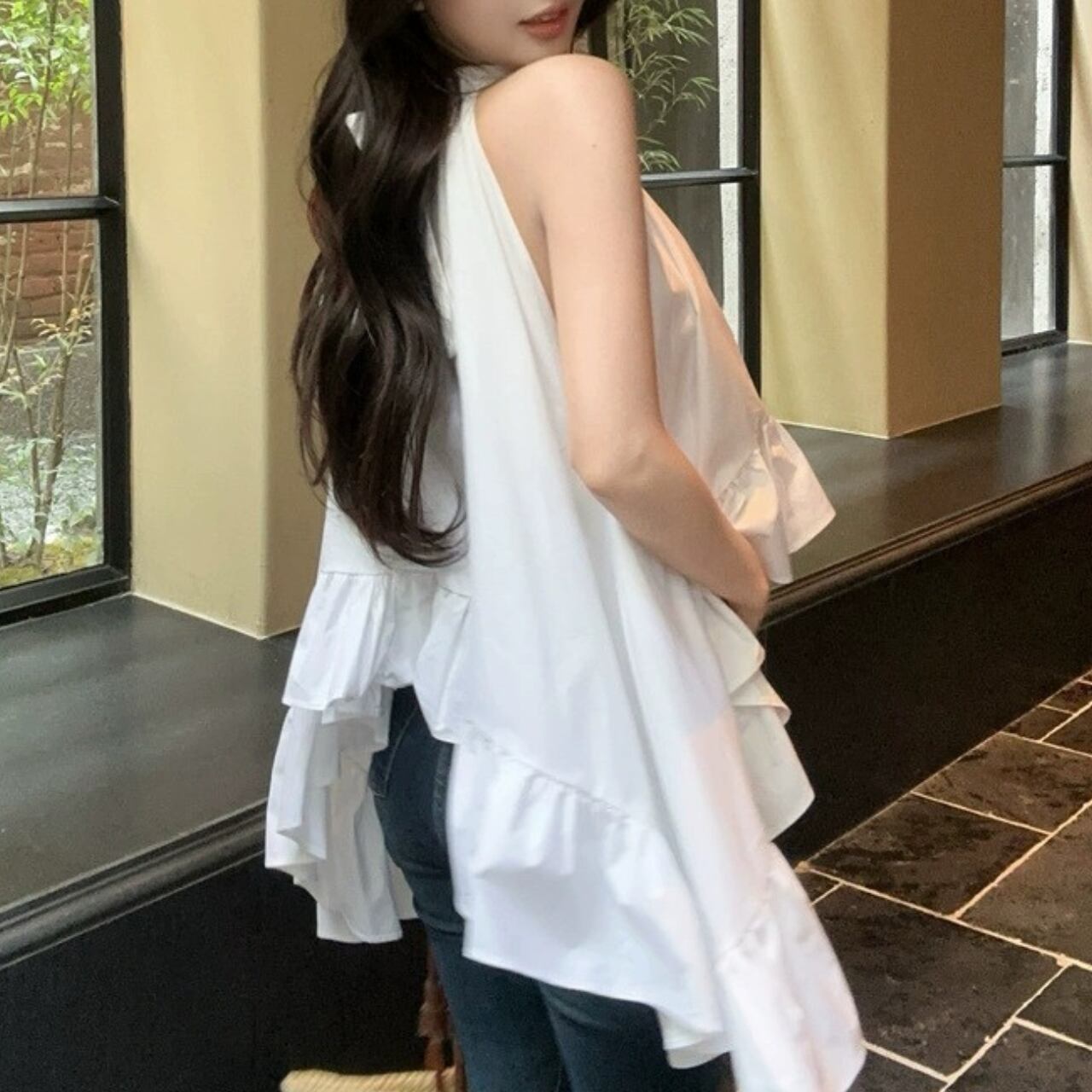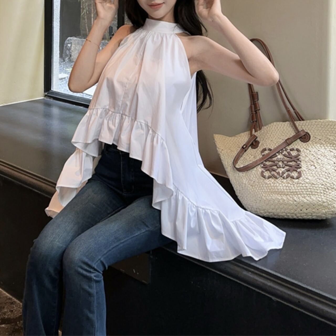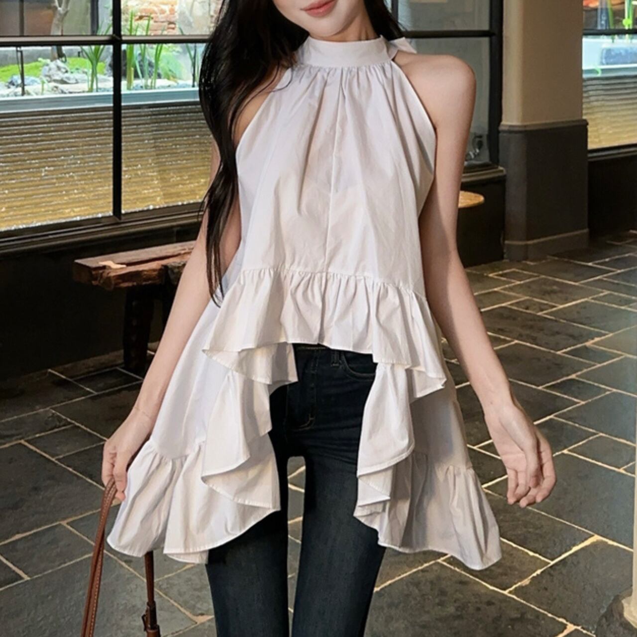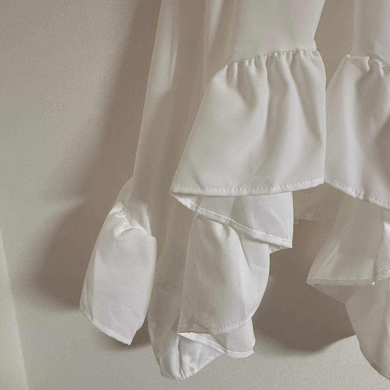 ハイネックラインとティアードデザインが女性らしさを演出。デニムと合わせてカジュアルに、スカートと組み合わせればデートや女子会などの特別な日にもぴったり。白という万能カラーで、どんなボトムスとも相性抜群です。広がる裾のデザインが体型カバー効果もあり、自然な女性らしさを演出できる一着です。