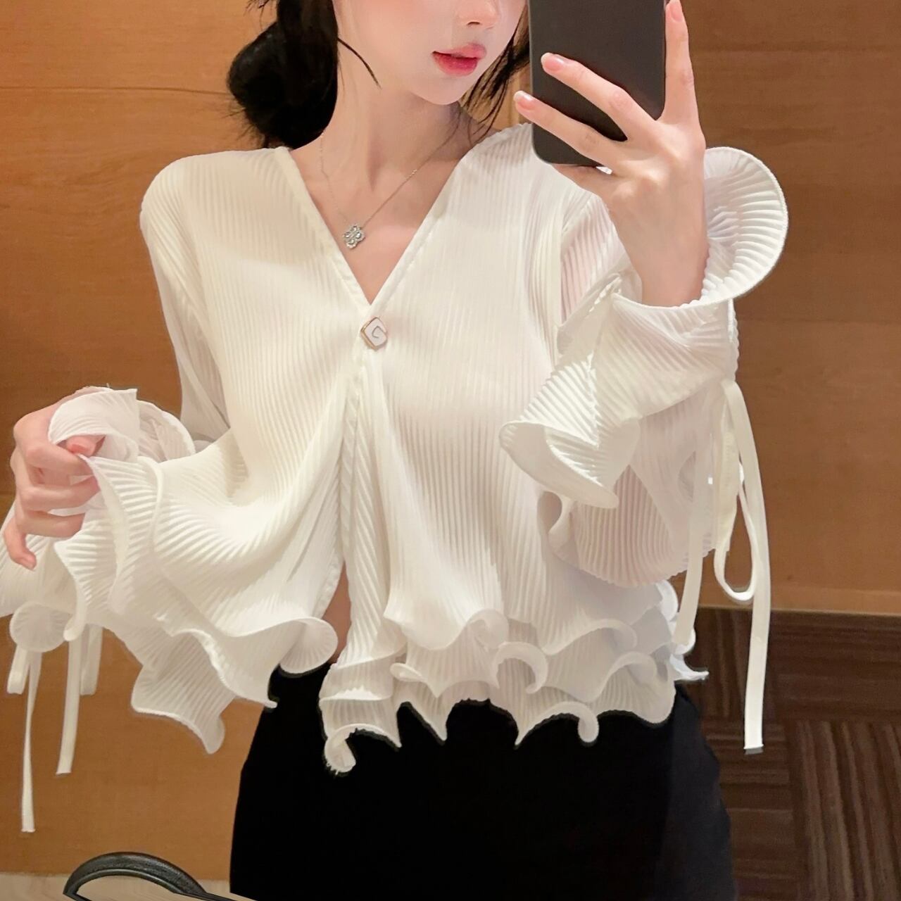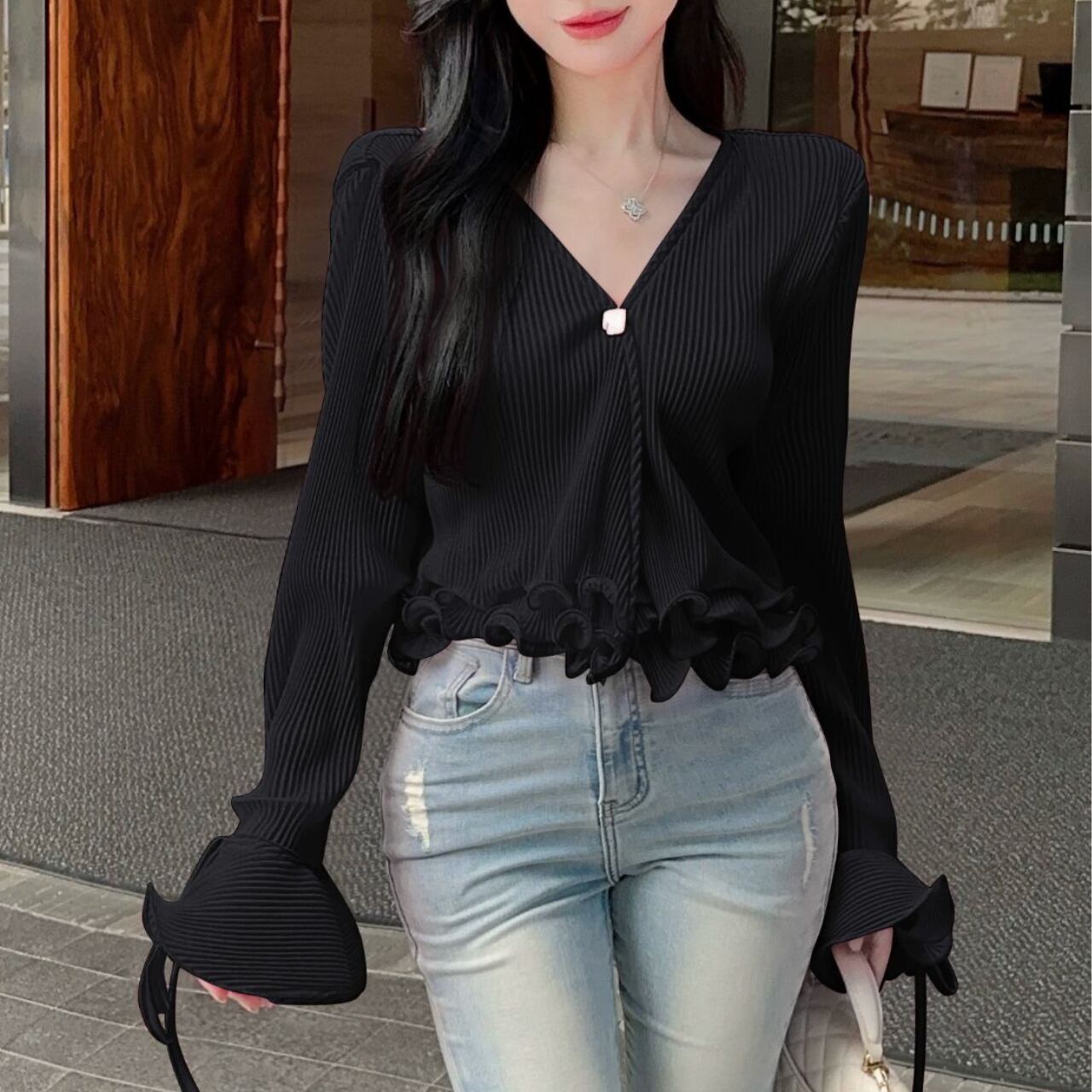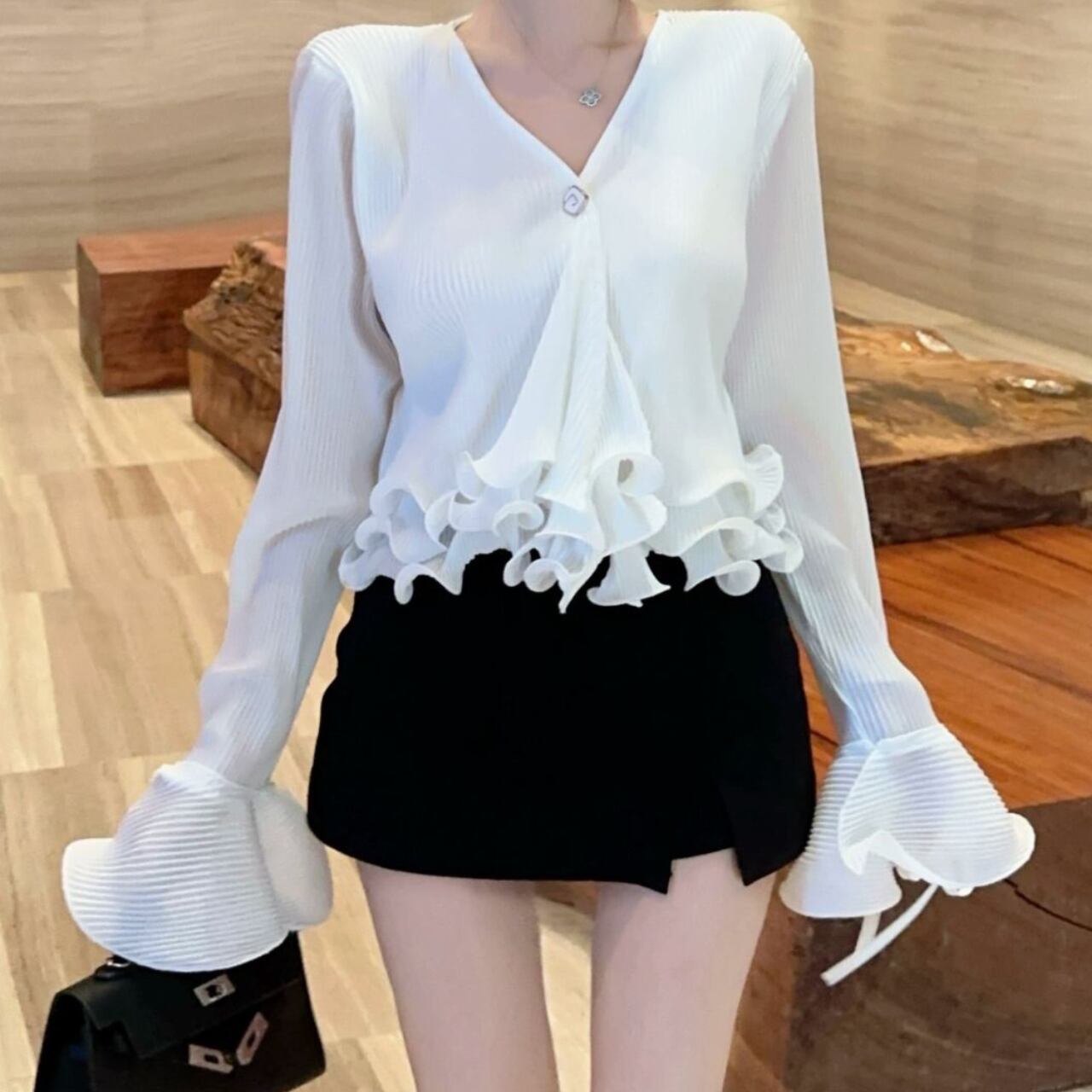 Vネックデザインと裾に女性らしいシルエットを演出しています。特に袖口の波打つフリルディテールがエレガントなアクセントとなり、手元を美しく見せてくれます。裾のフリルと合わせて、シンプルながらも印象的なデザインに仕上がっています。