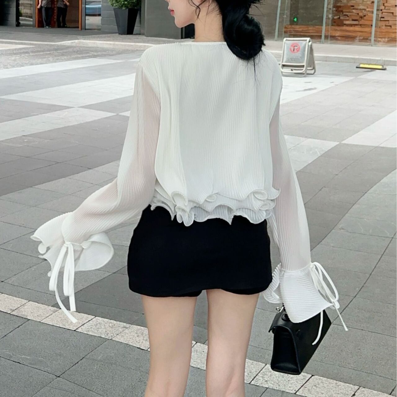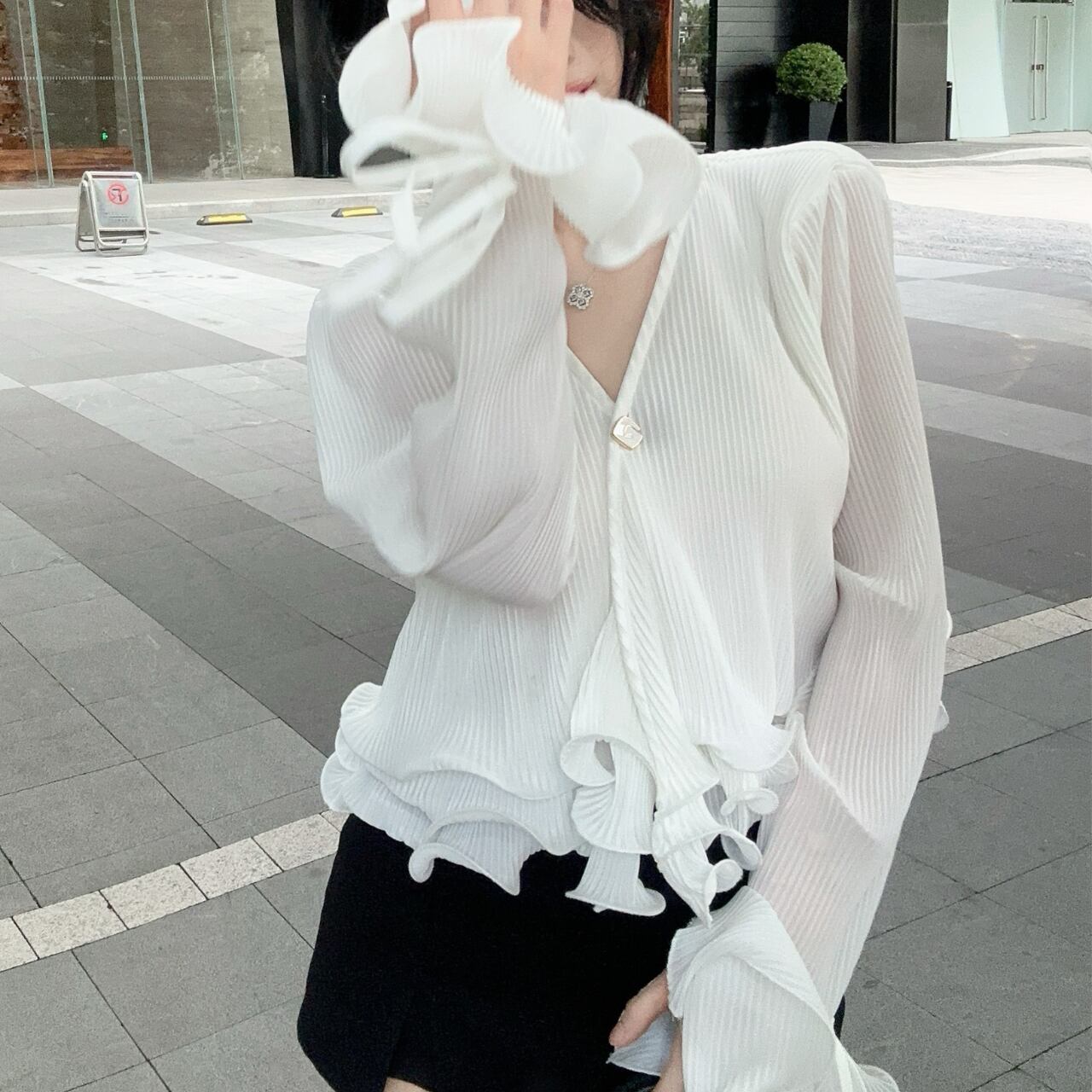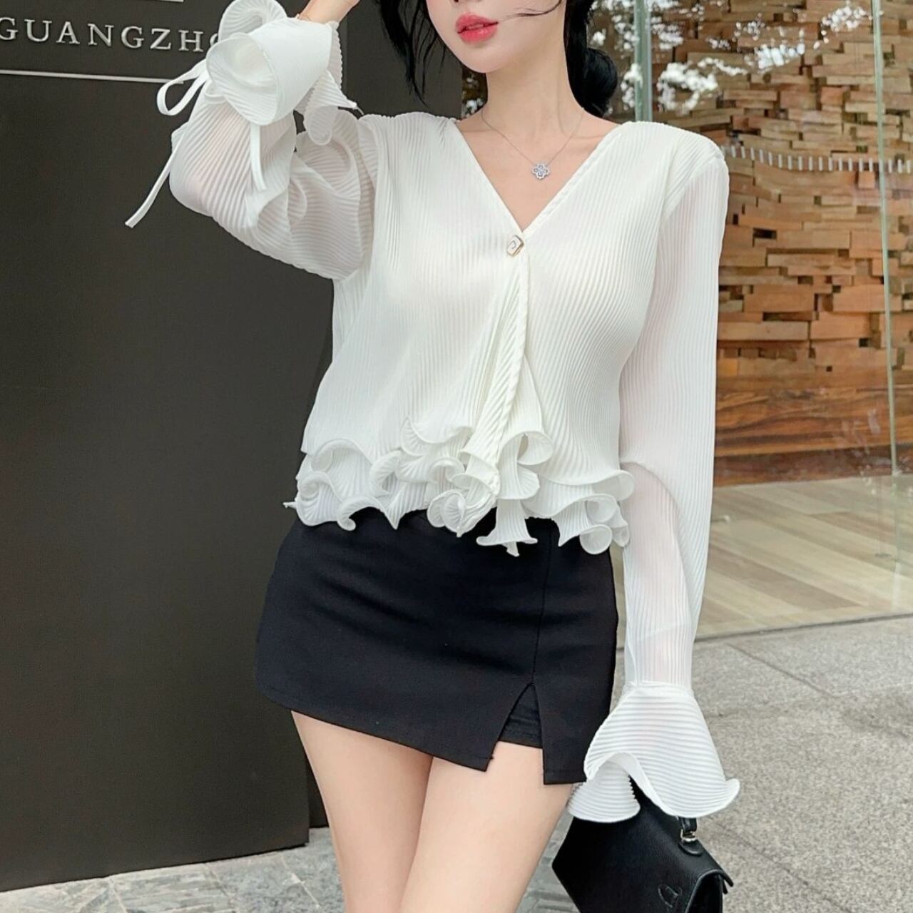 Vネックデザインと裾に女性らしいシルエットを演出しています。特に袖口の波打つフリルディテールがエレガントなアクセントとなり、手元を美しく見せてくれます。裾のフリルと合わせて、シンプルながらも印象的なデザインに仕上がっています。