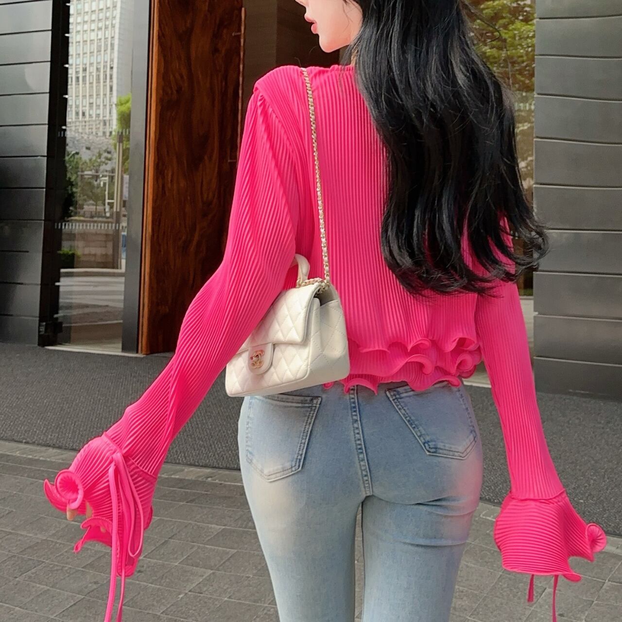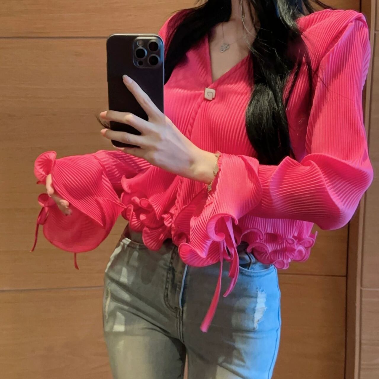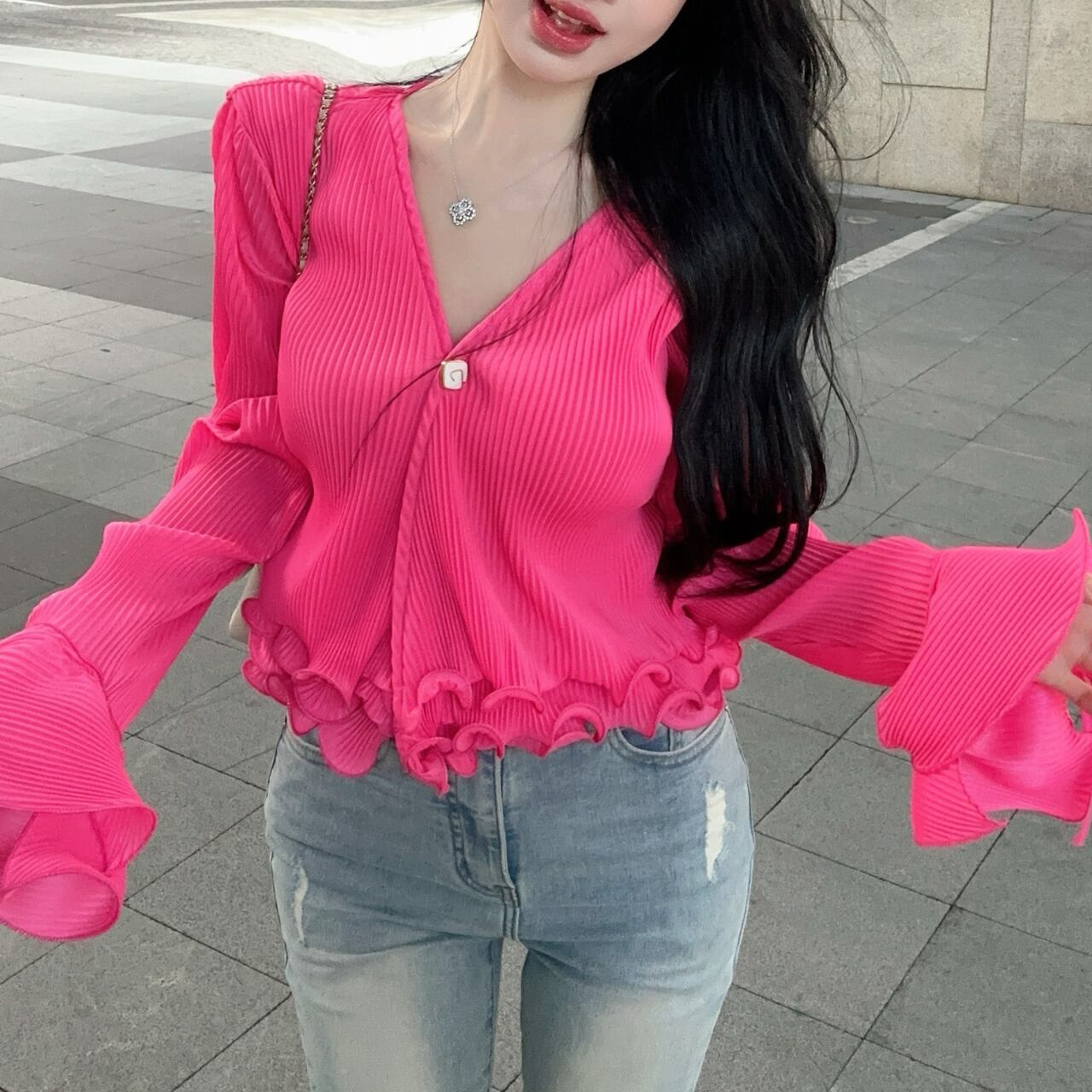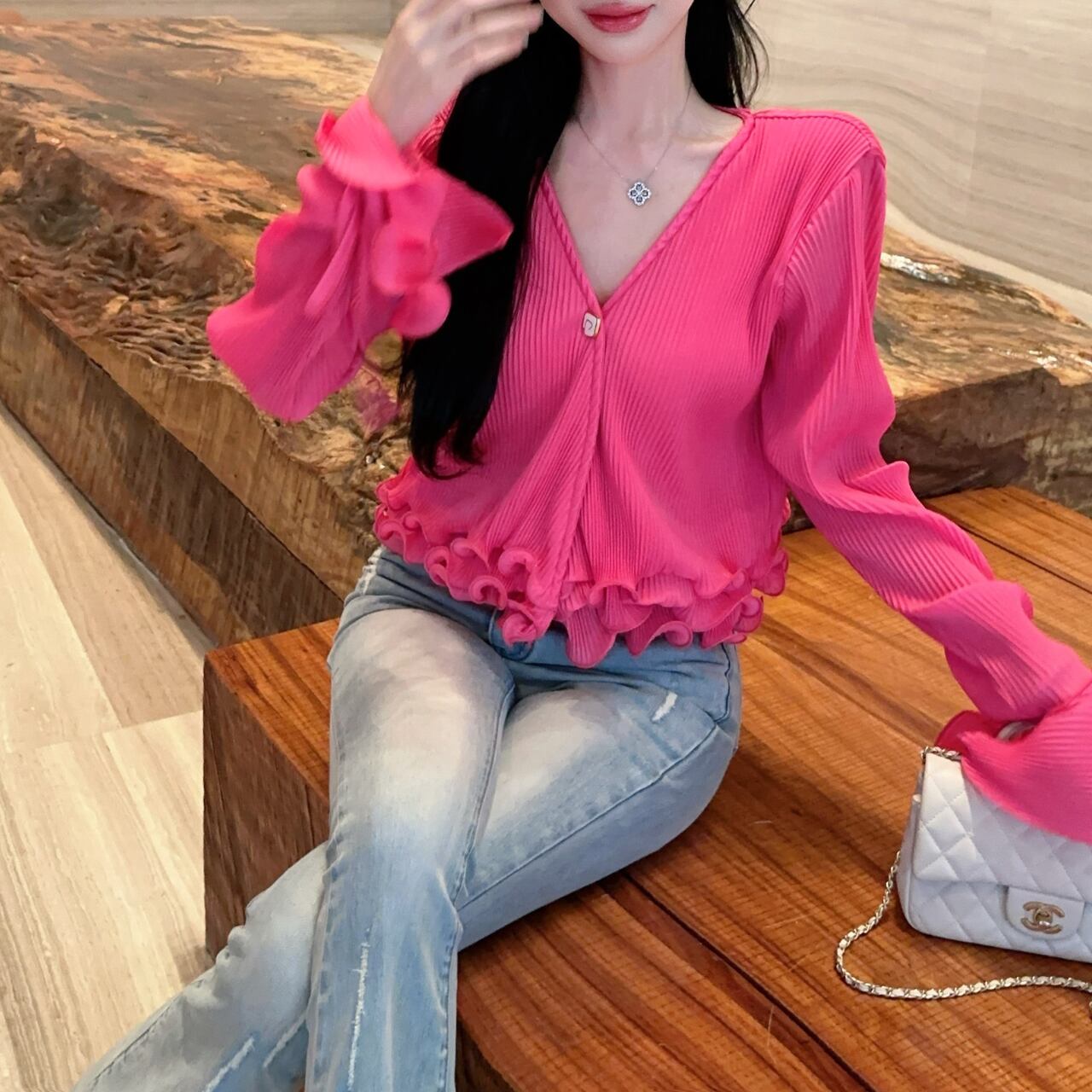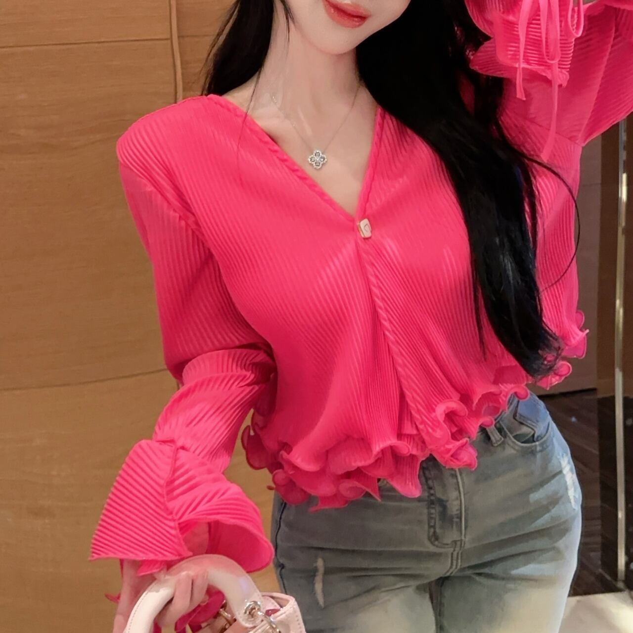 Vネックデザインと裾に女性らしいシルエットを演出しています。特に袖口の波打つフリルディテールがエレガントなアクセントとなり、手元を美しく見せてくれます。裾のフリルと合わせて、シンプルながらも印象的なデザインに仕上がっています。